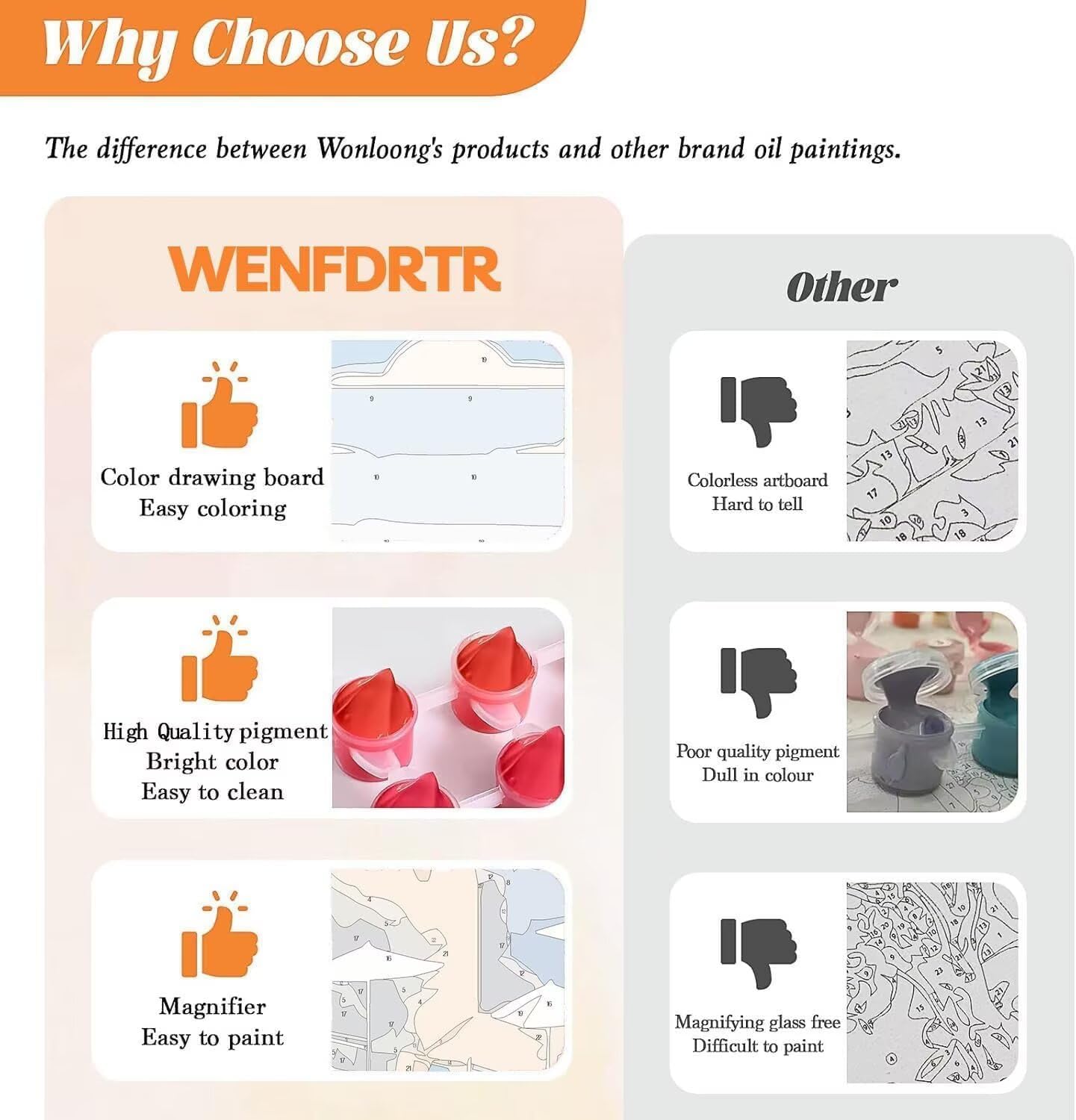 PITTURA FAI DA TE CON I NUMERI PER ADULTI: la pittura fai-da-te con i numeri è molto adatta per i principianti. Dipingere con i numeri per adulti non richiede una base di pittura e puoi iniziare a dipingere la tua opera d'arte non appena apri la confezione. Molto semplice e interessante, dipingere con i numeri è un grande hobby. FACILE DA VERNICIARE: i kit di pittura con i numeri includono 3 diverse dimensioni di pennelli di alta qualità per aree grandi o piccole per dipingere facilmente linee e dettagli super sottili. Non sono richieste abilità speciali oltre a sapere come tenere un pennello e seguire le nostre istruzioni facili da usare (non è nemmeno necessario mescolare i colori da soli!) DIPINGERE CON I NUMERI DECORA LA TUA CASA: Dipingere con i numeri per adulti è il kit fai-da-te perfetto come regalo per la decorazione della casa, come opera d'arte colorata sulla tua parete e può anche essere la migliore scelta regalo per i tuoi amici o la tua famiglia. Inizia subito questo divertente progetto! ATTIVITÀ ORALE PERFETTA: può alleviare lo stress, aiuta a stare lontano dalle radiazioni di giochi ed elettronica, è un buon giocattolo educativo per i bambini. Una buona scelta per aiutare i tuoi bambini a migliorare la coordinazione dei colori. Una volta completati, provano un senso di realizzazione che fa bene alla loro intelligenza e fiducia in se stessi. SERVIZIO CLIENTI: Se avete domande, vi preghiamo di contattarci via e-mail il prima possibile. Ti risponderemo entro 24 ore, quindi non preoccuparti.