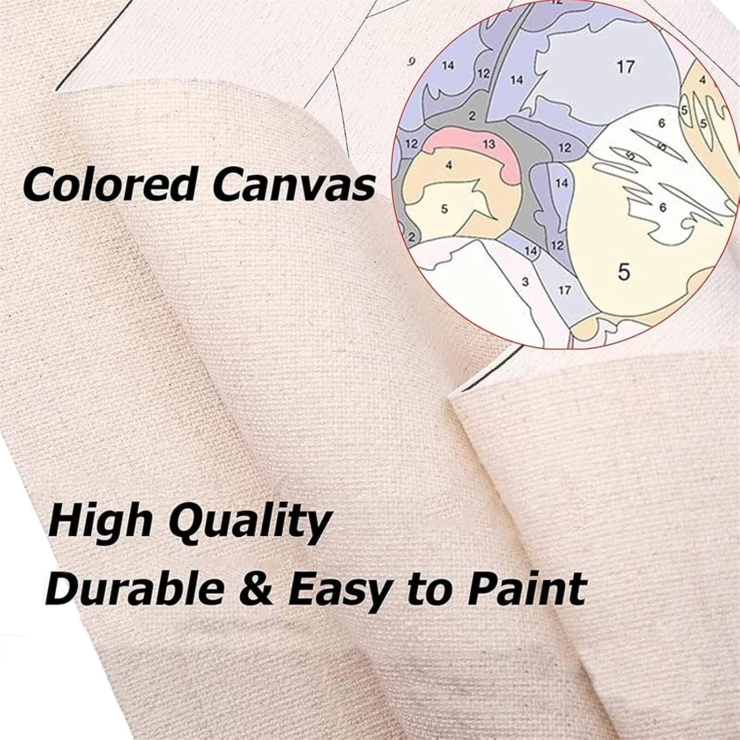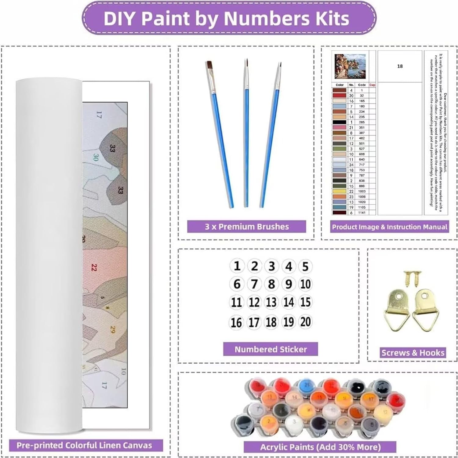 【KIT DIPINGERE CON I NUMERI】: Il kit contiene tutto il necessario, quindi non è necessario acquistare strumenti aggiuntivi, basta solo dipingere su tela. 1 set di colori acrilici, 1 tela prestampata, 3 pennelli di alta qualità, 1 copia cartacea della tela numerata come riferimento e 2 ganci 【MATERIALI DI ALTA QUALITÀ】: Il kit dipingi con i numeri per adulti utilizza pigmenti appositamente progettati. I colori acrilici sono facili da colorare e prevengono lo sbiadimento. L'elevato potere coprente del pigmento consente di sovrapporre i colori esistenti senza perderne la vividezza 【FACILE DA DIPINGERE】: Ogni kit dipingi con i numeri è progettato con sezioni chiare e numerate e colori corrispondenti. Non è necessario avere grandi capacità pittoriche. Basta applicare la vernice corrispondente sul numero corrispondente alla tela, ideale per adulti e principianti 【PERFETTO PER ARREDAMENTO E REGALI】: Crea splendide opere d'arte che possono essere esposte con orgoglio in casa o regalate con cura. L'opera finita può essere incorniciata e appesa, aggiungendo un tocco personalizzato al tuo soggiorno, camera da letto o ufficio. È anche un riconoscimento del tuo impegno e della tua creatività 【SODDISFAZIONE DEL CLIENTE GARANTITA】: Garantiamo la qualità dei nostri prodotti e la tua soddisfazione. Dopo aver ricevuto il prodotto, se non sei soddisfatto del motivo, del colore o del pennello, ti preghiamo di contattarci via e-mail il prima possibile. Ci impegniamo a rendere il tuo percorso creativo piacevole e senza intoppi