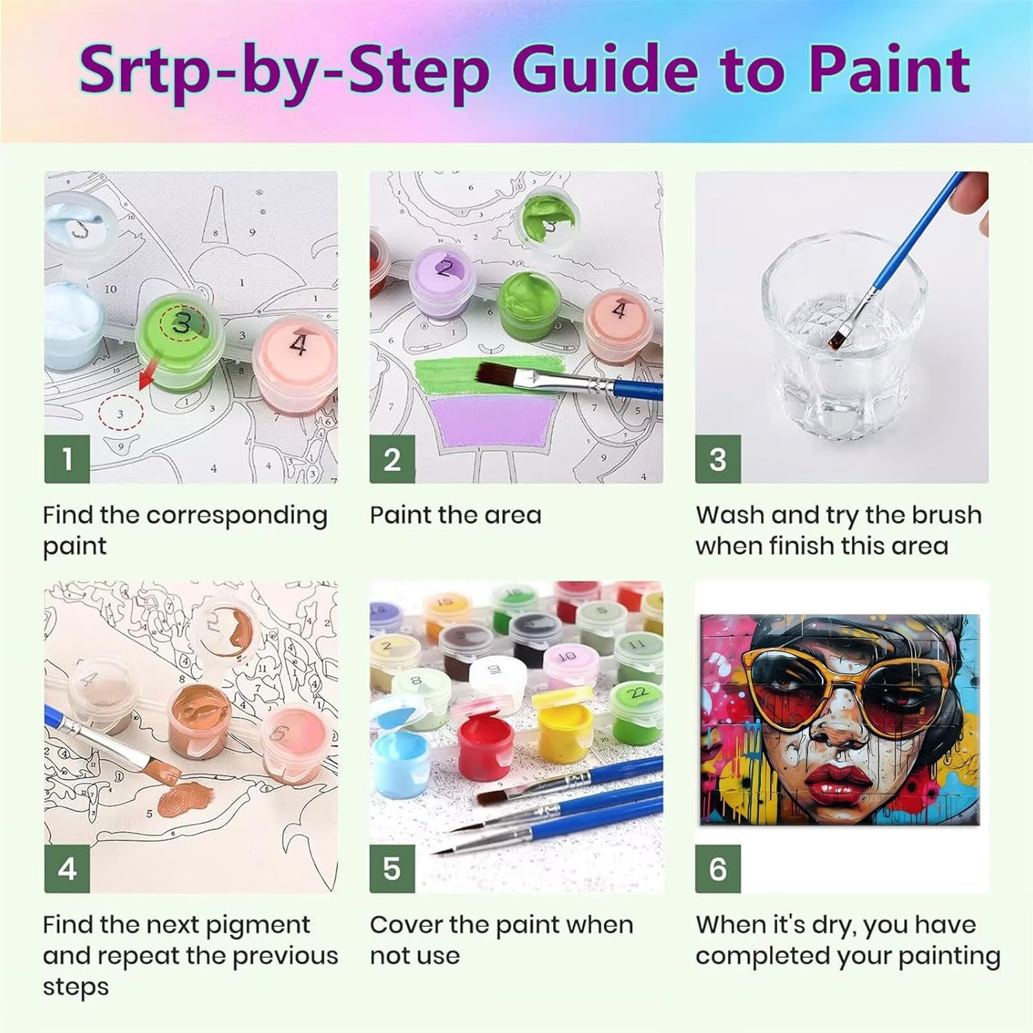 【IL PACCHETTO DIPINGI CON I NUMERI INCLUDE】: I kit dipingi con i numeri includono 1 immagine su tela idrorepellente e antipiega con numeri grandi stampati ad alta risoluzione, tre pennelli, un set completo di colori acrilici e due set di viti e ganci metallici per appendere 【NESSUNA MISCELAZIONE DI VERNICE】: Questa pittura per adulti con i numeri utilizza pigmenti acrilici sicuri, può essere colorata direttamente, non è necessario aggiungere acqua per la miscelazione. Se hai usato accidentalmente il colore sbagliato, coprilo semplicemente con il pigmento del colore giusto 【KIT DIPINGI CON I NUMERI PER ADULTI】: Ideale per principianti senza esperienza di disegno per creare facilmente opere d'arte classiche. Goditi il ​​processo fai da te e la soddisfazione di completare un elegante dipinto a olio 【CREA IL TUO DIPINTO】: La pittura fai da te con i numeri per adulti è facile e divertente. Grazie a istruzioni facili da capire, i set di pittura con i numeri finiscono di dipingere splendide opere. Chiunque può completare un'opera d'arte squisita in modo indipendente, il che è un kit di pittura con i numeri molto adatto per principianti adulti 【ASSISTENZA CLIENTI DEDICATA】: forniamo un'assistenza clienti dedicata per la nostra pittura con i numeri per adulti. Se riscontri problemi, il nostro team è qui per aiutarti. Scegli la nostra pittura con i numeri per adulti con fiducia, sapendo che ci impegniamo per la tua soddisfazione