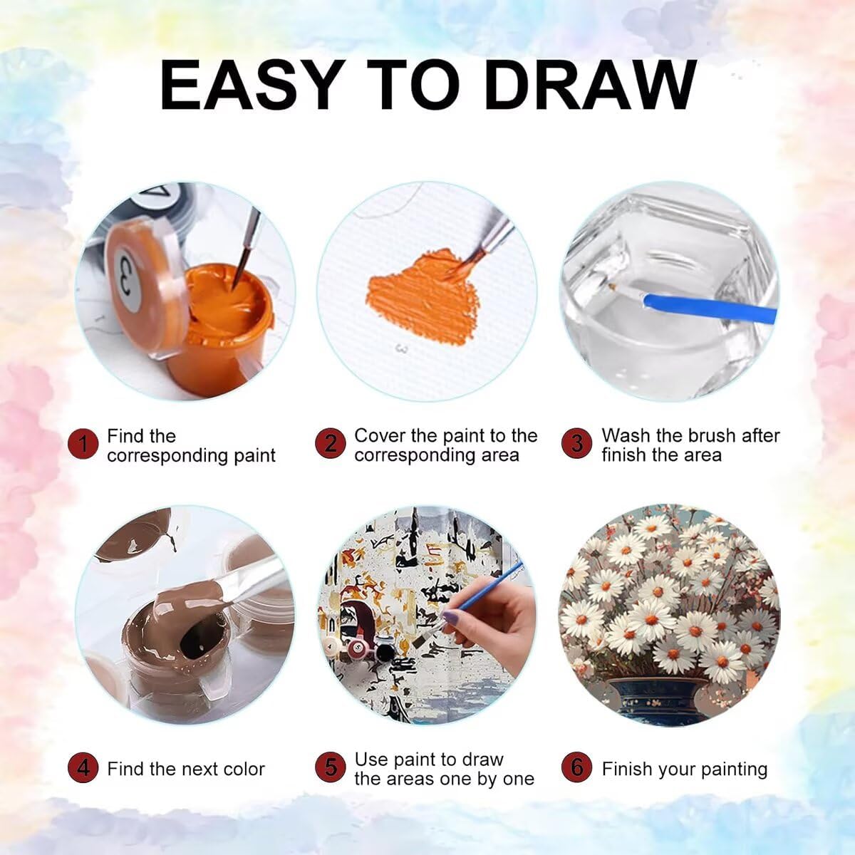 Caratteristiche: È il primo passo perfetto per i principianti che vogliono divertirsi con la pittura. Applica semplicemente i colori numerati negli spazi vuoti con lo stesso numero sulla tela per creare il tuo capolavoro. Questo superbo kit per dipingere con i numeri può anche essere incorniciato per creare un fantastico quadro per la tua parete. Imballaggio della vernice Utilizziamo imballaggi sottovuoto per garantire che la vernice non si secchi facilmente. Suggerimenti: Quando non in uso, ricordati di chiudere prontamente il coperchio. Passaggi fai da: 1. Apri la scatola e controlla lo strumento Dipingi con i numeri. 2. Controlla il colore della vernice e l'ordine dei numeri disposti sul dipinto a olio. 3. Scopri la tela, vedrai molti simboli corrispondenti ai numeri dei colori. 4. Riempi le aree contrassegnate con i numeri con la vernice corrispondente. (Per un comodo fai da te, aggiungi una piccola quantità di acqua alla vernice) 5. Si consiglia di dipingere un gruppo di colori alla volta, il che può essere completato più velocemente. 6. Per creare un dipinto con i numeri, si consiglia di mettere insieme i disegni quando si dipinge e dipingere tutte le aree colorate. Contenuto della confezione: colori acrilici tele (senza cornice) pennello ganci Migliora l'abilità pratica dei bambini Dipingere con i numeri può migliorare la percezione, l'immaginazione e la creatività dei bambini, ecc, renderli più concentrati e sicuri. Per quanto riguarda l'uso della vernice: La nostra vernice è sufficiente per completare l'intera tela. Se ti ritrovi a corto di vernice, contattaci e risolveremo il problema per te