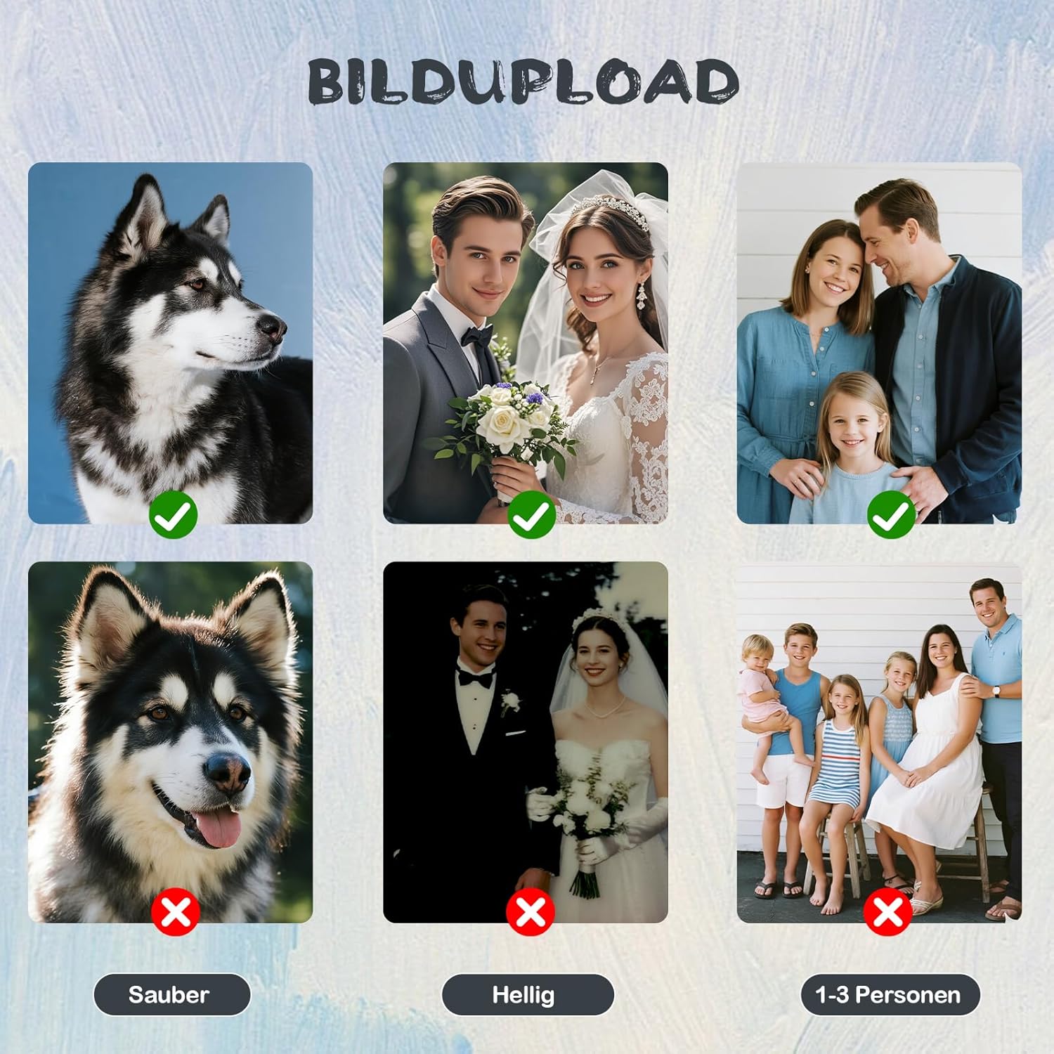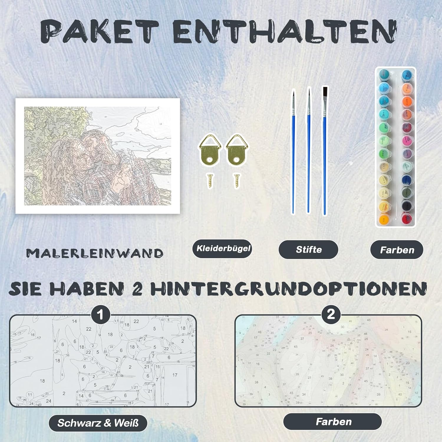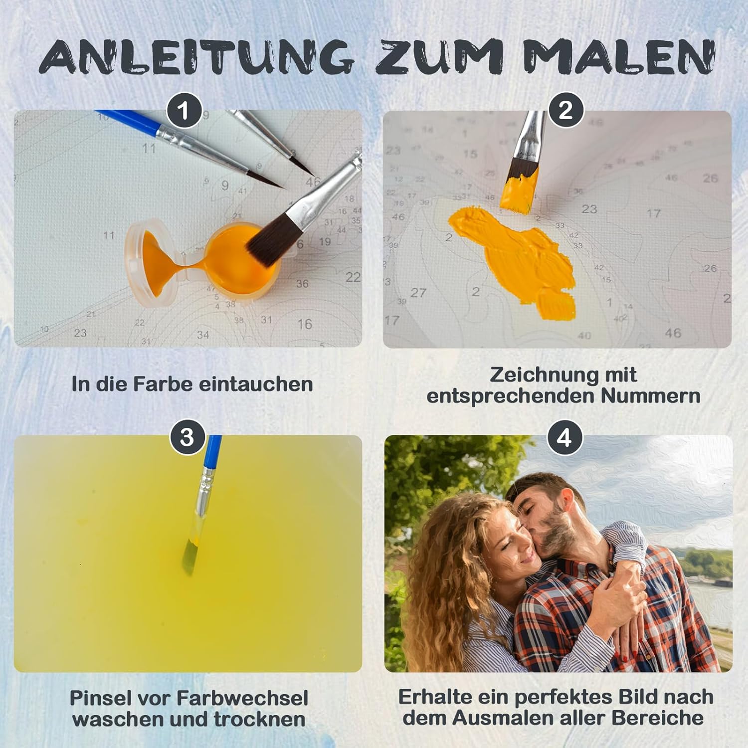 🎨 Crea il tuo capolavoro: con il nostro set di immagini per dipingere con i numeri puoi trasformare le tue foto più belle in un'opera d'arte personale! Carica semplicemente la foto ad alta risoluzione della tua famiglia, del tuo animale domestico o delle vacanze e crea il tuo capolavoro personalizzato di pittura con i numeri. Questo set fai-da-te è adatto a tutti i livelli di abilità e ti consente di creare facilmente il tuo dipinto. 💖 Dipingere non è mai stato così facile: nessuna conoscenza precedente? Nessun problema! Con il nostro kit personalizzato per dipingere con i numeri per adulti, ogni immagine sarà un successo. La tela prestampata con campi trasparenti e numerati e i brillanti colori acrilici rendono la colorazione un gioco da ragazzi: ideale per principianti ed esperti. 🖼️ Decorazione perfetta per la tua casa: il tuo dipinto con i numeri finito diventerà un'attrazione unica in soggiorno, camera da letto o ufficio. Con il nostro kit personalizzato di pittura con i numeri per adulti, puoi trasformare i ricordi in una vivace opera d'arte dipinta a mano. Questo kit fai da te per dipingere con i numeri è l'ideale per principianti ed artisti esperti che vogliono rallegrare la propria casa con un tocco personale. 🎁Il miglior regalo personale: stai cercando un regalo con un significato reale? Il nostro set personalizzato di pittura con i numeri è ideale per compleanni, anniversari, Natale o San Valentino. È perfetto per partner, genitori, figli o amici. Con questo dipinto fai da te con i numeri per adulti, puoi trasformare ricordi preziosi in un'opera d'arte unica: un regalo duraturo e personale che viene dal cuore. 💯 Supporto migliorato: il nostro set di pittura per numero contiene tutto ciò di cui hai bisogno per la tua esperienza personale di pittura per numero: tela prestampata, colori acrilici di alta qualità, pennelli e grucce. Questo kit personalizzato per dipingere con i numeri è ideale per adulti e principianti. Se hai domande su come dipingere la tua immagine con i numeri, ti garantiamo un aiuto rapido: una risposta in 24 ore!
