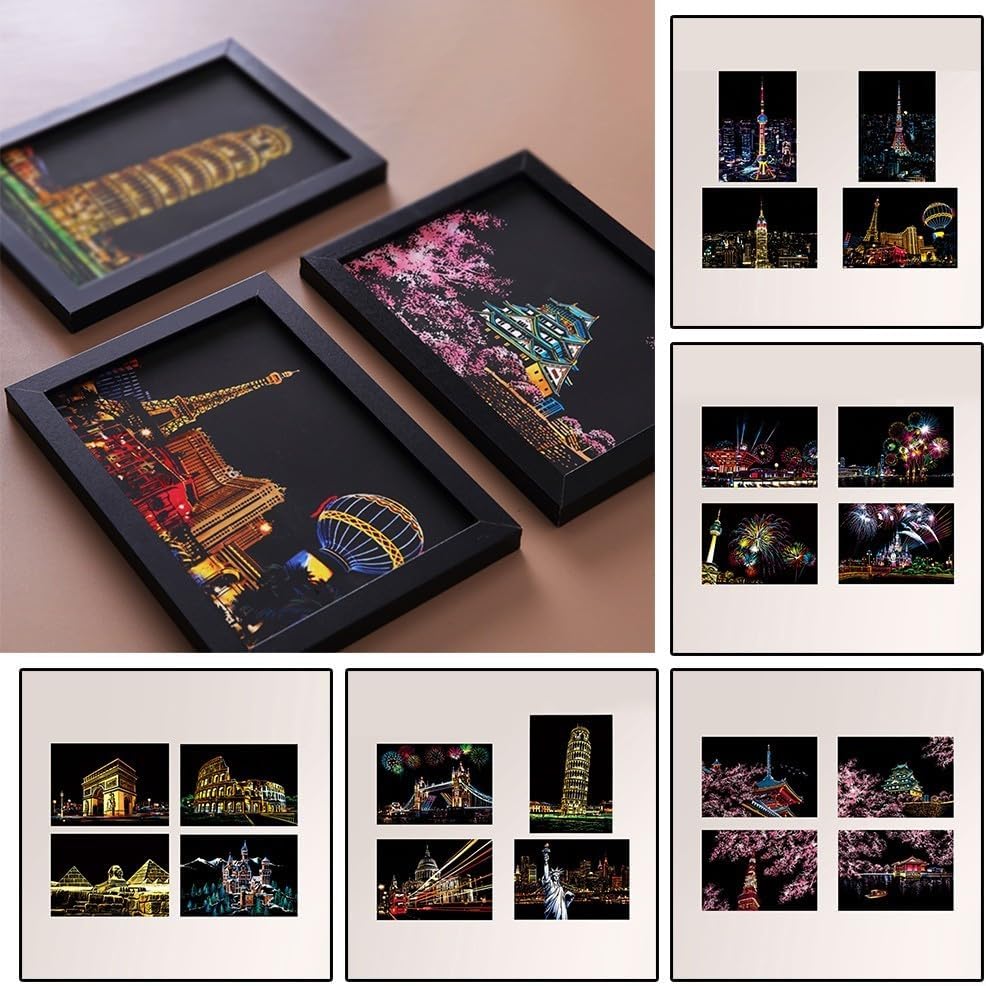 Sviluppa la creatività: il set di 4 quadri per graffi fai da te per bambini è fantastico per sviluppare l'interesse dei bambini per la pittura e ispirare la loro creatività. Possono dipingere insieme a genitori e amici, favorendo il legame e il godimento del tempo trascorso insieme. Pazienza e attenzione: questi dipinti da grattare richiedono pazienza e attenzione ai dettagli, promuovendo lo sviluppo di queste importanti abilità nei bambini. Grattando il , possono rivelare disegni colorati edifici vista notturna della città, che aggiunge eccitazione al processo. Attività interattiva: dipingere questi dipinti da grattare può essere un'attività interattiva tra bambini e genitori o amici. Offre l'opportunità di impegnarsi in un'esperienza creativa condivisa, rafforzare le relazioni e creare ricordi duraturi. Utilizzo: una volta terminato, i dipinti antigraffio possono essere utilizzati come decorazione per la casa. Possono essere esposti su pareti o incorniciati, aggiungendo un tocco di fascino artistico a qualsiasi spazio abitativo. Materiale di qualità: realizzati in cartone, i dipinti antigraffio sono pratici da usare. La dimensione di ogni dipinto è di circa 20 x 14 cm, fornendo spazio sufficiente per i bambini per liberare la loro creatività.