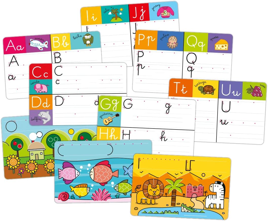 Praticano i primi colpi e impareranno a scrivere le prime lettere maiuscole e minuscole e alcune parole in modo semplice e divertente Sistema autocorrettivo: attraverso la base con luce che ha il banco possono verificare se stanno eseguendo il tratto corretto All'interno del banco valigetta è possibile riporre le lamelle nello scomparto, trasportarlo e disegnarlo sopra Contenuto della confezione: bacino con valigetta luminosa; 21 fogli cancellabili; 1 pennarello in pile e 1 spugna per cancellare; il prodotto necessita di batterie, non sono incluse; il tipo di batterie necessarie sono: 3 x LR14