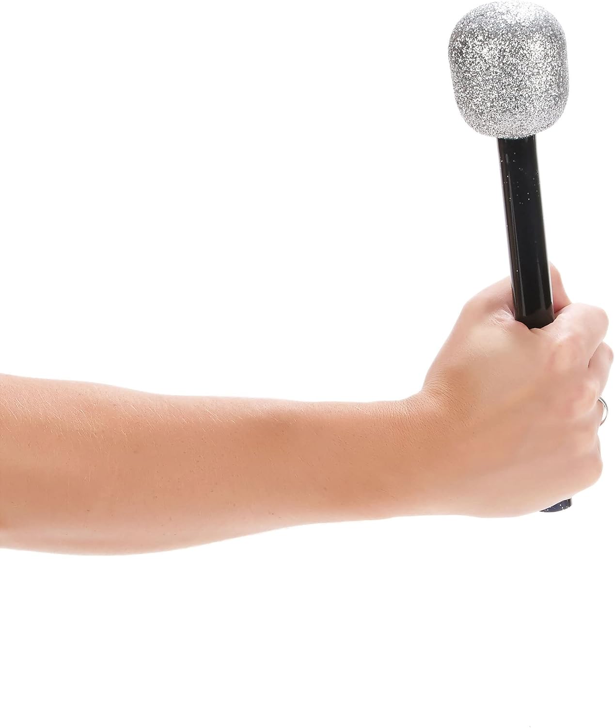 Questo microfono è realizzato in plastica e misura circa 25 cm di lunghezza. L'impugnatura è di colore nero e l'estremità del microfono è ricoperta di glitter argentati. Questo accessorio sarà ideale per completare il vostro costume da pop star durante le vostre serate in discoteca. Questo prodotto è solo un accessorio per travestimento.