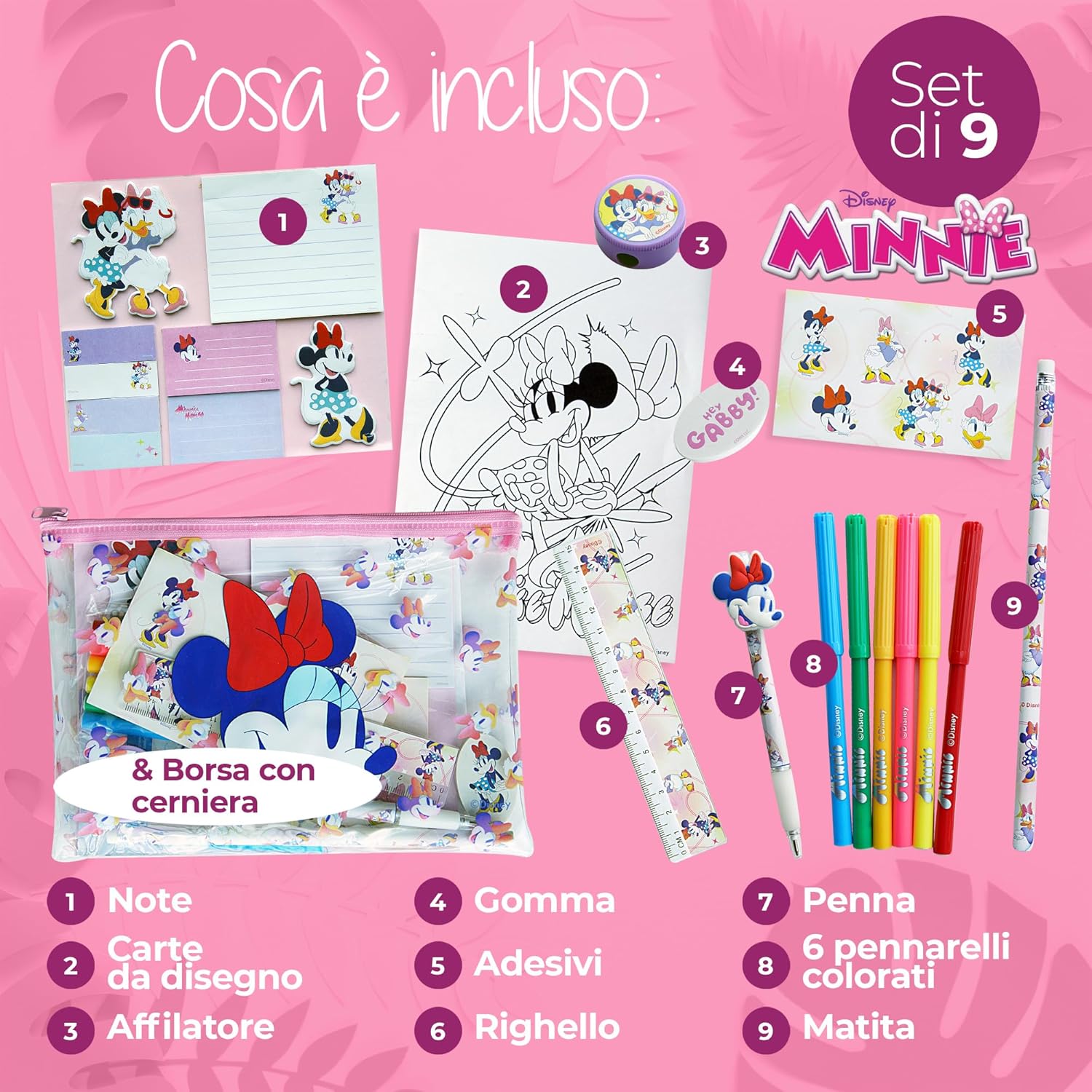 Design Iconico di Minnie Mouse – Questa cancelleria Minnie Mouse porta il fascino della dolce Minnie direttamente sulla tua scrivania. Perfetta per chi adora l’eleganza e la simpatia del personaggio più amato di Disney, rendendo speciale ogni momento di studio. Set Completo di Gadget Minnie – Dotato di vari oggetti Minnie come penne, pennarelli e adesivi, questo set offre tutto il necessario per scrivere, colorare e decorare in puro stile Minnie, aggiungendo un tocco di magia Disney. Qualità e Durata Garantite – Gli oggetti di Minnie sono realizzati con materiali di alta qualità, resistenti e adatti all’uso quotidiano. Pratici e belli, accompagnano ogni momento creativo, sia a scuola che a casa. Un Regalo Perfetto per i Fan di Minnie Mouse – Questo set di cose di Minnie è l’idea regalo ideale per ogni amante di Disney, piccoli o grandi. Unisce funzionalità e divertimento per uno studio pieno di stile e fantasia. Organizzazione e Stile – Tieni tutto in ordine con questo set di cancelleria Minnie Mouse. Pratico e compatto, permette di avere sempre a portata di mano penne e accessori, mostrando il tuo amore per Minnie in ogni momento!