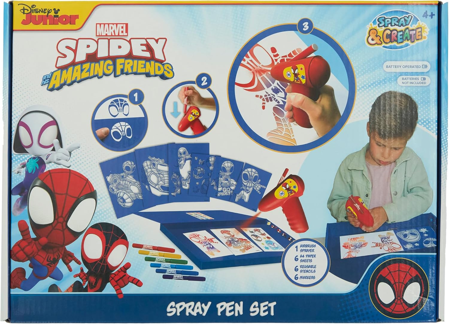 Set da 19 pezzi con penna spray a cartuccia: questo set di penne spray Spidey è composto da 19 pezzi: 1 aerografo spray, 6 matite colorate e 6 diversi stencil e 6 fogli A4