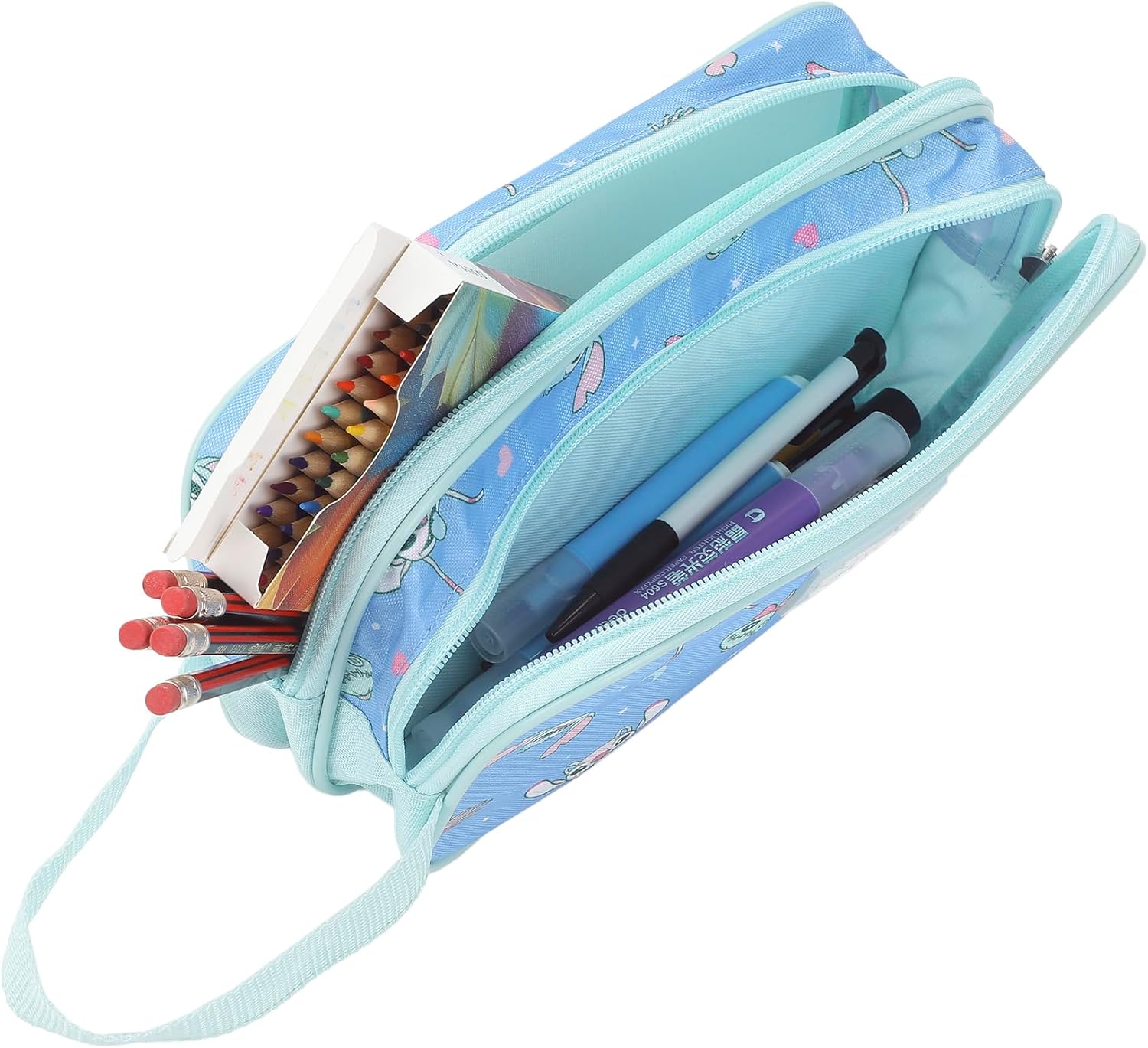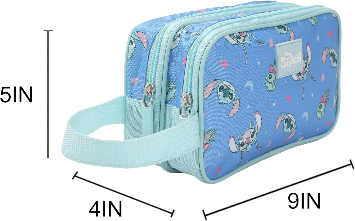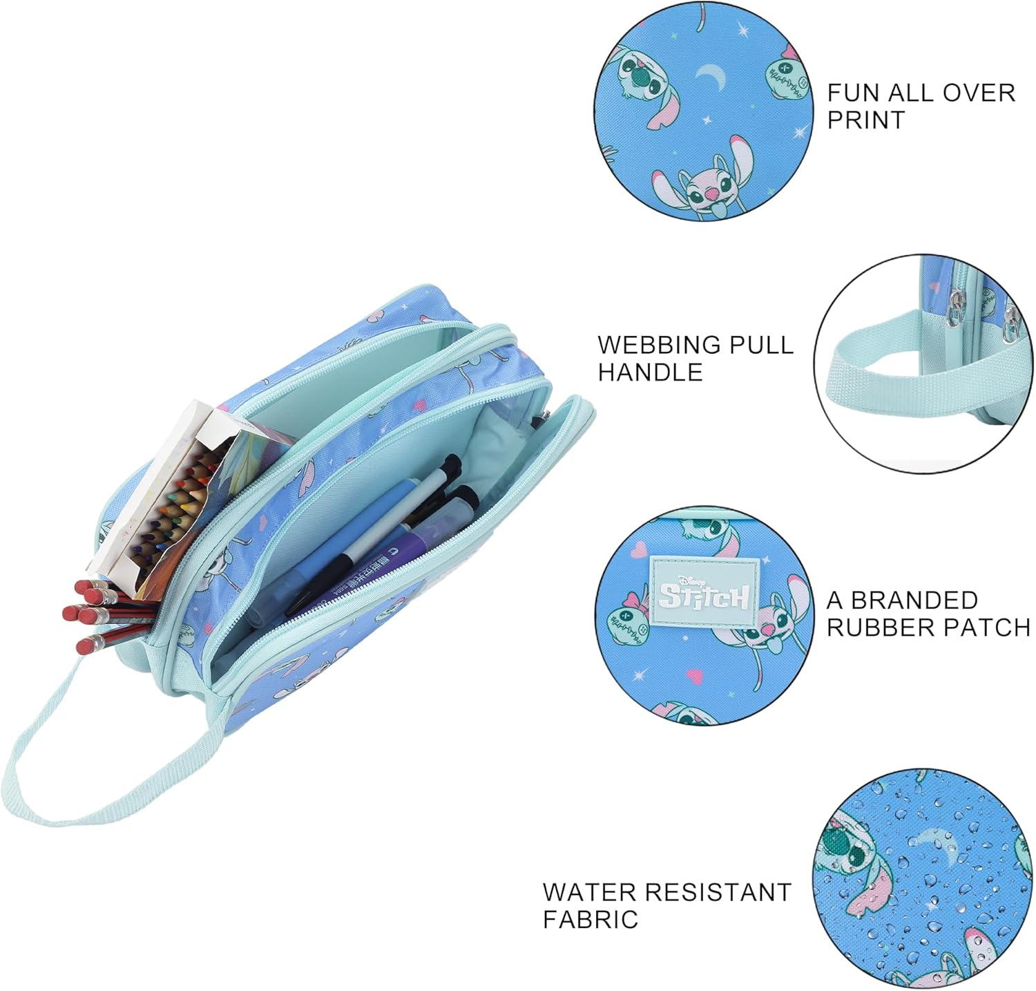 Design personalizzato: un'adorabile aggiunta ai tuoi accessori scolastici, questo astuccio Disney presenta una stampa all-over luminosa e colorata di Stitch che rende tutti i tipi di volti! Maniglia a cinghia: la maniglia mantiene tutte le tue forniture al sicuro, rendendo facile l'apertura e la chiusura per chiunque. Rimani organizzato: con le sue dimensioni 22,9 x 12,7 x 10,2 cm e due scomparti separati, questo astuccio rende facile riporre matite, penne, pastelli, gomme, righelli, calcolatrici e qualsiasi altra cosa di cui hai bisogno per la scuola Durevole: realizzato in poliestere e fettuccia di alta qualità, questo astuccio a doppio scomparto è resistente all'acqua e durevole come viene! Istruzioni per la cura: per mantenere l'aspetto e le prestazioni migliori del tuo astuccio, basta pulirlo con un panno umido se necessario.