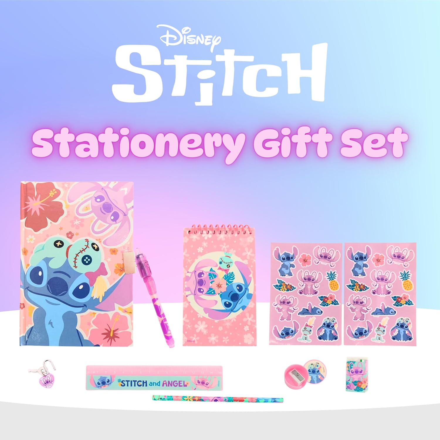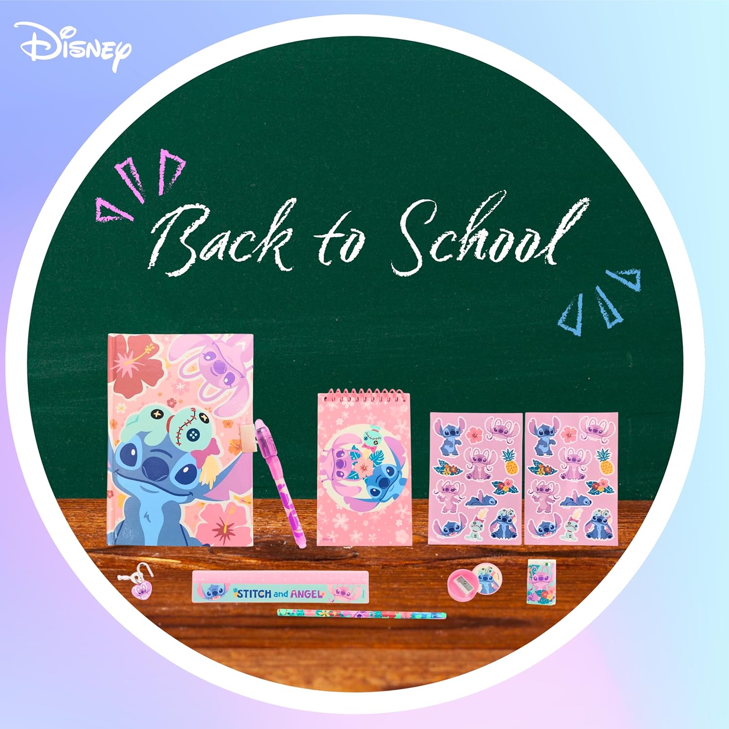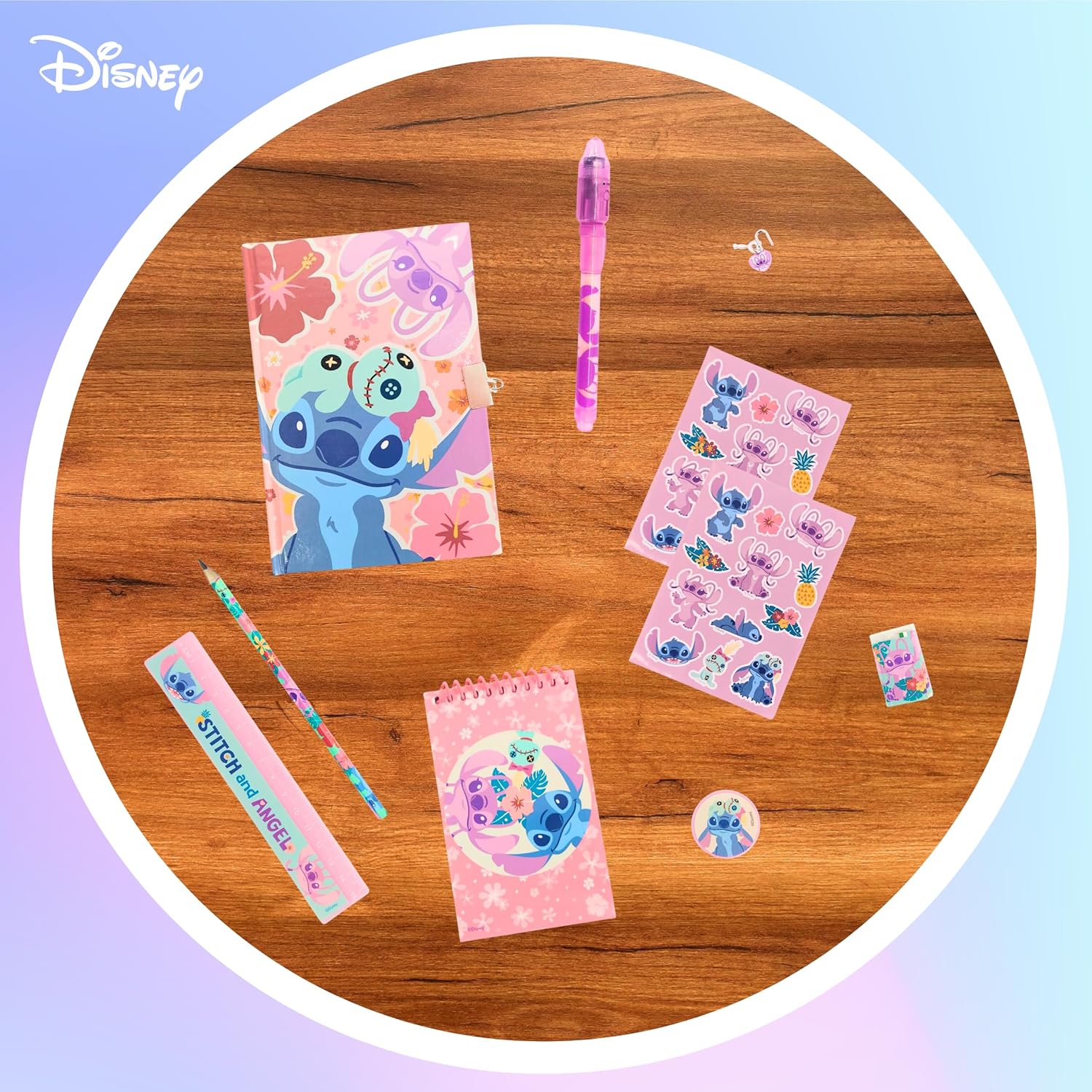 Disney Stitch Set di Cancelleria, Include Righello, Matita, Penna, Adesivi, Gomma, Temperino, Quaderno e Lucchetto con Chiavi, Set di Cancelleria Regalo per Ragazze