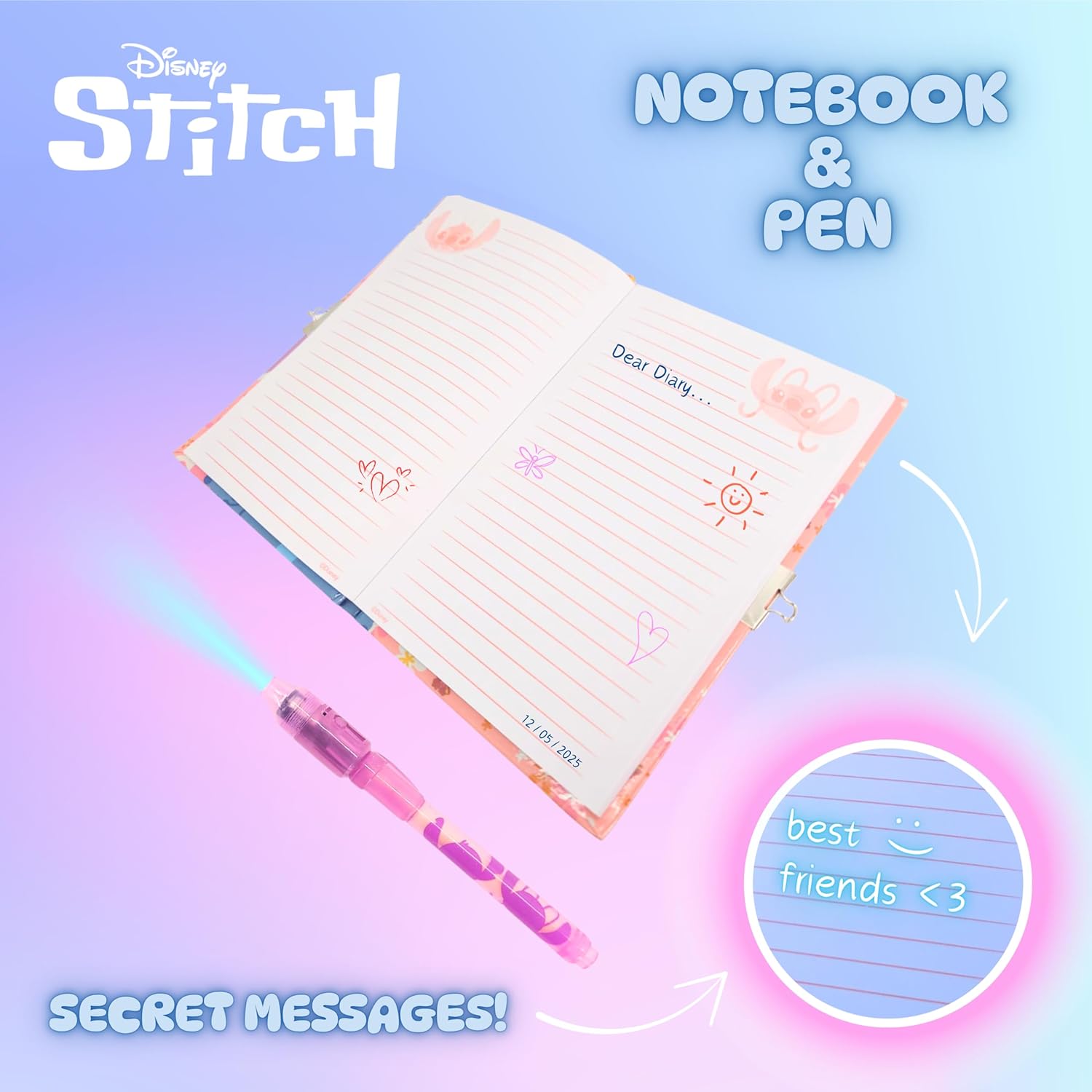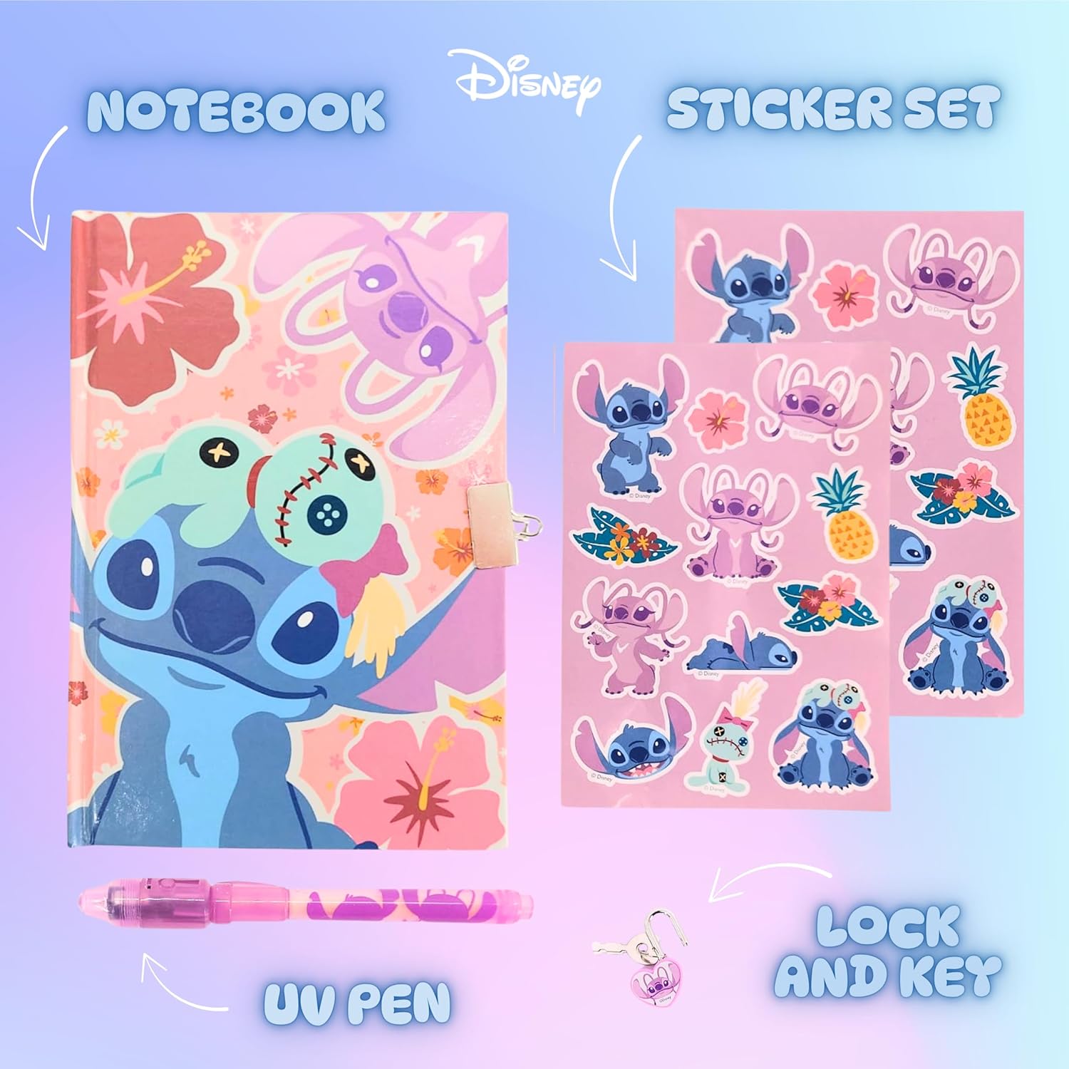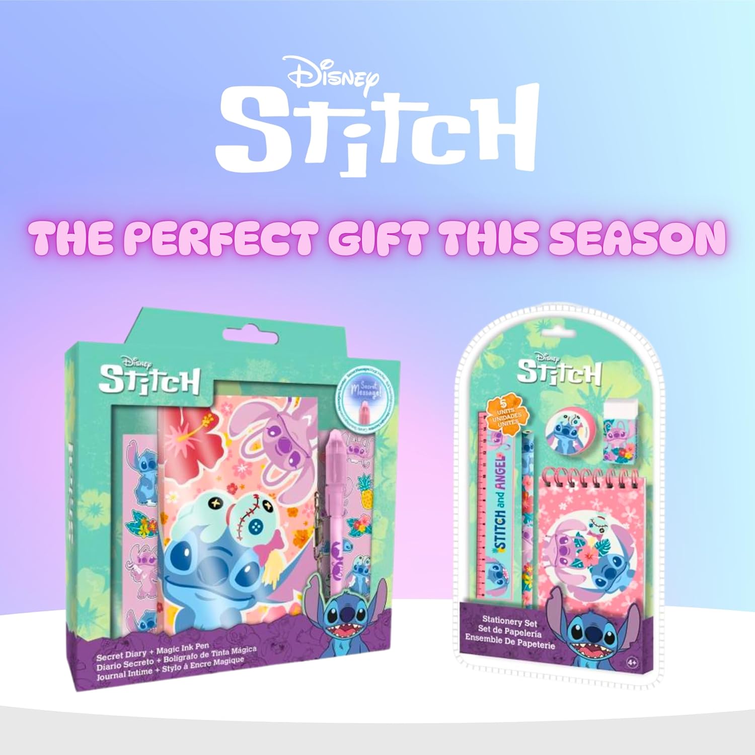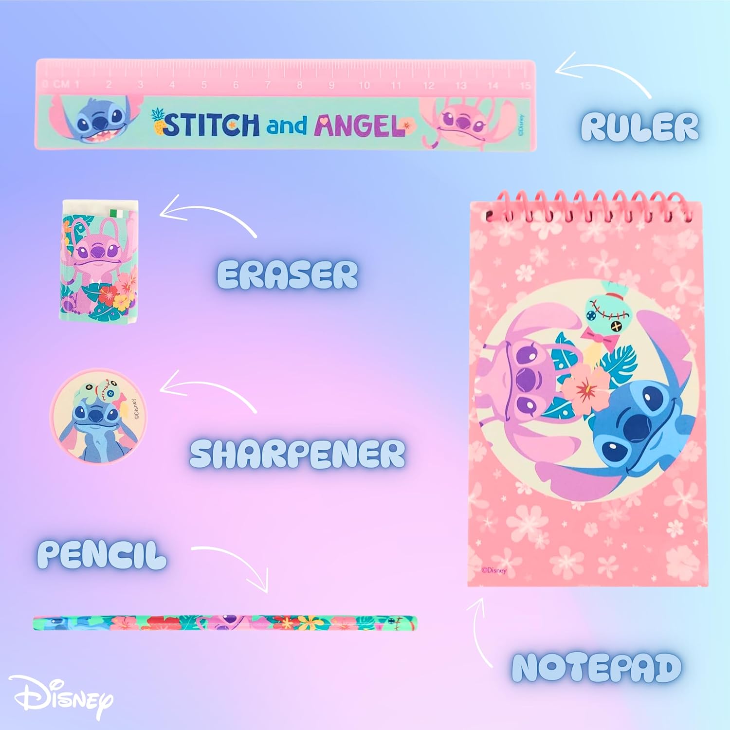 Disney Stitch Set di Cancelleria, Include Righello, Matita, Penna, Adesivi, Gomma, Temperino, Quaderno e Lucchetto con Chiavi, Set di Cancelleria Regalo per Ragazze