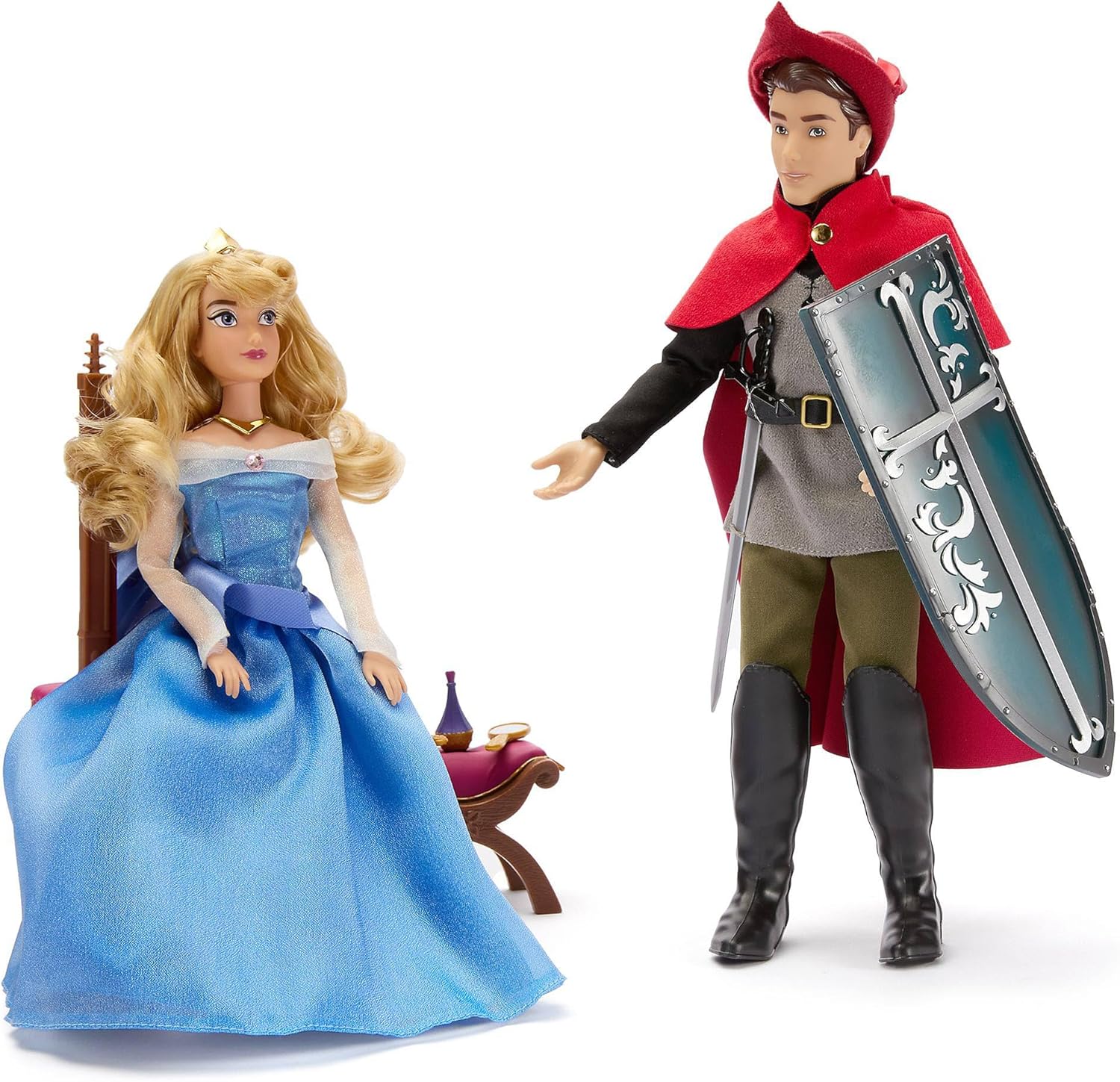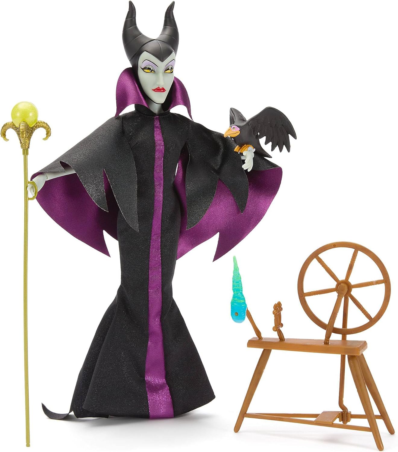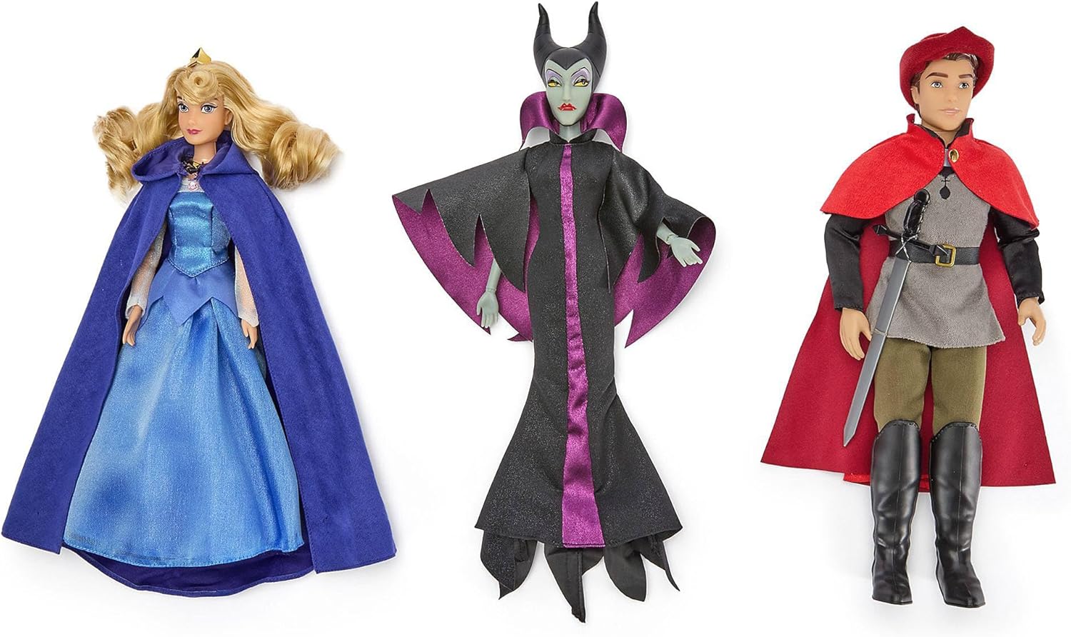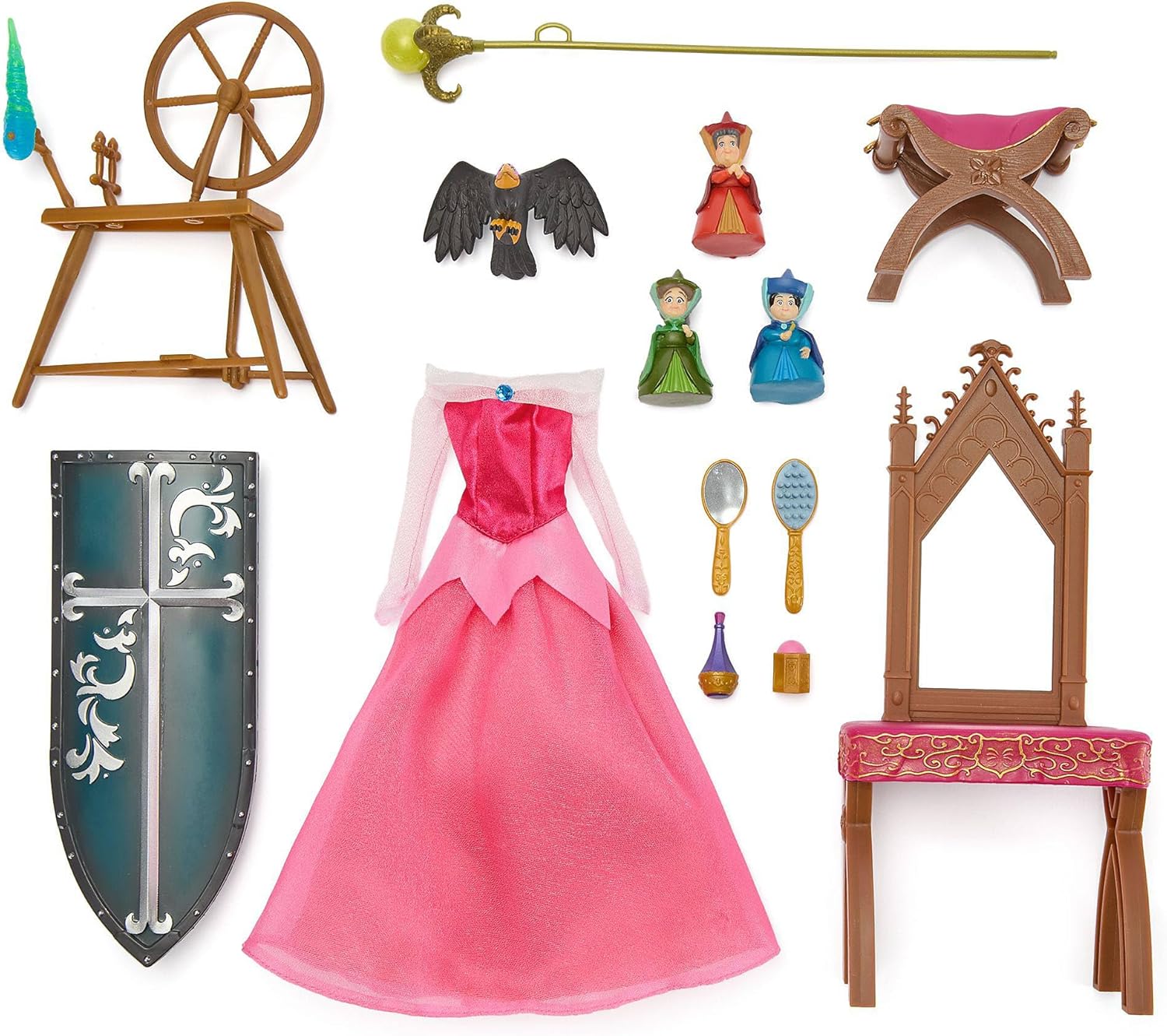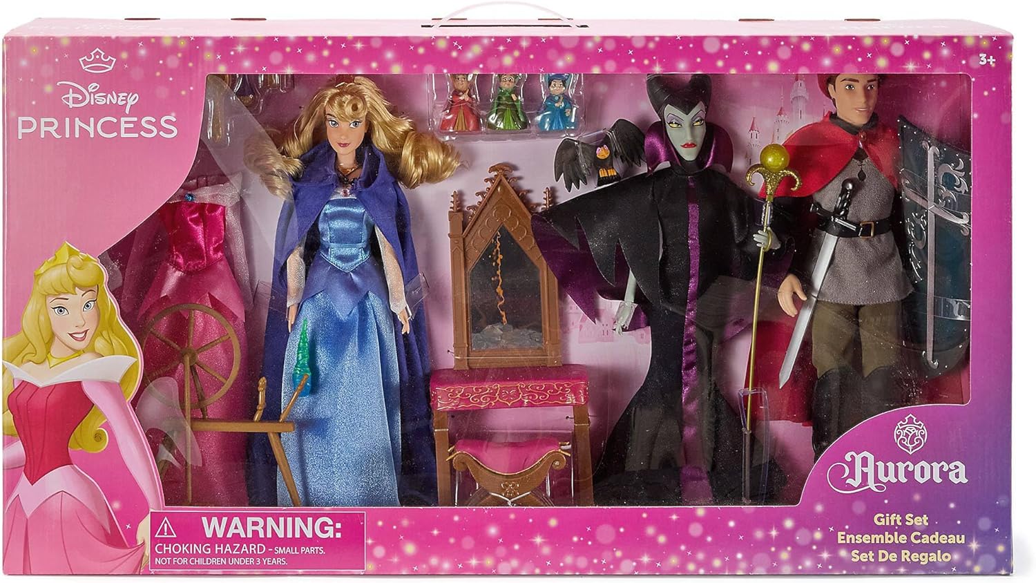 Aurora misura H 28 cm circa Maleficent e Filippo misurano H 32 cm circa Le fatine misurano H 5 cm circa Il Corvo misura L 7,5 cm circa (apertura alare) La toeletta misura H 23 cm circa Il filatoio misura H 15 cm circa Gli accessori misurano fino a H 25,5 cm circa (scettro) La confezione misura H 34 x L 65 x P 14 cm circa Prodotto realizzato in cloruro di polivinile (PVC), poliossimetilene, polipropilene, acrilonitrile-butadiene-stirene (plastica) e poliestere "
