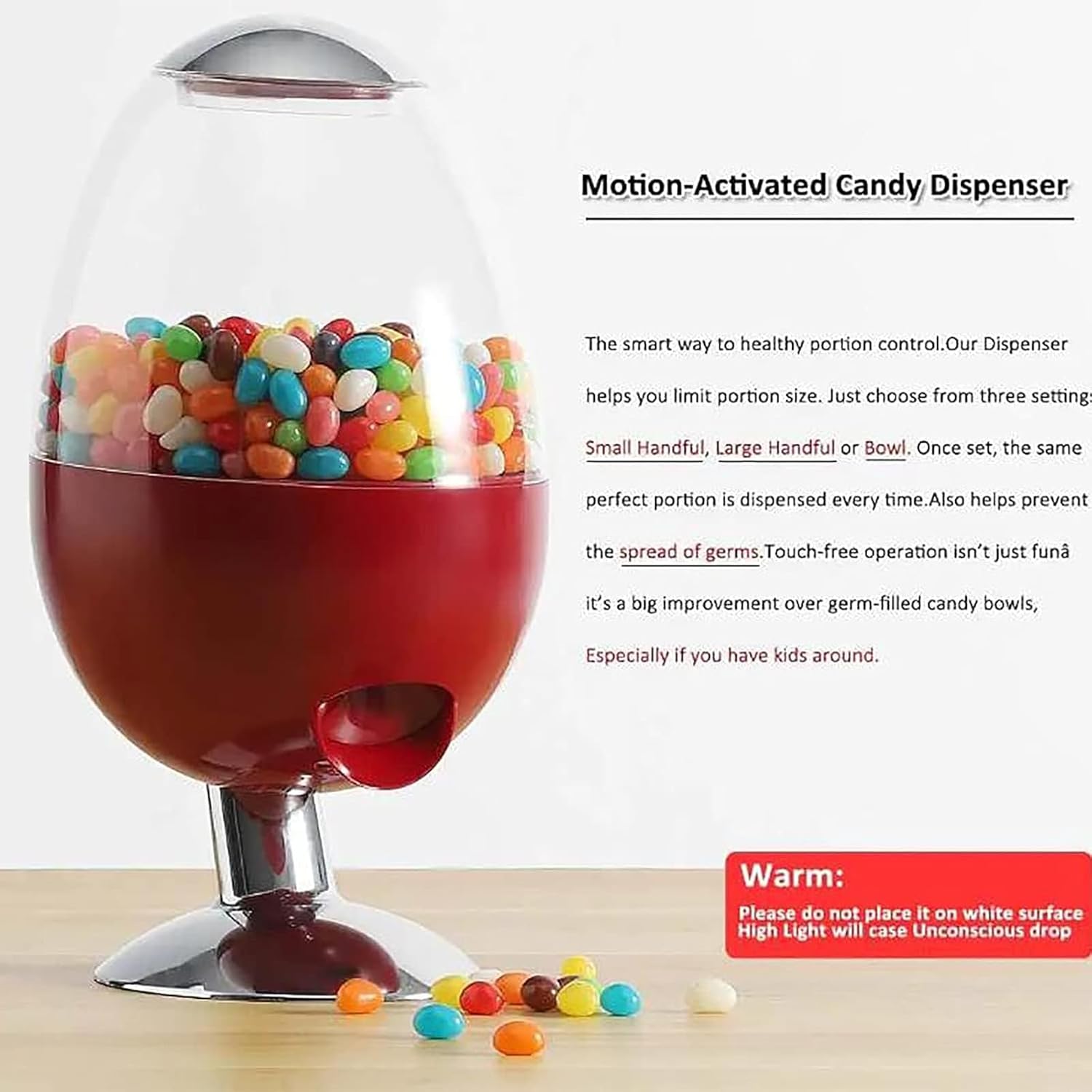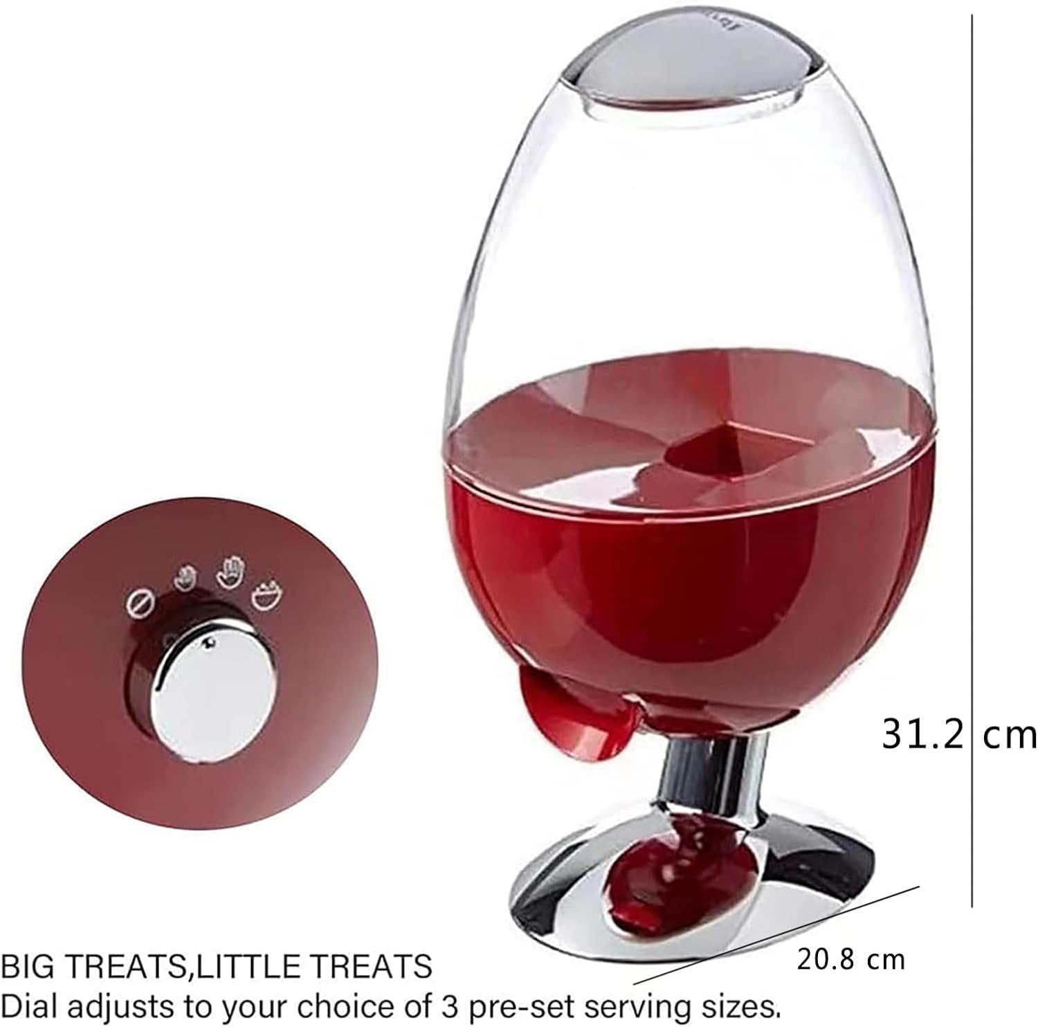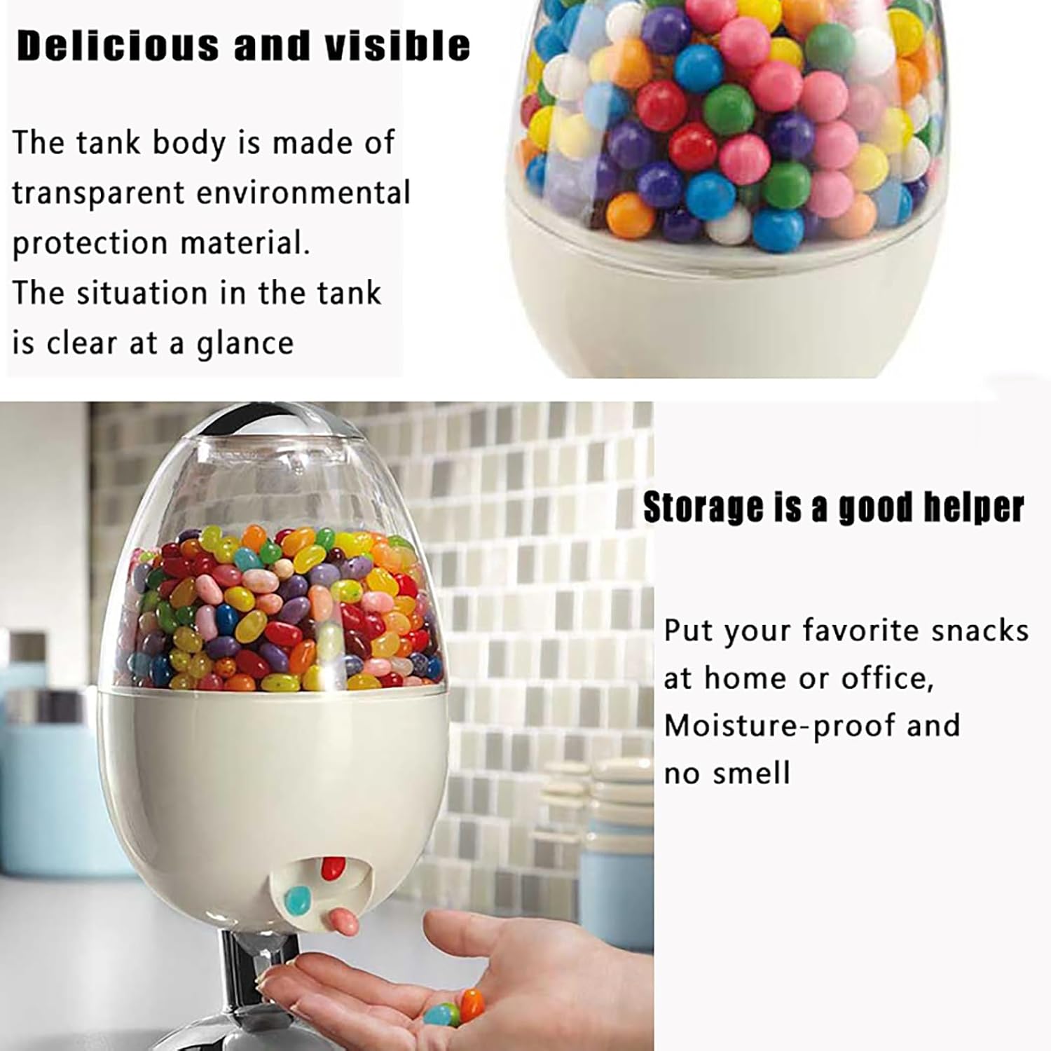 Questo distributore automatico di caramelle memorizza arachidi, gomme da masticare, gelatine e altri snack in barattoli facili da riempire. Basta posizionare la mano o un piatto sotto lo scivolo e agitare per distribuire dolcetti senza sforzo. Caratterizzato da un design elegante unico, il corpo del dispenser è realizzato in materiale acrilico con un aspetto simile a un globo. La sua forma distintiva aggiunge un tocco decorativo divertente a case o uffici, mantenendo accessibili le prelibatezze. Come un affidabile aiuto per la conservazione, questo dispenser è ideale per piccoli oggetti come gomme da masticare, noci sgusciate, cereali o dolcetti secchi per animali domestici. Aiuta a organizzare snack per pause rapide e un uso efficiente. Realizzato in materiale acrilico trasparente e resistente, il dispenser è resistente alla rottura e consente una chiara visibilità del contenuto. Il suo design staccabile garantisce una facile pulizia per igiene e rispetto dell'ambiente. Questa macchina per l'erogazione di caramelle è un regalo ideale per bambini e adulti, perfetta per compleanni, Natale o feste come dolcetto o scherzetto di Halloween. Aggiunge novità e divertimento a qualsiasi celebrazione.