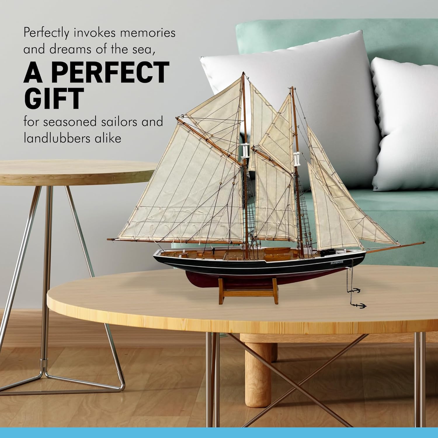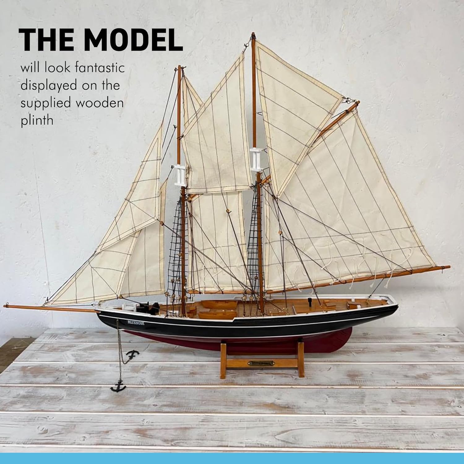 Questo bellissimo modello di esposizione assemblato in legno riccamente dettagliato di BLUENOSE THE FAMOUS CANADIAN FISHING RACING SCHOONER YACHT è semplicemente splendido e sarà un ottimo regalo. Il modello ha uno scafo cavo, costruito interamente in legno, e verniciato con una finitura lucida, mentre sul ponte ci sono DETTAGLI DELEGGERI COME RIGGING BLOCKS, VELE IN COTONE CUCITO, GUNWALES ALZATI E RACCORDI IN OTTONE. Si prega di notare che questo modello è solo a scopo di visualizzazione e non è uno yacht da laghetto. Misura 80 cm, lunghezza 80 cm e altezza 66 cm. Lunghezza 80 cm e altezza 66 cm. Questo modello avrà un aspetto fantastico visualizzato sullo zoccolo in legno fornito, un regalo perfetto per marinai esperti e paesini Bluenose era una goletta canadese da pesca e da corsa della Nuova Scozia costruita nel 1921. Divenne un'icona provinciale per la Nuova Scozia e un importante simbolo canadese negli anni '30. Il nome bluenose ebbe origine come soprannome per i Nova Scotiani già nel XVIII secolo. Lo yacht viene fornito parte assemblata con solo l"albero e il sartiame da completare, ci sono alcune istruzioni di base incluse, tuttavia il sartiame è abbastanza semplice e vedere questo modello di visualizzazione prendere vita è per molte persone parte dell"attrazione.