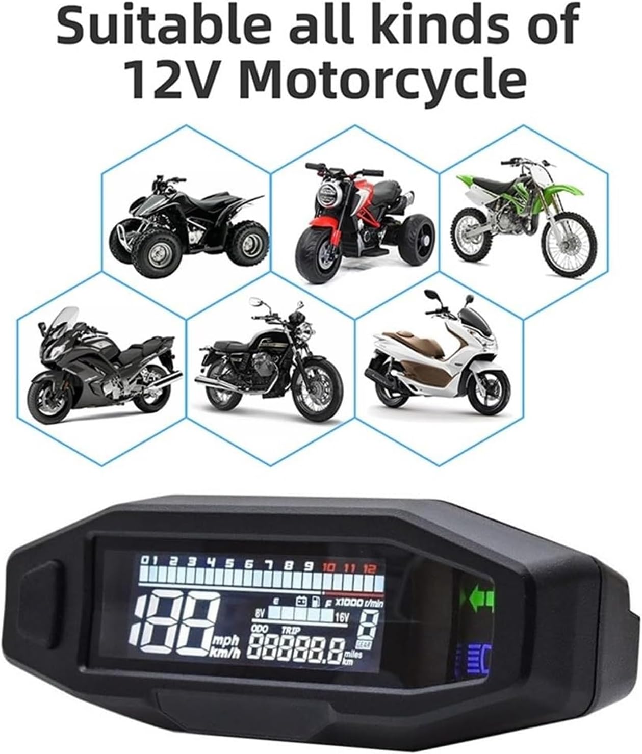 Adatto per un'ampia gamma modelli motociclette, offre ampia applicabilità e funzionalità affidabili per esigenze guida Costruiti in robusta plastica e metallo, questi indicatori velocità per offrono un design vario con visualizzazione velocità, rotazione e marcia per maggiore sicurezza e praticità Viene fornito con istruzioni dettagliate, un cavo per sensori e due magneti dedicati per un'installazione semplice e precisa sulla maggior parte dei modelli Presenta uno schermo LCD da 103x25 mm con retroilluminazione bianca chiara visibilità giorno e notte e un design aerodinamico che misura 141x45 mm facile integrazione Progettato con struttura resistente all'acqua e materiali lisci e lunga durata, che garantiscono resistenza e uso prolungato in varie condizioni atmosferiche