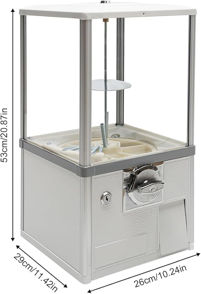 Costruzione durevole: realizzato in lega di alluminio di alta qualità e lega di zinco, con materiali ABS e PS per resistenza agli urti, alla rottura e alla deformazione. Il design rettangolare migliora la stabilità e la capacità portante, garantendo che la macchina rimanga stabile anche a pieno carico e circondata da bambini. Funzionamento semplice: funziona senza sforzo posizionando 2 monete da 25 centesimi su ciascun lato dello slot per monete (per un totale di 4 monete) e ruotando la manopola di 360° in senso orario per erogare oggetti. La macchina viene fornita con 4 accettatori di monete da 25 centesimi per impostazione predefinita, con opzioni per personalizzare l'accettazione della valuta su richiesta. Interno spazioso: misura 26 x 29 x 53 cm, può contenere circa 800-1000 monete, 200 uova intrecciate da 4,3 cm o 150 uova intrecciate da 4,8 cm, riducendo la necessità di ricariche frequenti e rendendolo ideale per centri commerciali e parchi di divertimento. Maggiore sicurezza: dispone di un lucchetto sulla parte superiore e all'esterno del salvadanaio, accessibile solo con la chiave fornita, salvaguardando giocattoli e monete dal furto. Il telaio rotante consente ai clienti di visualizzare facilmente gli oggetti all'interno. Efficienza energetica ed elegante: elimina la necessità di una supervisione costante, richiedendo solo l'aggiunta periodica di oggetti e la rimozione delle monete. Il suo design unico e chic funge da attraente pezzo decorativo che completa vari stili di arredamento.