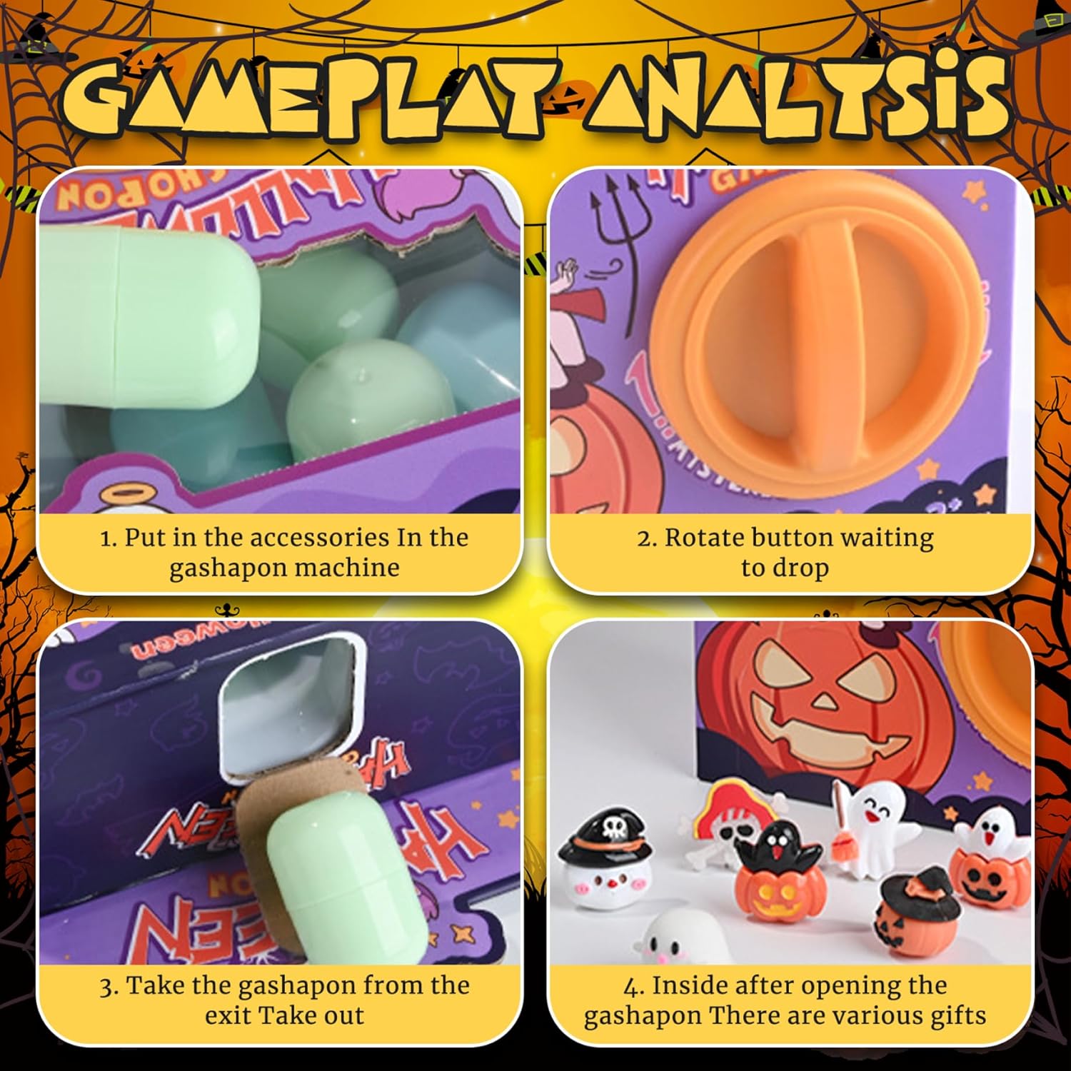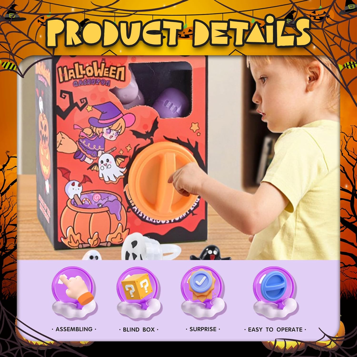 Esperienza divertente interattiva: questo distributore automatico per capsule giocattolo che coinvolge il gioco pratico con 6 uova a sorpresa casuali, perfette per incoraggiare la creatività e l'eccitazione nei bambini dell'asilo durante Halloween.Capsule Toys Toys Meccanismo di facile apertura: la semplice maniglia a turno e il distributore di capsule trasparenti consentono ai bambini di gestire la macchina in modo indipendente, promuovendo le capacità motorie e un senso di distribuzione del distributore automatico delle capsule. Varietà di uova a sorpresa: ogni set include sei giocattoli a capsula unici, aumentando la curiosità e la gioia con diverse sorprese da collezione che mantengono i bambini desiderosi di giocare di nuovo per i giocattoli per bambini Design di qualità: realizzato con materiali robusti, questa macchina per giocattoli a capsula resiste a un uso attivo, garantendo il divertimento di lunga durata e il gioco sicuro per i bambini a sorpresa delle uova di Halloween giocattoli Regali stagionali perfetti: su misura per i festeggiamenti di Halloween, questo giocattolo di distributore di capsule è un regali ideali che fondono il divertimento festivo con il gioco educativo, migliorando le esperienze delle vacanze per l'asilo per le asili