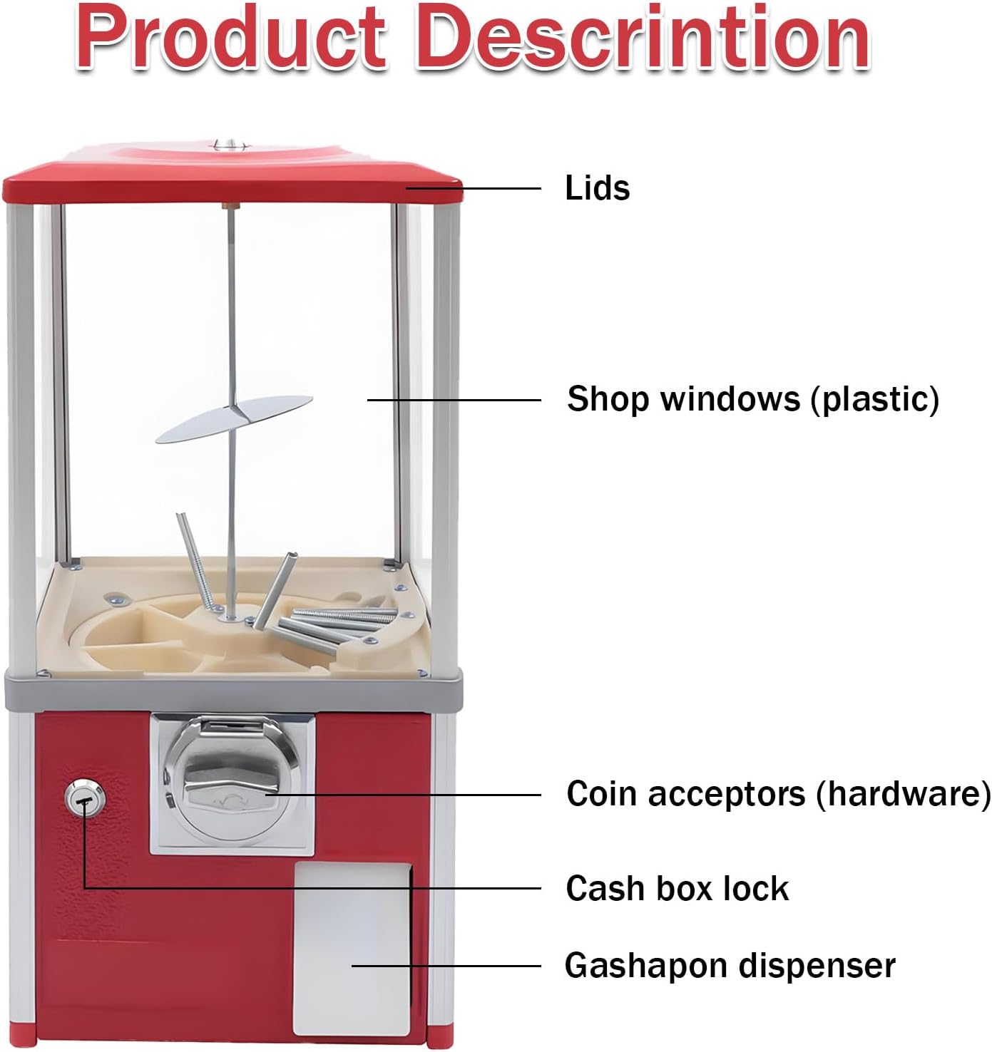 【COSTRUITO PER DURARE】Il nostro prodotto è realizzato in ABS di alta qualità e lega di alluminio, lega di zinco e acciaio con processi di pressofusione e stampaggio, che lo rendono resistente all'usura e indeformabile, così da poterlo utilizzare a lungo. 【ELEVATA SICUREZZA】Questa macchina è dotata di esclusive serrature sul coperchio superiore e serrature sul salvadanaio per impedire il furto di giocattoli e monete. L'uscita è dotata di un deflettore e di un telaio rotante sopra l'uscita dei giocattoli per impedire la caduta accidentale di oggetti all'interno della macchina, evitando così la perdita di oggetti. 【ELEVATA CAPACITÀ DI CARICO E GRANDE CAPACITÀ】 La capacità di carico di questo prodotto è di 7 kg/15 libbre, abbastanza forte da poter riporre i giocattoli senza preoccuparsi che si scuotano o si ribaltino. Le dimensioni di questo prodotto sono 9,8 x 9,8 x 19,6 pollici, abbastanza grandi da contenere oggetti senza doverli aggiungere frequentemente e soddisfare le esigenze di intrattenimento dei visitatori nella maggior parte dei centri commerciali e dei parchi di divertimento. 【DESIGN TRASPARENTE】La metà superiore di questo prodotto è trasparente, il che rende facile per i clienti vedere gli articoli all'interno, attirando i clienti e migliorando l'esperienza di acquisto. 【FACILE DA USARE】Basta inserire 2 monete da 25 nella fessura per le monete e ruotare la manopola di 720° in senso orario per recuperare gli oggetti caduti all'uscita. Il processo è facile da padroneggiare e richiede solo pochi minuti.