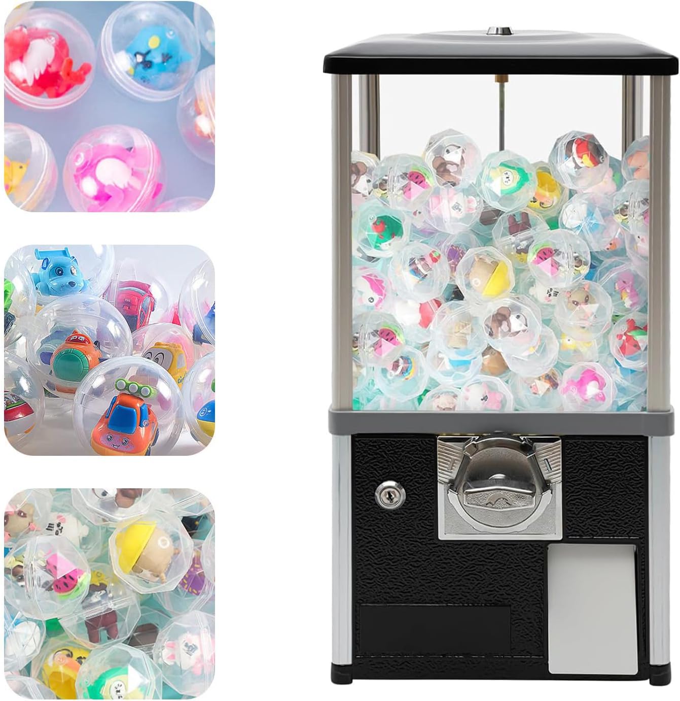 ★FACILE DA USARE: Il distributore automatico accetta monete e gettoni dai paesi interessati, può inserire da 1 a 4 monete contemporaneamente ed è adatto per giocattoli e caramelle da 45-55 mm. (Per il cambio valuta o altre esigenze, vi preghiamo di contattarci via email. Grazie) ★AMPIA CAPACITÀ: Le grandi dimensioni di 26*29*53 cm possono contenere circa 800-1000 monete, 150 gashapon (4,8 cm), evitando così frequenti aggiunte o rimozioni di gashapon e soddisfacendo al contempo le esigenze di intrattenimento della maggior parte dei visitatori di centri commerciali e parchi di divertimento. ★ROBUSTO E RESISTENTE: Questo prodotto è realizzato in lega di alluminio, lega di zinco e ABS, resistenti e non facili da deformare. La cassa rotonda di questo distributore è realizzata in materiale PS, che garantisce elevata trasparenza e robustezza. Anche se è pieno di giocattoli e ci sono molti bambini in giro, puoi usarlo senza preoccuparti che tremi o si ribalti. ★ELEVATA SICUREZZA: Il distributore automatico è dotato di serrature sulla parte superiore e esterna del cassetto delle monete. Solo la nostra chiave abbinata può aprirlo, impedendo il furto di giocattoli e monete. Il telaio può essere ruotato per consentire ai clienti di visualizzare facilmente la posizione degli articoli all'interno del distributore. ★AMPIA APPLICAZIONE: I nostri distributori automatici sono adatti a una varietà di scenari, tra cui sale giochi, centri commerciali e negozi al dettaglio. Una varietà di colori viene utilizzata come colore di base del prodotto, che insieme ai colorati giocattoli e caramelle gashapon creano un'atmosfera da favola.
