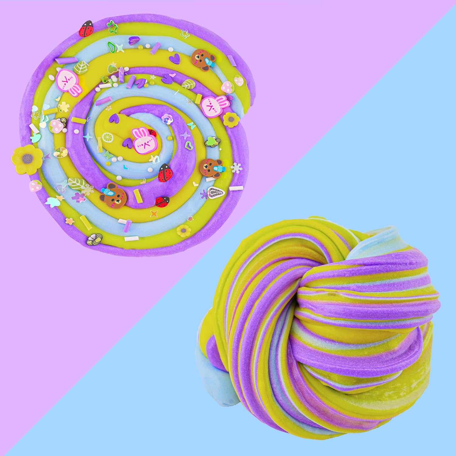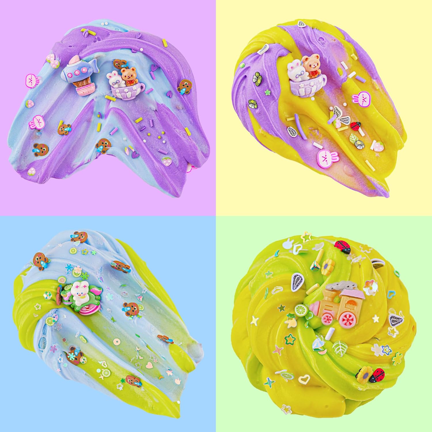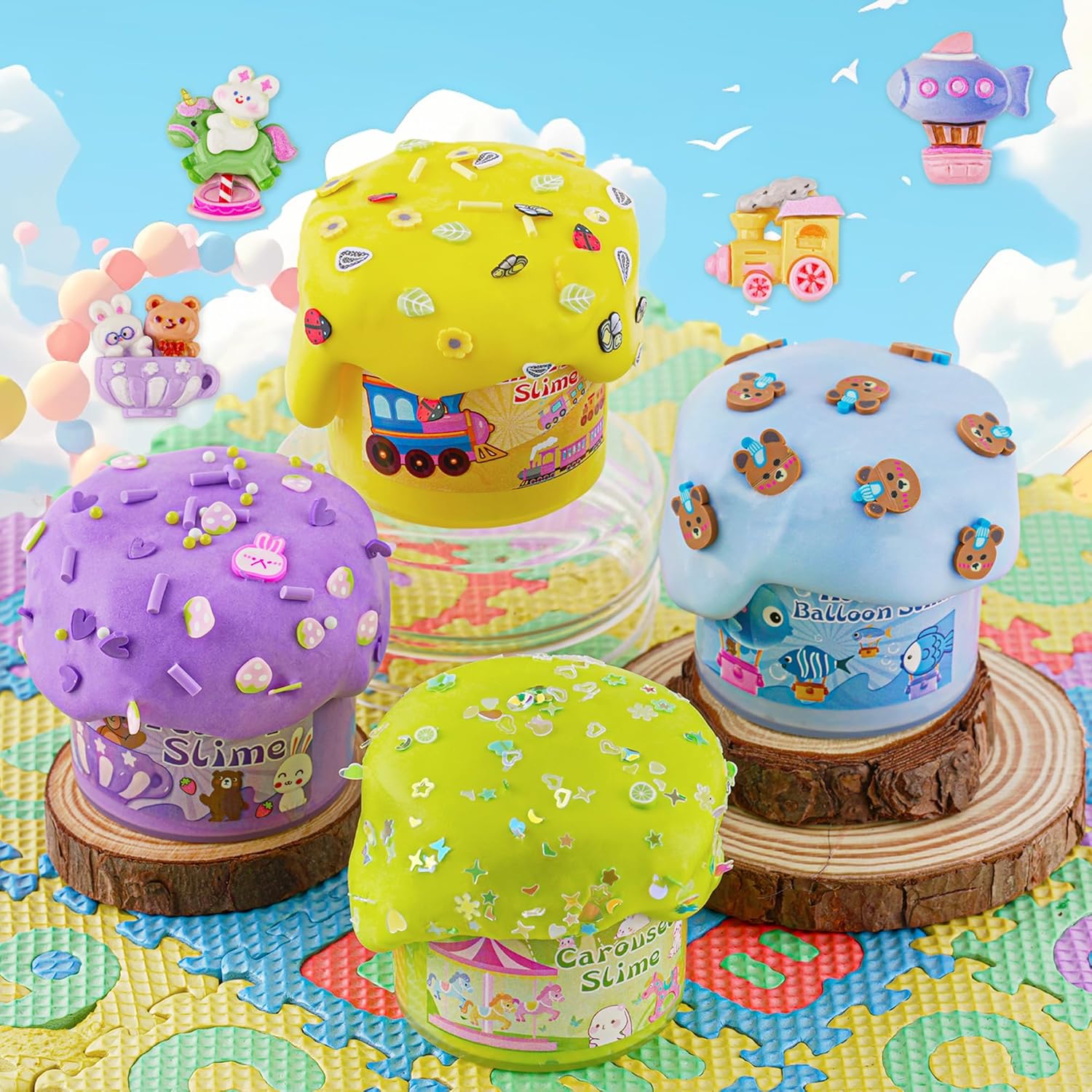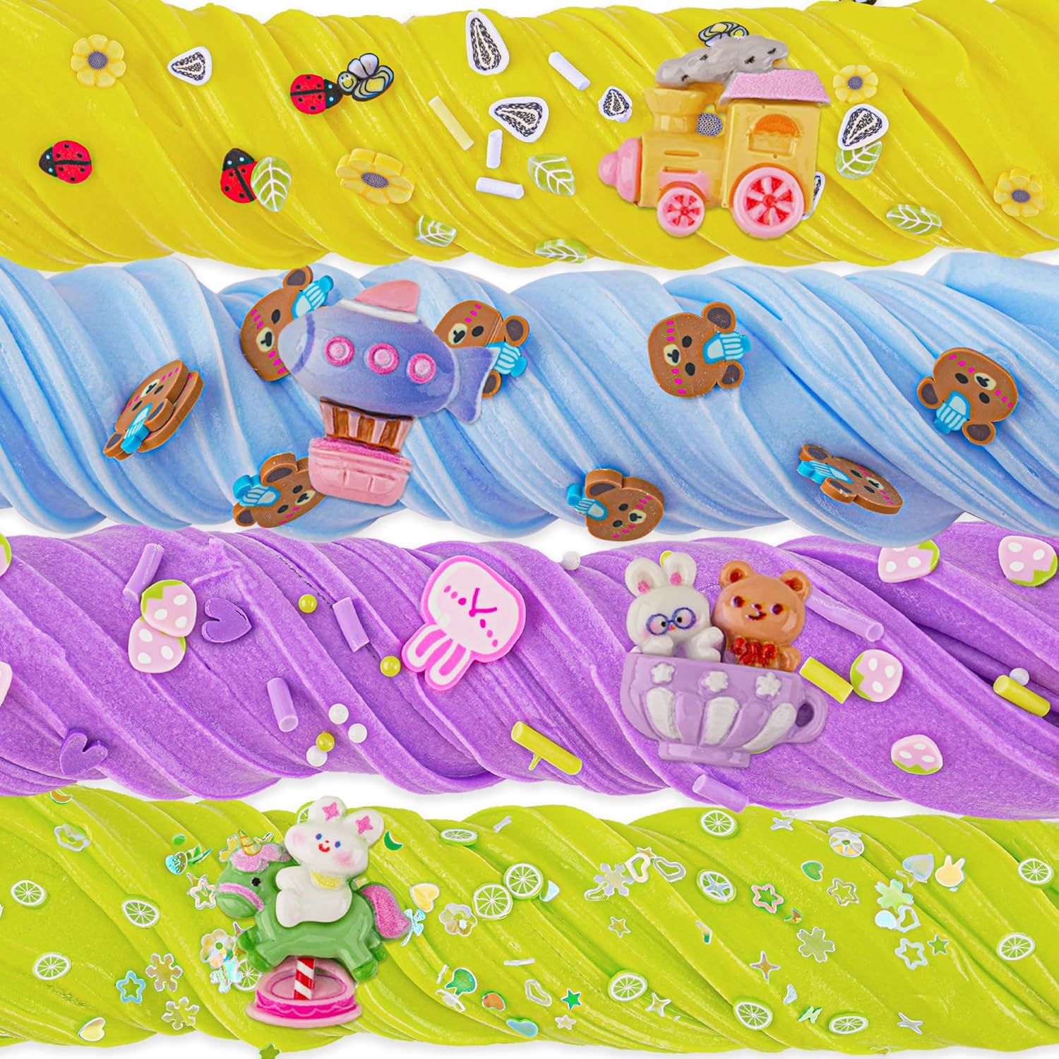 Adorabili ciondoli e componenti aggiuntivi per slime Ogni barattolo contiene 60 ml di slime al burro, per un totale di 240 ml. Il volume moderato di 60 ml è perfetto per le piccole mani dei bambini con cui giocare! Questo kit di slime al burro alimentare include 4 colori di slime al burro: slime verde, slime blu, slime viola e slime giallo. 4 tipi di ciondoli per slime: ciondolo a giostra, ciondolo a mongolfiera, ciondolo a tazza da tè e ciondolo a mini treno. 4 tipi di fette morbide. Super morbido e ben elastico Il butter slime di Okaybee offre una consistenza unica, super morbida al tatto. Grazie alla sua natura facile da usare, puoi tuffarti subito e iniziare a goderti la bontà soffice ed elastica. Non preoccuparti delle mani appiccicose! Slime per bambini Realizzato con ingredienti di alta qualità, questo kit di slime al burro è sicuro per bambini e adulti. Nota: si raccomanda la supervisione di un adulto per i bambini di età inferiore ai 3 anni. NON mangiare! Giocattoli sensoriali perfetti Che tu voglia liberarti dallo stress o migliorare il tuo gioco sensoriale, questo pacchetto di slime è perfetto per te. Guarda come lo slime si allunga, si schiaccia e trasuda tra le tue dita, offrendo infinite ore di divertimento. Fantastico regalo di slime per bambini Questo kit di slime al burro è un fantastico regalo di compleanno per bambini e bambine di 6, 7, 8, 9, 10, 11, 12 anni. Ideale come bomboniera per feste di slime, per la scuola o per ogni occasione, persino come regalo di Natale.