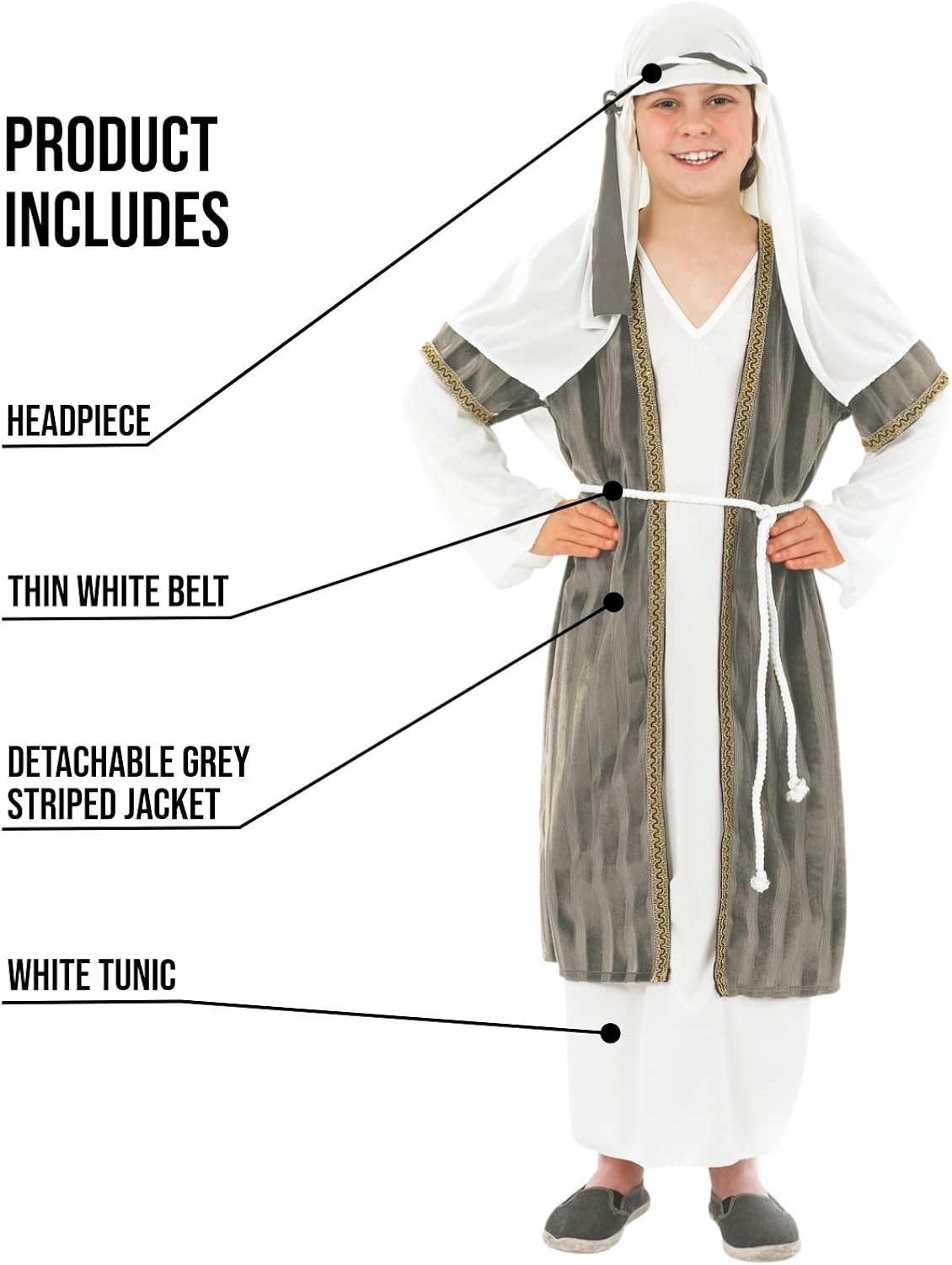 This is a great little shepherd's outfit. I was very impressed with the quality, particularly of the overcoat/waistcoat. It is a nice velvety material with gold braiding down the edges of it. It is so nice it could probably do as a Joseph or King/Wise Men outfit with a different head piece. My daughter was chosen as a shepherd in her play but wanted a pink outfit! So I dyed the white headpiece and main white tunic. That material can by hard to dye, but it took the dye well and there was no patching on it.