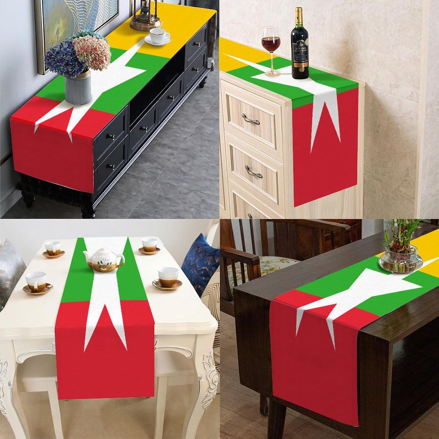 Divertente runner da tavola con bandiera nazionale birmana, stile fattoria, 33 x 274 cm, runner da tavola in iuta birmana, moderno comò sciarpe e runner per la casa