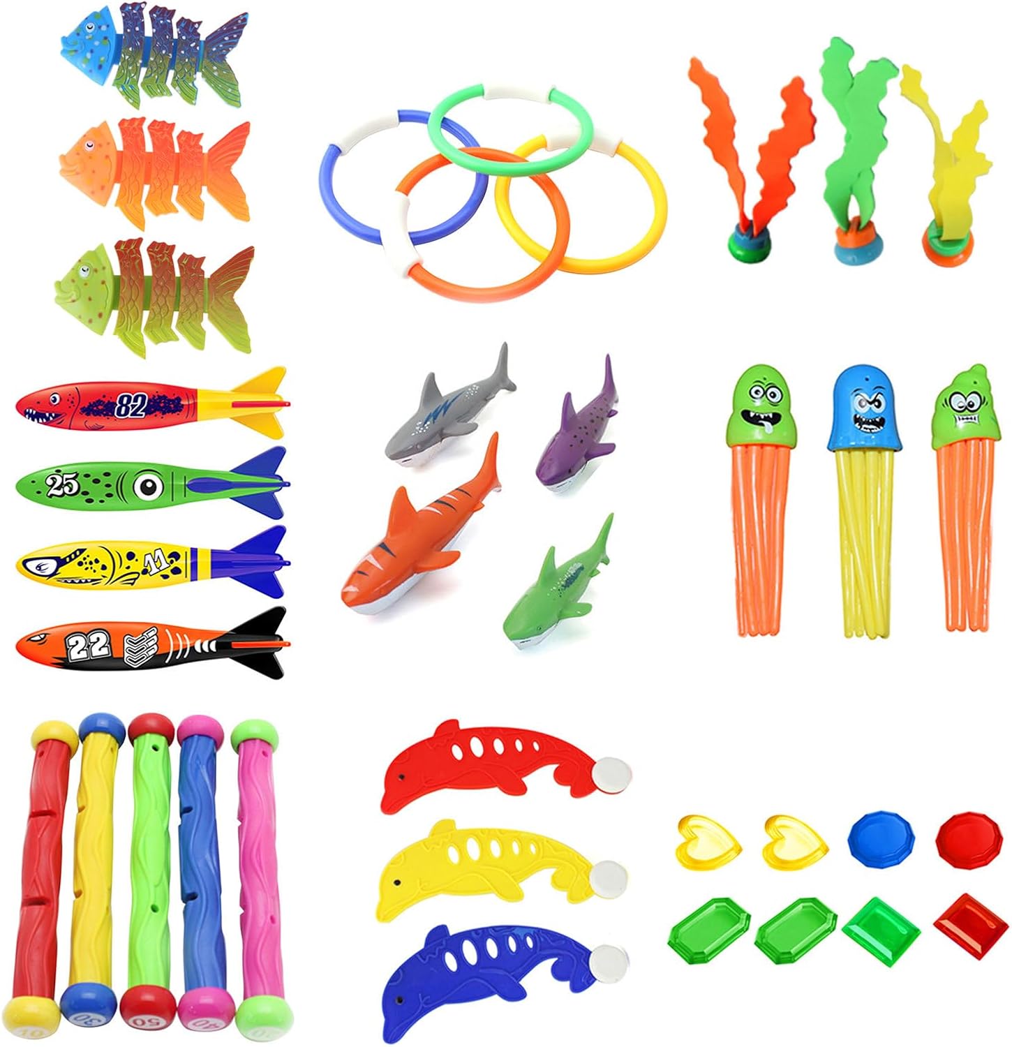 Giocare insieme. Perfetto per divertimento gioco caccia tesoro. Goditi gioco caccia tesoro con amici e familiari Accessori per piscina per bambini. I bambini possono divertirsi con questi divertenti giocattoli da piscina in spiaggia, piscina o divertirsi durante bagno Qualità affidabile. I divertenti giocattoli piscina sono realizzati con materiale materiale plastico non tossico, senza bara. Sicuro per i bambini. 9 Opzioni del pacchetto: 3 x pesci; 4 x immersione; 3 x d'acqua; 4x strumenti immersione; 4 x pesce immersione; 3 x 5 X bastoncini immersione; 3 x immersioni-dolfini; 8 pietre preziose Giocattolo immersione divertente. Questi giocattoli subacquei offrono buone possibilità per migliorare le capacità immersione del tuo bambino. L immersione subacqueo e i bastoncini depositano sul fondo della piscina in posizione verticale, rendendo facile afferrare durante l'immersione Design ergonomico. Questi giocattoli per immersioni per bambini sono sicuri e delicati per le mani delicate. I bastoncini per immersioni, l e giocattolo pesce sono lisci e facili da afferrare