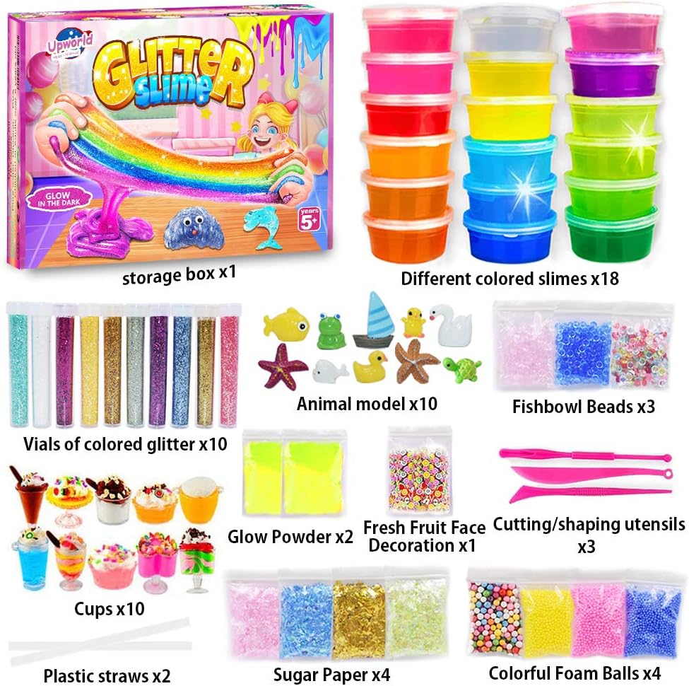 il kit di slime making include: diversi melme colorate x18, fiale di glitter colorati x10, bagliore nella polvere scura x2, palline di gommapiuma colorate x4, carta da zucchero x4, perline fishbowl x3, modello animale x10, tazze x10, 1 confezione di decorazioni per la faccia di frutta fresca, taglio / modellatura utensili x3, cannucce di plastica x2. tutto ciò di cui hai bisogno in questo kit. imparare giocando: kit di slime colorato per bambini, che migliora la loro creatività, abilità pratiche, riconoscimento dei colori e li aiuta a sviluppare le loro capacità motorie e una migliore coordinazione occhio-mano. anche i grandi possono giocare. sicuro e non tossico: realizzati con materiali ecologici e non tossici, i nostri contenitori di melma e melma sono lavabili, riutilizzabili, sicuri e non contengono polvere di borace, che soddisfano totalmente i requisiti di sicurezza dei giocattoli. è consigliato per bambini dai 6 anni in su. non mangiarlo! facile da conservare e trasportare: con uno squisito contenitore di plastica, i rifornimenti del kit di melma fai-da-te possono essere inseriti dopo aver giocato. basta conservarlo in un luogo asciutto o fresco, i bambini possono godersi il kit di melma trasparente per molto tempo. grande regalo per bambini: il kit di melma fai-da-te è un ottimo regalo per i bambini, puoi inviarlo a tuo nipote, figlio, figlia, nipote, nipote e persone care come regalo di compleanno o festival. può anche aiutarti a sviluppare una relazione calda e solidale con i bambini.