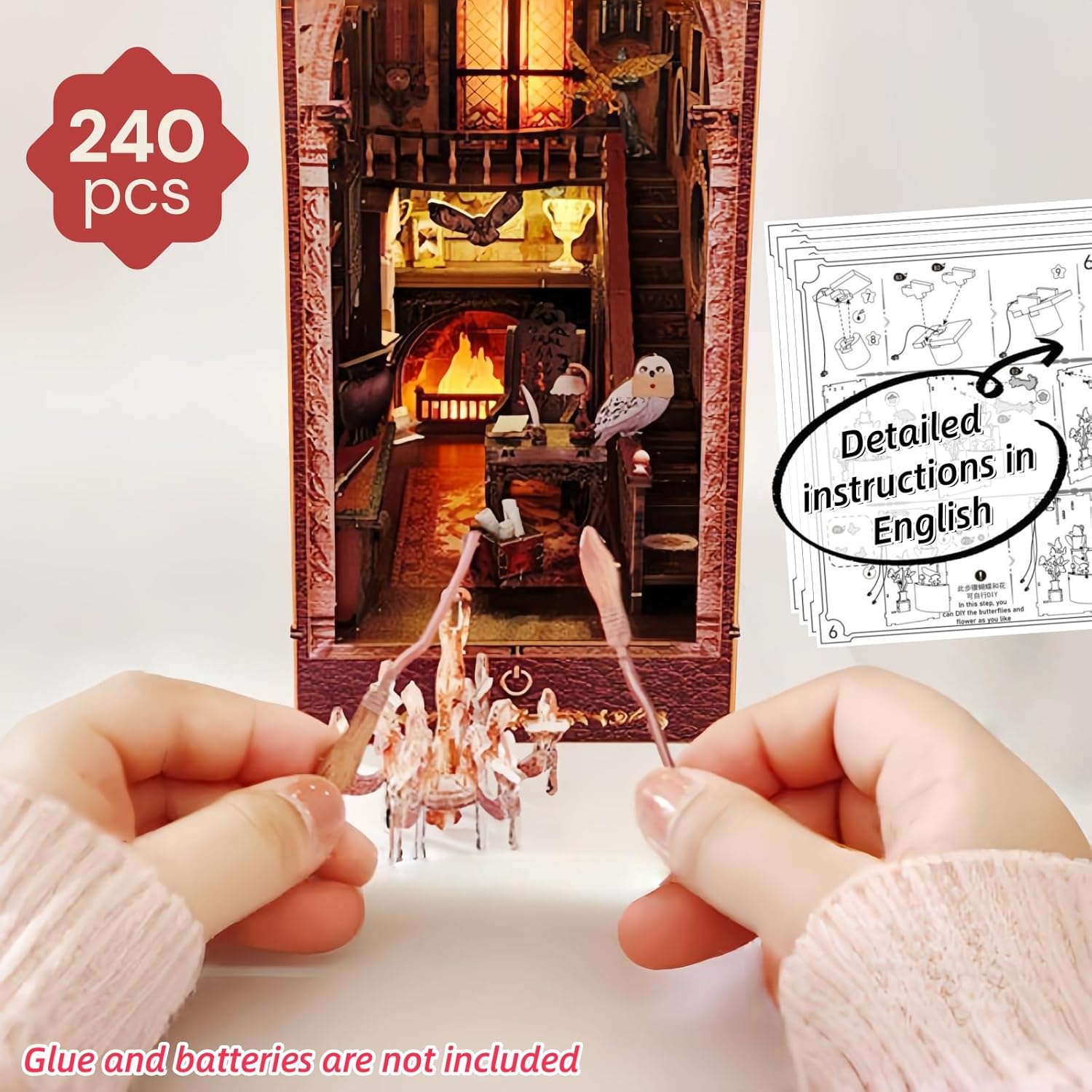 Una scena Fantasy Magic Academy: Questo angolo del libro in miniatura ti trasporta in un castello magico. Costruisci una scena simile a una sala comune e immergiti in un'atmosfera magica misteriosa e antica. Mondo mistico riccamente dettagliato: il modello è ricco di dettagli intricati, da un camino retrò e candelieri a un gufo galleggiante, libri di incantesimi e misteriosi trofei. Ogni parte è progettata con cura per stimolare la tua immaginazione. Divertimento coinvolgente artigianale: costruisci la tua meraviglia magica con questo progetto pratico. Questo modello ti consente di sperimentare un processo creativo pieno di mistero e divertimento, portando a un senso di realizzazione unico. Una miscela di praticità ed estetica: è sia una bella opera d'arte che un fermalibri funzionale. Posizionarlo sulla libreria aggiunge un tocco magico unico e mette in mostra il tuo gusto personale. Regalo creativo per adulti: questo modello è un ottimo regalo per gli amanti dell'artigianato o per chiunque ami la letteratura fantasy o i temi magici. È più di un regalo; è un pezzo di unicità e meraviglia che puoi creare con le tue mani.