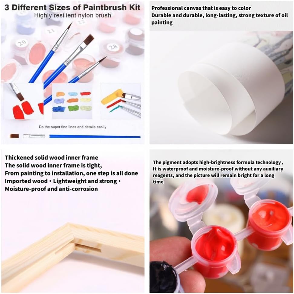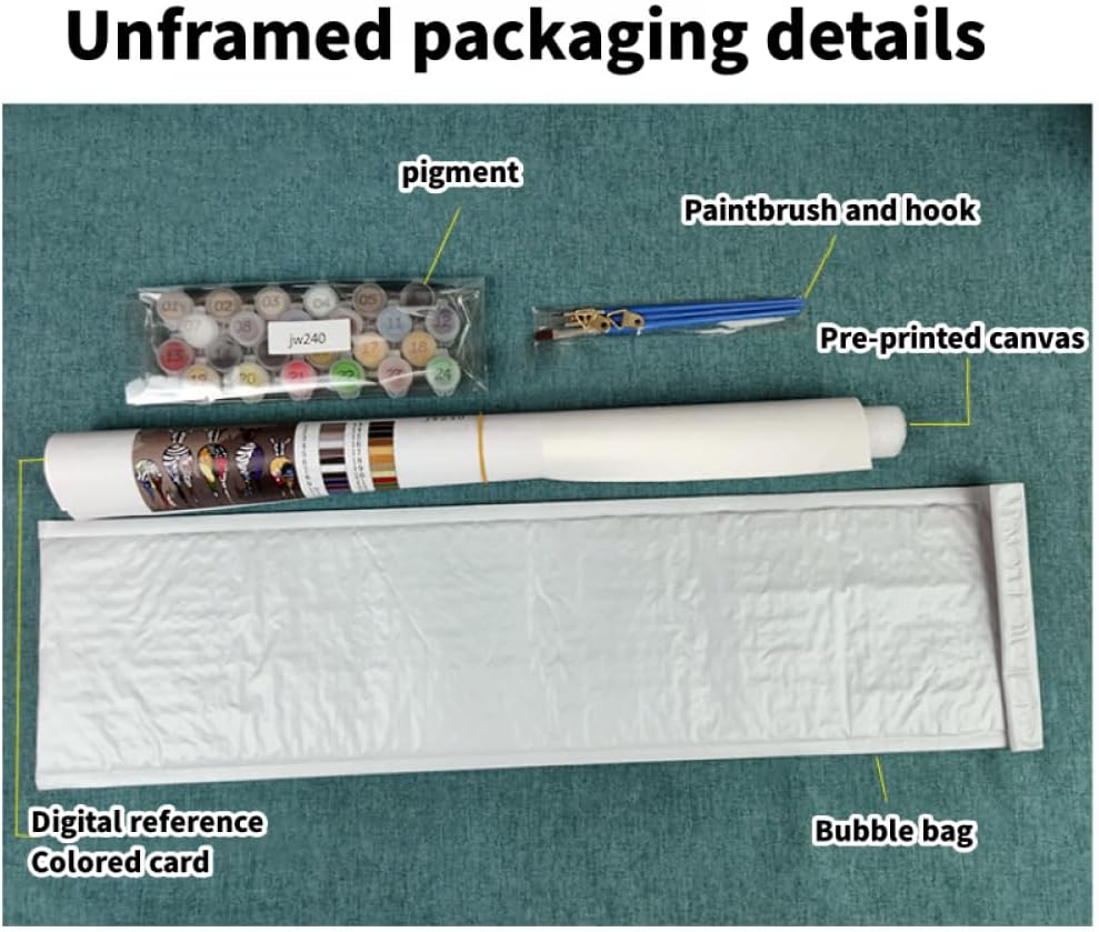 Il set include: tela prestampata colorata, 1 set di colori acrilici, 3 pennelli, 1 immagine colorata, 1 immagine di riferimento digitale, 2 ganci metallici e viti Materiali sani: le nostre vernici sono vernici acriliche con elevata riproduzione dei colori, colori brillanti, forte copertura, durevoli e non sbiadiscono, atossiche e inodori, quindi non devi preoccuparti che la vernice ti danneggi il corpo quando dipingi. Facile da dipingere: devi solo abbinare i numeri della vernice e la grafica sulla tela per riempire la vernice. Dipingi in base ai numeri dei colori e finisci uno per uno. Adatto ad anziani, adulti, bambini e principianti, è facile creare opere d'arte classiche. Ampia applicazione: puoi regalare dipinti a olio digitali alla tua famiglia e ai tuoi amici e i dipinti a olio finiti possono anche essere usati come decorazioni per il tuo soggiorno, camera da letto, ufficio, ristorante, bar. Servizio post-vendita: se hai domande dopo aver ricevuto il set di pittura a olio digitale, puoi contattare il nostro servizio clienti inviando un'e-mail. Garantiamo di rispondere e risolvere i tuoi problemi entro 24 ore.