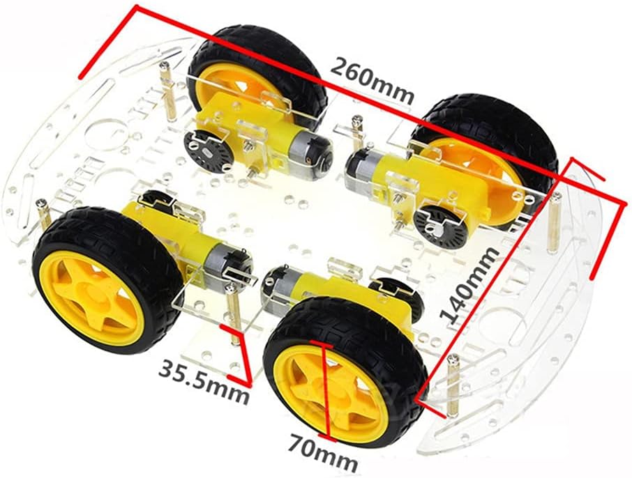 Kit educativo per principianti (bambini) per acquisire esperienza pratica robotica e può estendere il elettronico come o ecc. Realizzando funzioni di tracciamento, prevenzione degli ostacoli, test della distanza, test della velocità, wireless. La meccanica è semplice, 4 motoriduttori CC, tornitura flessibile, telaio ecologico è stabilità e molto facile da espandere. Telaio per auto Robot di tracciamento intelligente, alto di libertà, perfetto per materie DIY, educazione scientifica, sviluppo di hobby e interessi, giocattoli educativi per bambini. Nessun componente aggiuntivo è molto conveniente, l'intero altamente integrato. Può essere utilizzato per misurare la distanza e la velocità. Dimensioni: 25 x 14 cm (lunghezza x larghezza). Dimensioni della ruota: 6 x 2,7 cm (Dia.). L'alimentazione del motore è 3V ~ 6V. Tutto il parametro di cui sopra è testato carico.