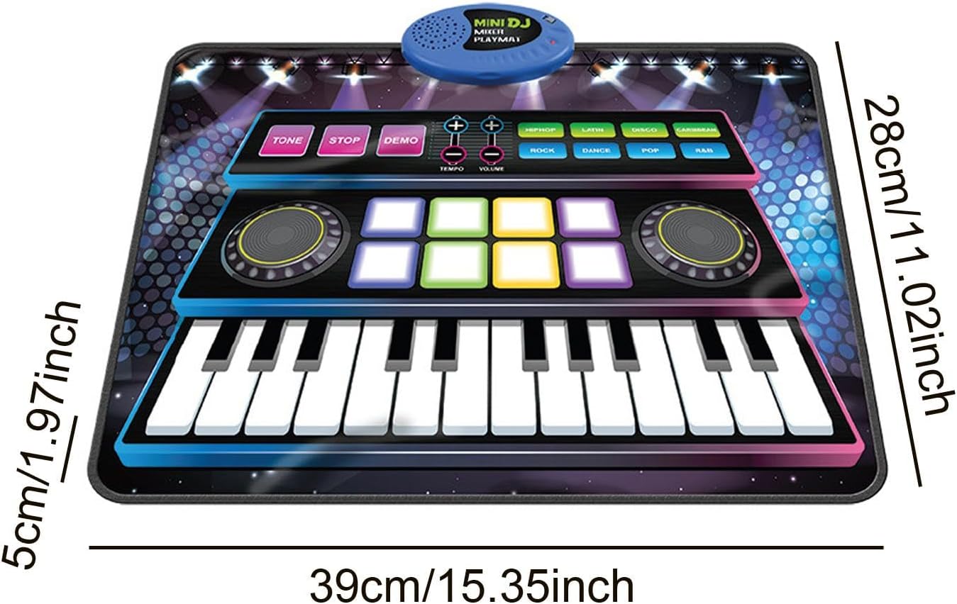 【Mat di gioco musicale versatile】: questo giocattolo multifunzionale per mixer DJ presenta 24 piane chiave, 8 facce di tamburi e due giradischi, creando per bambini di età 3-6 【Materiale】: realizzato con materiali PP per la pelle, questo tappetino per bambini per bambini garantisce un comodo ambiente di gioco per il tuo bambino mentre sono i loro musicali 【Portable】: il tastiera per pianoforte è un design pieghevole semplifica la memorizzazione e il trasporto Sia in casa o all'esterno, a tuo figlio può divertirsi in qualsiasi momento 【Opzioni sonore ricche】: il mixer DJ Party con 8 diversi effetti sonori per incoraggiare il gioco cooperativo ed l'esplorazione musicale 【Volume regolabile e sensibilità al tocco】: le impostazioni del volume regolabili garantiscono livelli sonori ottimali sia per le attività interne tranquille che per il divertimento esterno vivace Il pad del tocco sensibile risponde ad ogni tocco, fornendo un'esperienza coinvolgente su misura per le esigenze di tuo figlio