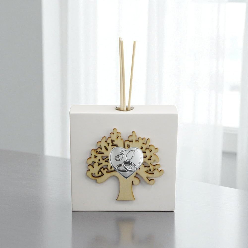 DESIGN ELEGANTE: Profumatore d'ambiente con base in ecopelle bianca 11x11x5 cm, decorato con Albero della Vita in legno e piastra argentata a forma di cuore con fedi per 50° anniversario SET COMPLETO: Include diffusore, bottiglia di essenza profumata, tre bacchette diffusori e certificato di garanzia, tutto presentato in elegante confezione regalo MATERIALI RAFFINATI: Realizzato con base in ecopelle bianca di alta qualità, impreziosito da dettagli in legno naturale e piastra argentata decorativa DIMENSIONI IDEALI: Misure compatte di 11x11x5 cm, perfette per qualsiasi ambiente della casa, dalla camera da letto al soggiorno CONFEZIONE REGALO: Presentato in elegante confezione regalo con tutti gli accessori inclusi, pronto per essere donato come bomboniera per nozze d'oro