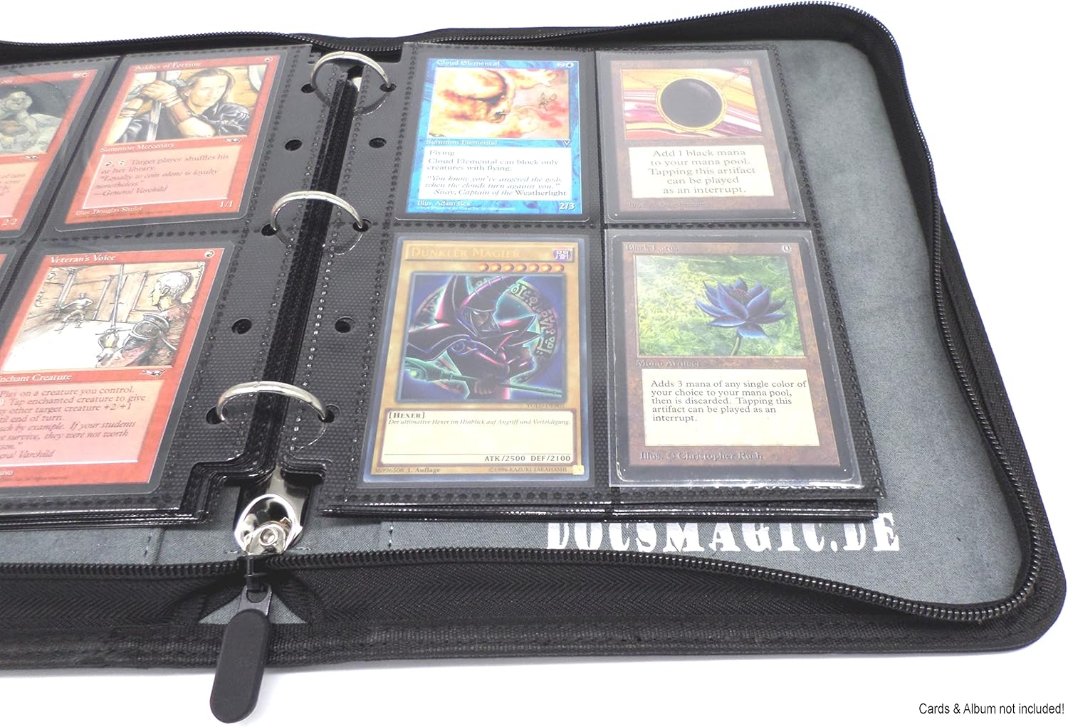Dimensioni: ca. 196 x 157 mm Le tasche da 67 x 93 mm possono contenere carte fino a dimensioni standard (63,5 x 88 mm) in maniche (larghezza massima 65 mm), come Pokemon, Magic: The Gathering, Yu-Gi-Oh! e molti altri sport e carte collezionabili, quattro tasche sul davanti e sul retro ciascuna; Qualità premium: spessore 100 micron con 5 fori adatti ai mini album Docsmagic.de e ad alcuni di altri marchi 25 pagine nere in polipropilene (PP) privo di acidi