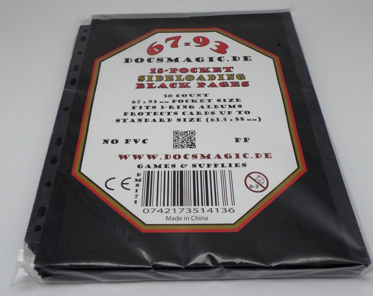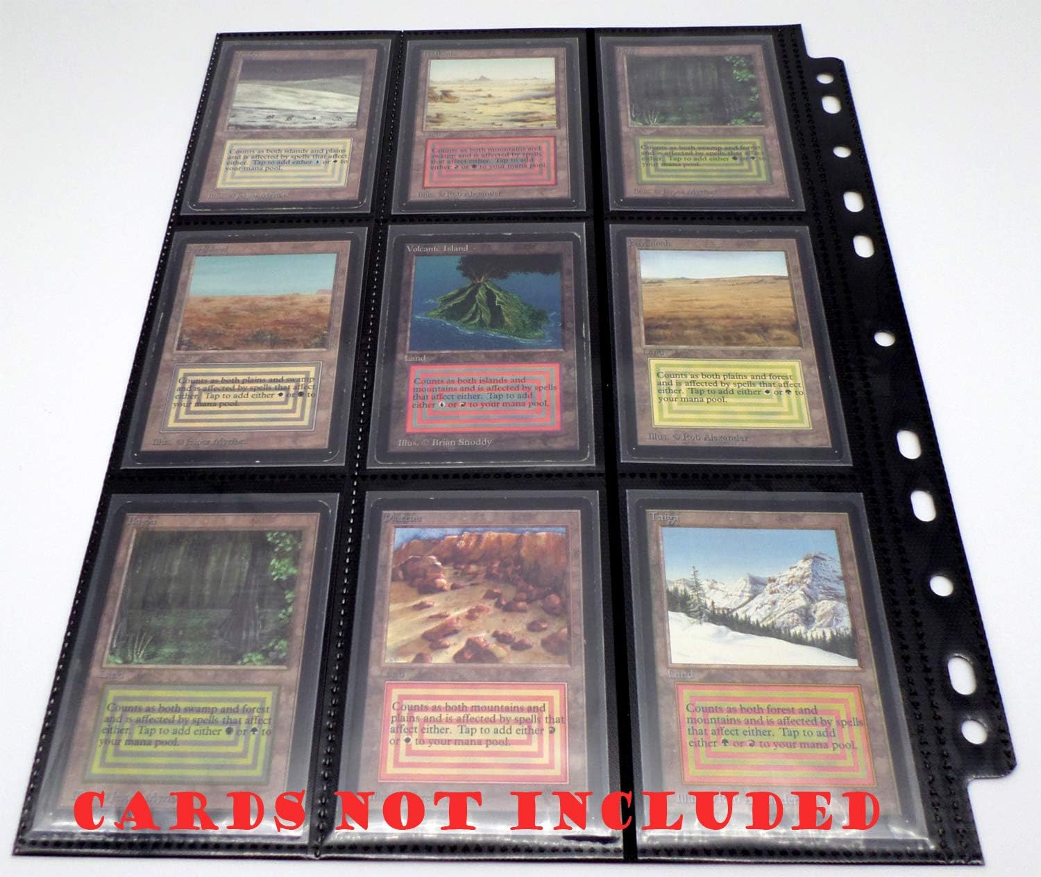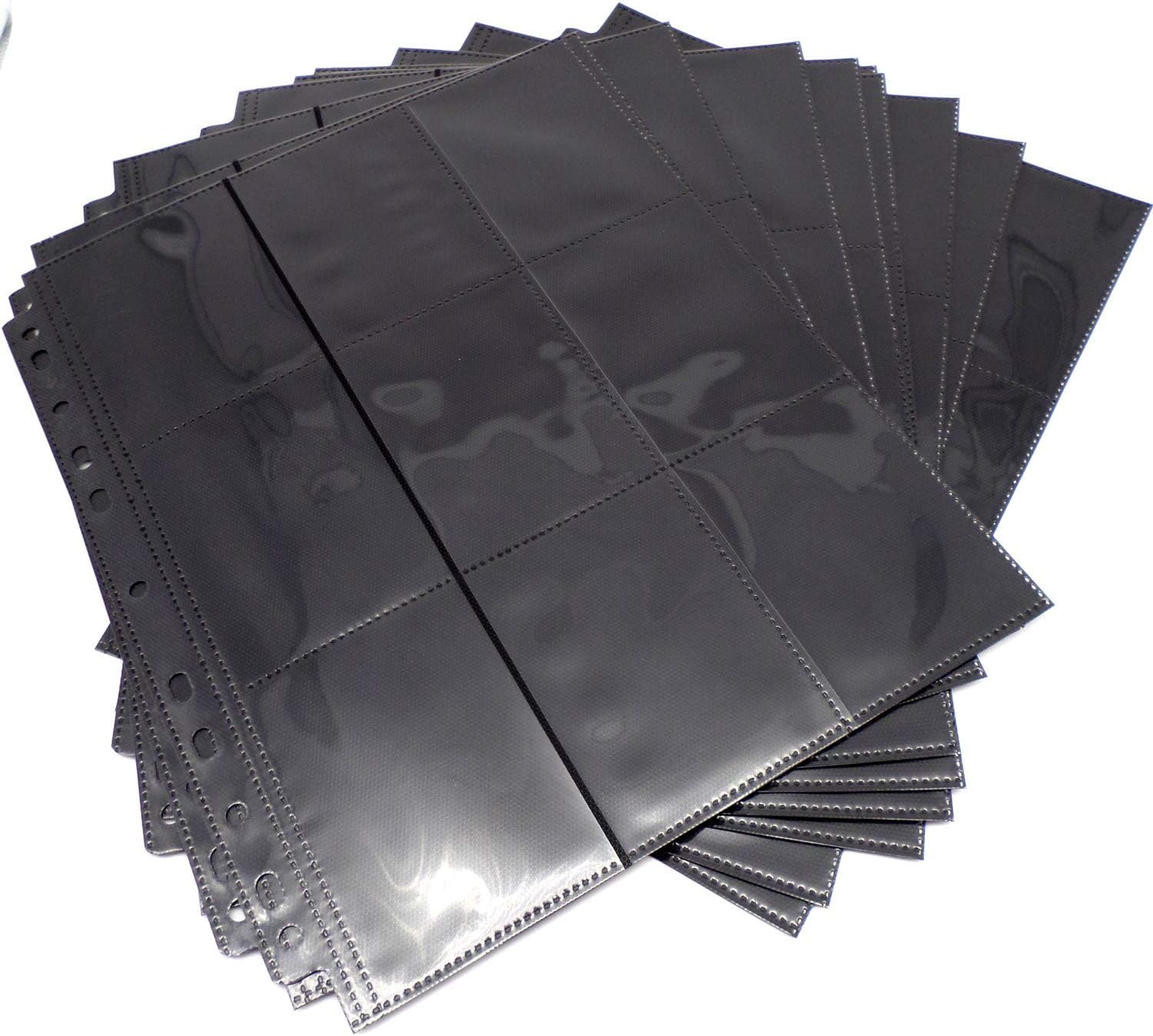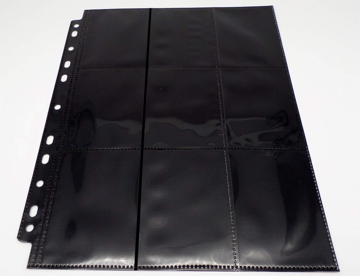 9 tasche nere con caricamento laterale da 67 x 93 mm sulla parte anteriore e posteriore adatte per carte fino a dimensioni standard (63,5 x 88 mm), come Magic: The Gathering, Yu-Gi-Oh!, Android: Netrunner, Pokemon, World of Warcraft, Match Attax, Star Wars, Star Trek e altro ancora. Rigido da 100 micron Qualità Premium (polipropilene (PP) privo di acidi) Si adatta a quasi tutti i raccoglitori ad anelli grazie a 11 fori Dimensioni pagina: 210 x 290 mm