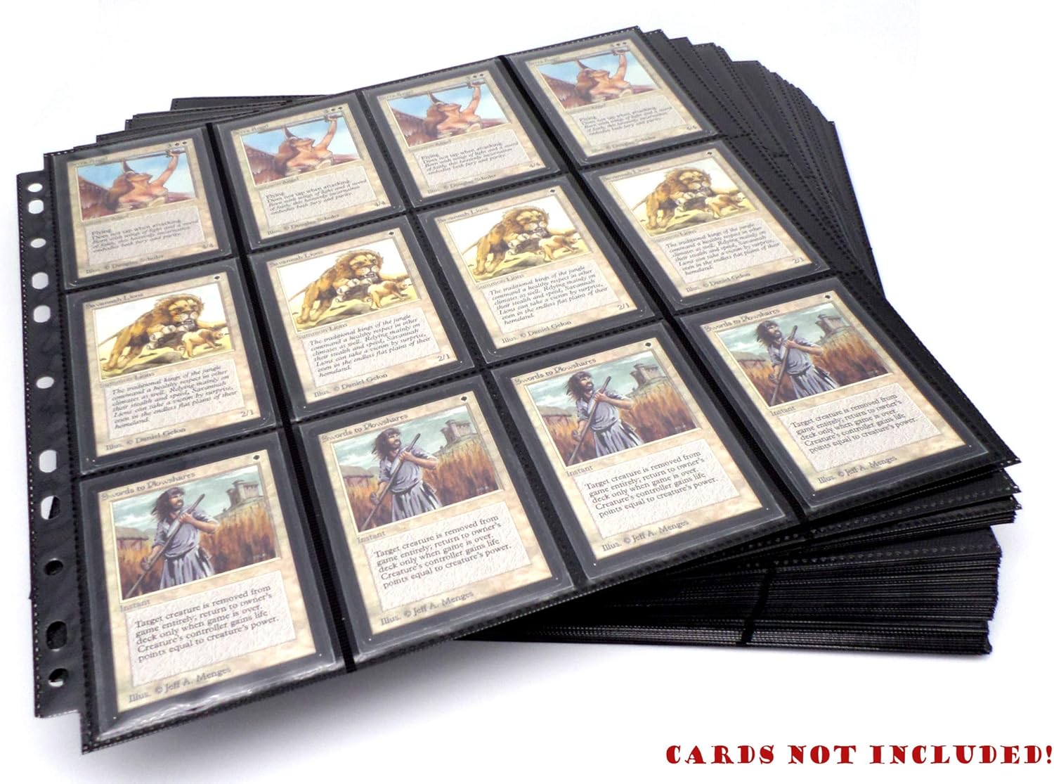 12 tasche nere con caricamento laterale da 67 x 93 mm sulla parte anteriore e posteriore adatte per carte fino a dimensioni standard (63,5 x 88 mm), come Magic: The Gathering, Yu-Gi-Oh!, Android: Netrunner, Pokemon, World of Warcraft, Match Attax, Star Wars, Star Trek e altro ancora. Rigido da 100 micron Qualità Premium (polipropilene (PP) privo di acidi) Si adatta a quasi tutti i raccoglitori ad anelli grazie a 11 fori Dimensioni pagina: 305 x 292 mm