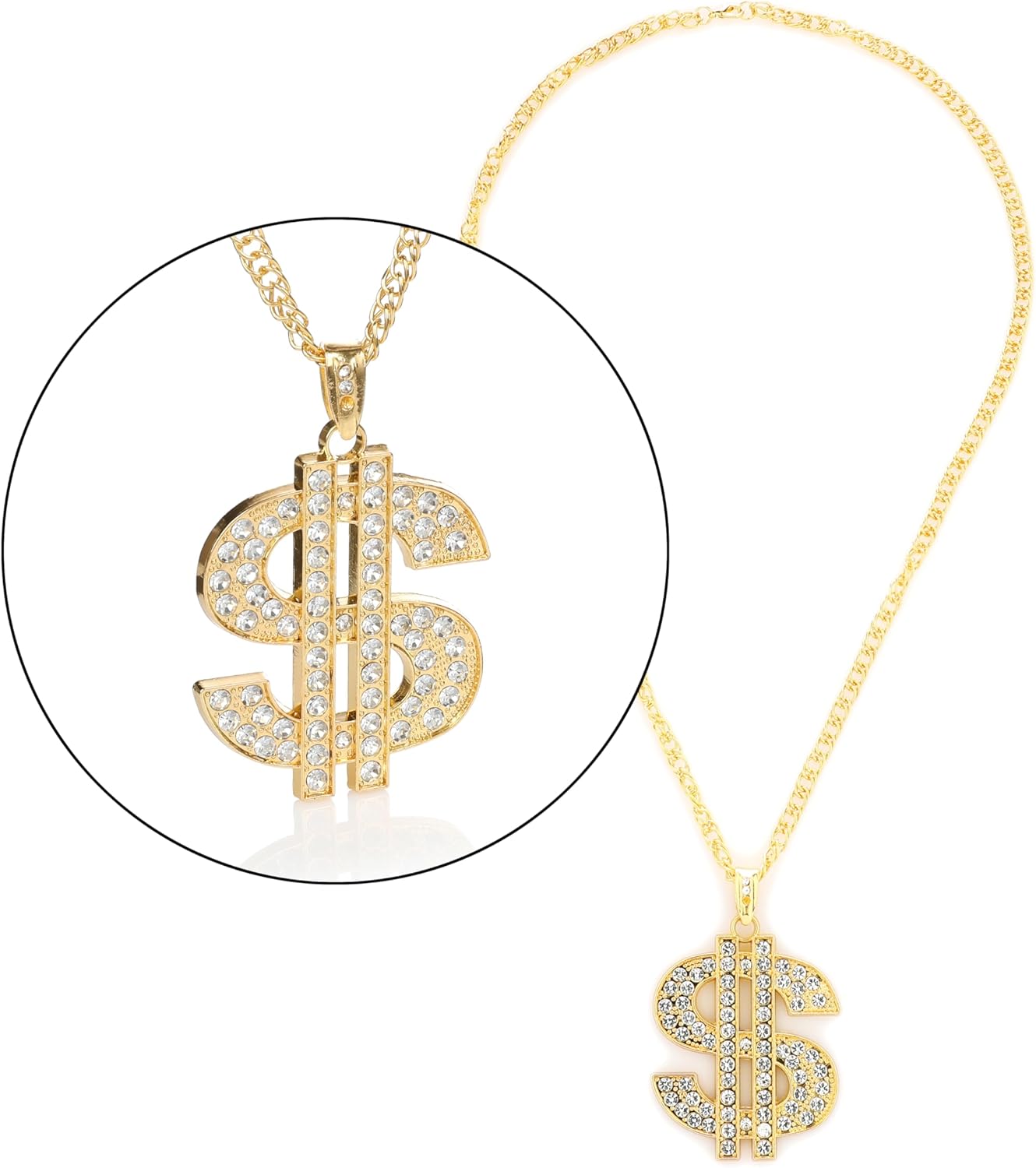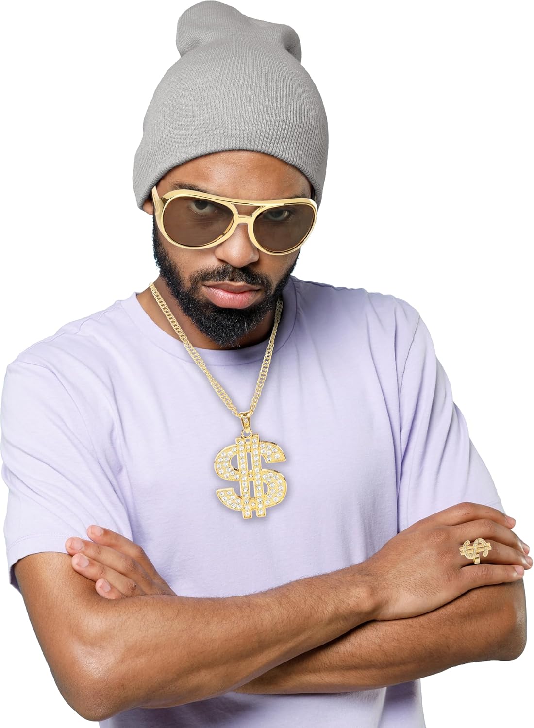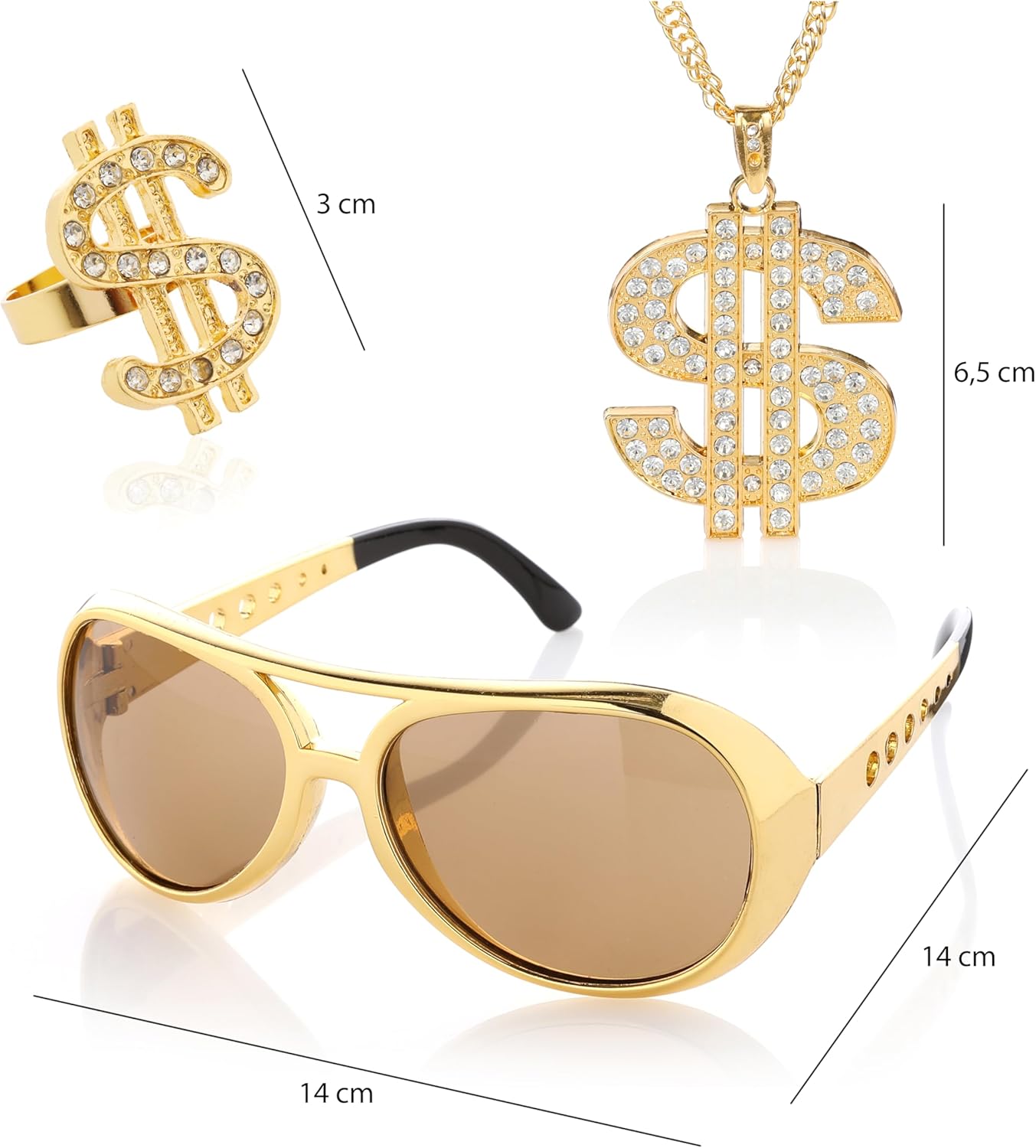 SET PERFETTO: include occhiali da sole, una catena dorata del dollaro e un anello abbinato: l'accessorio perfetto per il tuo outfit anni '80 o '90 Look GANGSTER: ideale per carnevale, feste a tema, ti dà l'autentico stile gangster o casinò Dettagli dorati: la catena lucida del dollaro e l'anello rendono il tuo abbigliamento da discoteca o hip hop un'attrazione assoluta OCCHIALI RETRO: gli eleganti occhiali da sole completano perfettamente il tuo look Studio 54 o Assi, un must have per ogni travestimento Versatile: che si tratti di carnevale, feste anni '80, evento hip hop o gangster – con questo set sarete ben attrezzati