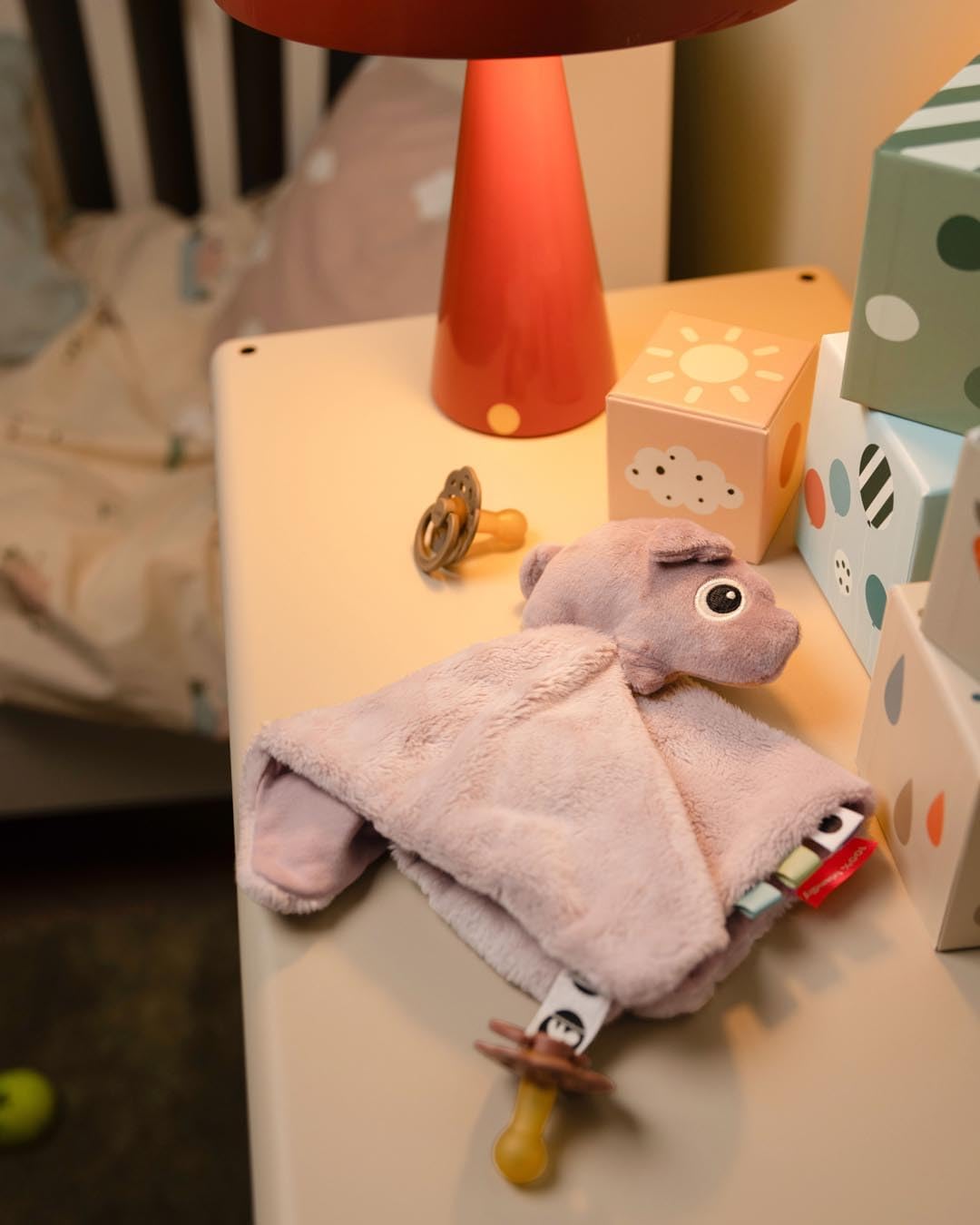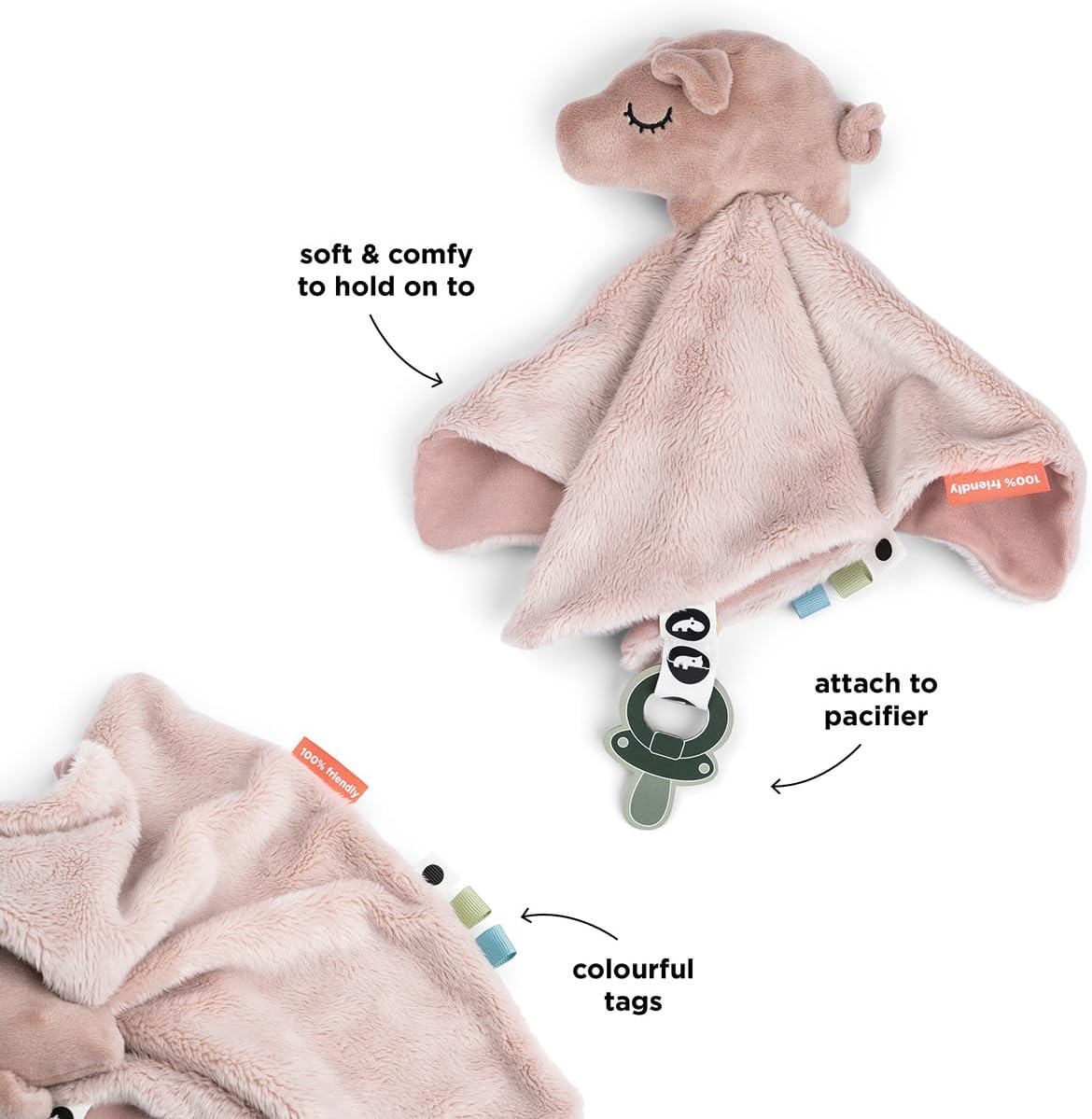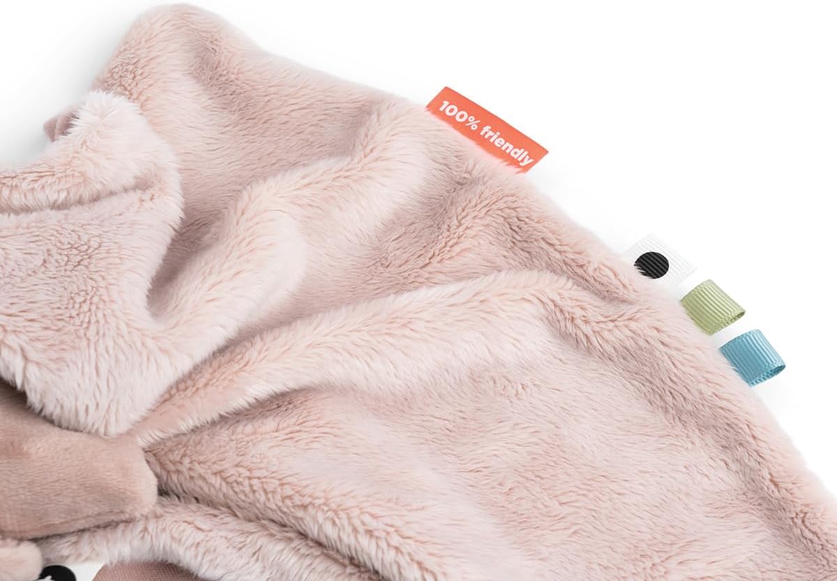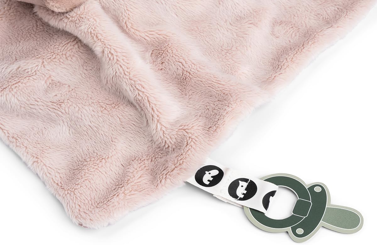 Elementi sensoriali come diverse texture e etichette colorate stimolano i sensi del tuo bambino Super morbido e avvolgente Grazie alla chiusura in velcro, il ciuccio è sempre a portata di mano Ideale per addormentarsi o in viaggio Adorabile asciugamano rosa con pigee, un amico ideale per coccolarsi