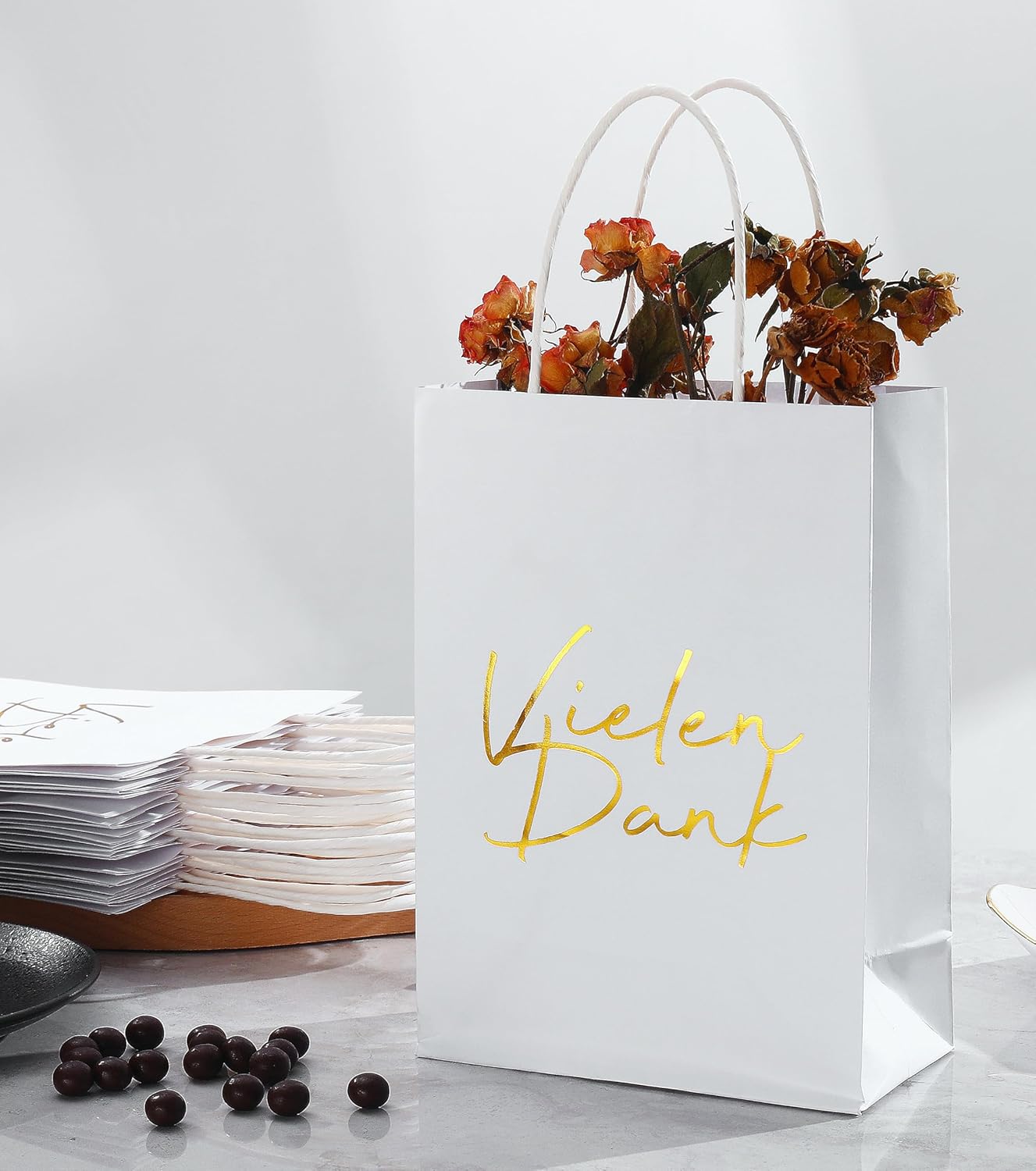 Contenuto della confezione: Di' "Grazie" in un modo molto speciale con il nostro set di 20 sacchetti regalo con manici. Materiale: i sacchetti sono realizzati in robusta carta kraft da 130 g/m², piacevole al tatto. Sui sacchetti regalo è stampata la scritta "Grazie" in rilievo color oro. Le borse sono molto stabili e riutilizzabili. Dimensioni: Le borse hanno una dimensione di 21 x 15 x 8 cm. Utilizzo: questo set è adatto per Natale, compleanni, feste aziendali e tante altre occasioni. Puoi usarlo sia in ambienti privati che aziendali.