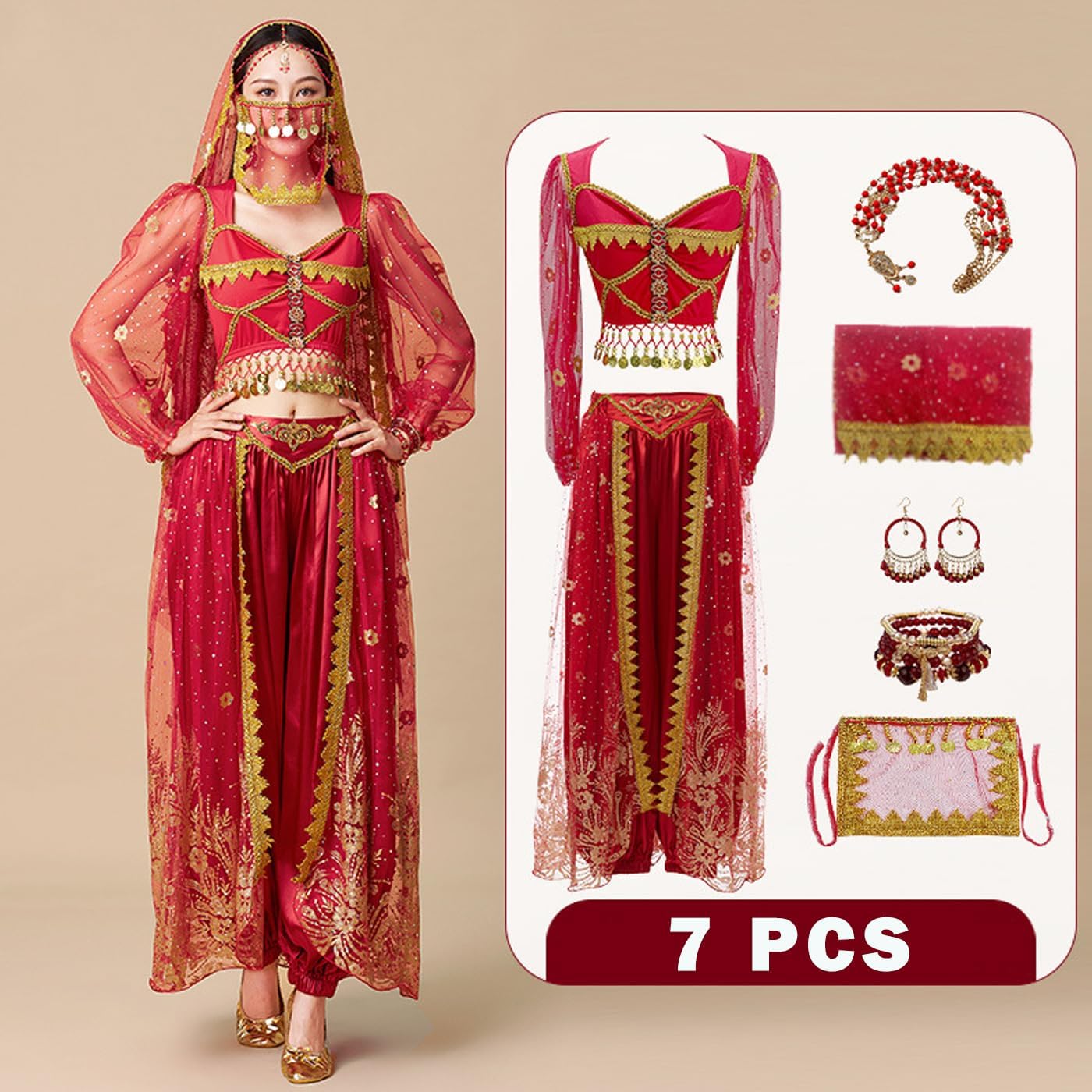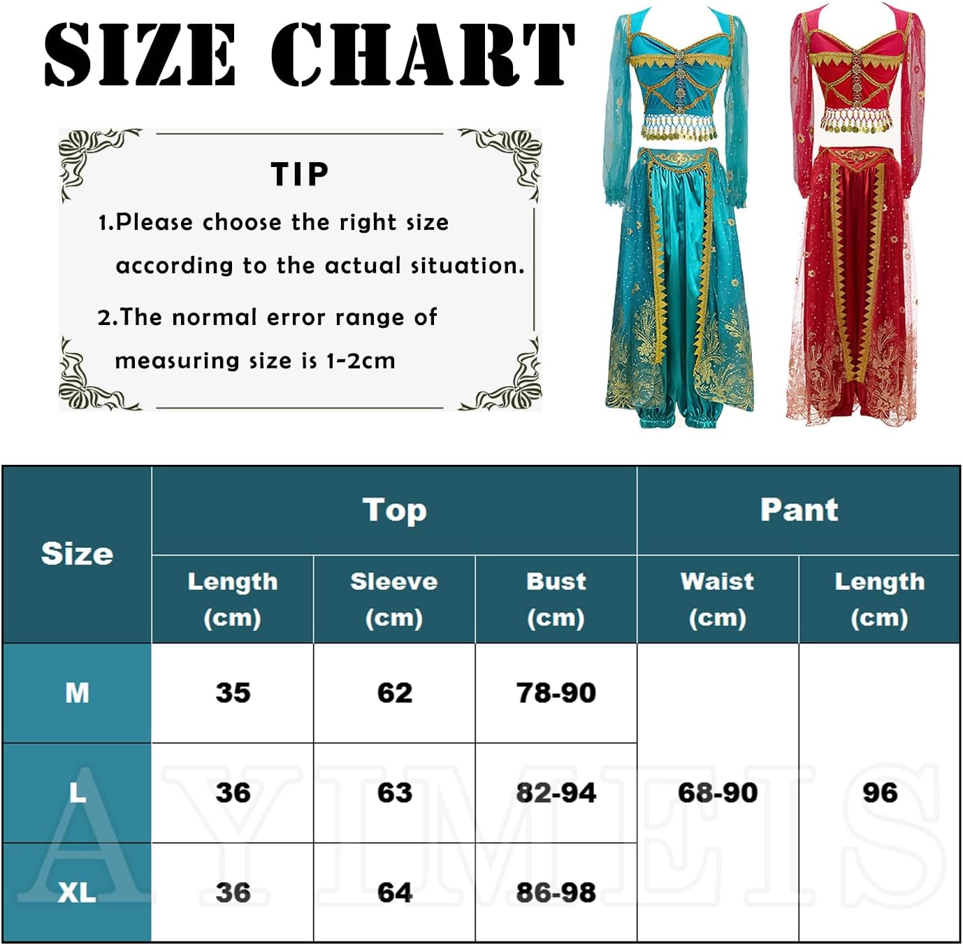 【Il pacchetto include:】- Top *1, Pantaloni *1, Copricapo *1, Accessori per capelli *1, Orecchini *2, Bracciale *1, Velo *1 (come mostra l'immagine). 【Materiale principale】- Poliestere. Realizzato in materiale di alta qualità, morbido, comodo da indossare e abbastanza resistente. 【Caratteristiche dell'abbigliamento】- Costume Cosplay Principessa Jasmine con costumi esotici. Disegni ispirati alle immagini dei personaggi animati con splendidi accessori per un facile gioco di ruolo. Indossatelo e vi distinguerete tra la folla. 【Ampia applicazione】- Perfetto per feste a tema, Festival, Natale, Halloween, Carnevali, Danza latina, Danza del ventre, Performance sul palco, Fotografia, Comic Con, Cosplay, ecc. 【Riferimento taglia】- Per assicurarti di ottenere una taglia adatta a te, fare riferimento alla nostra tabella delle taglie prima dell'acquisto (ultima foto).
