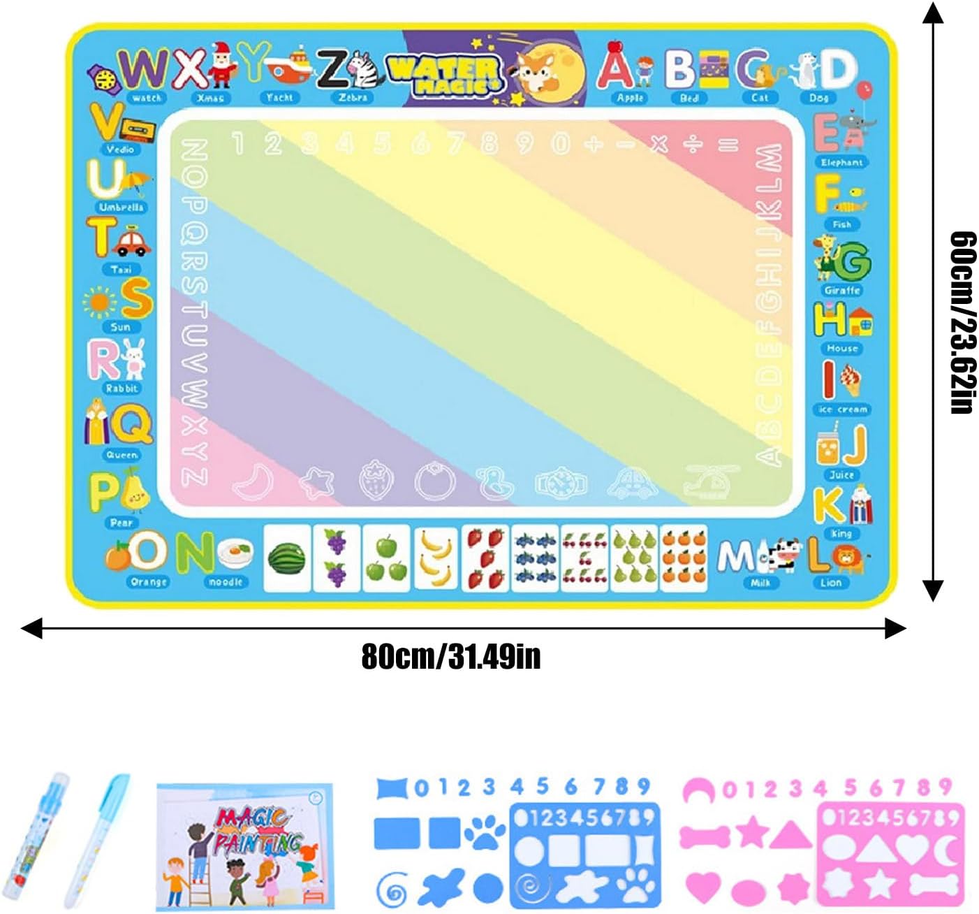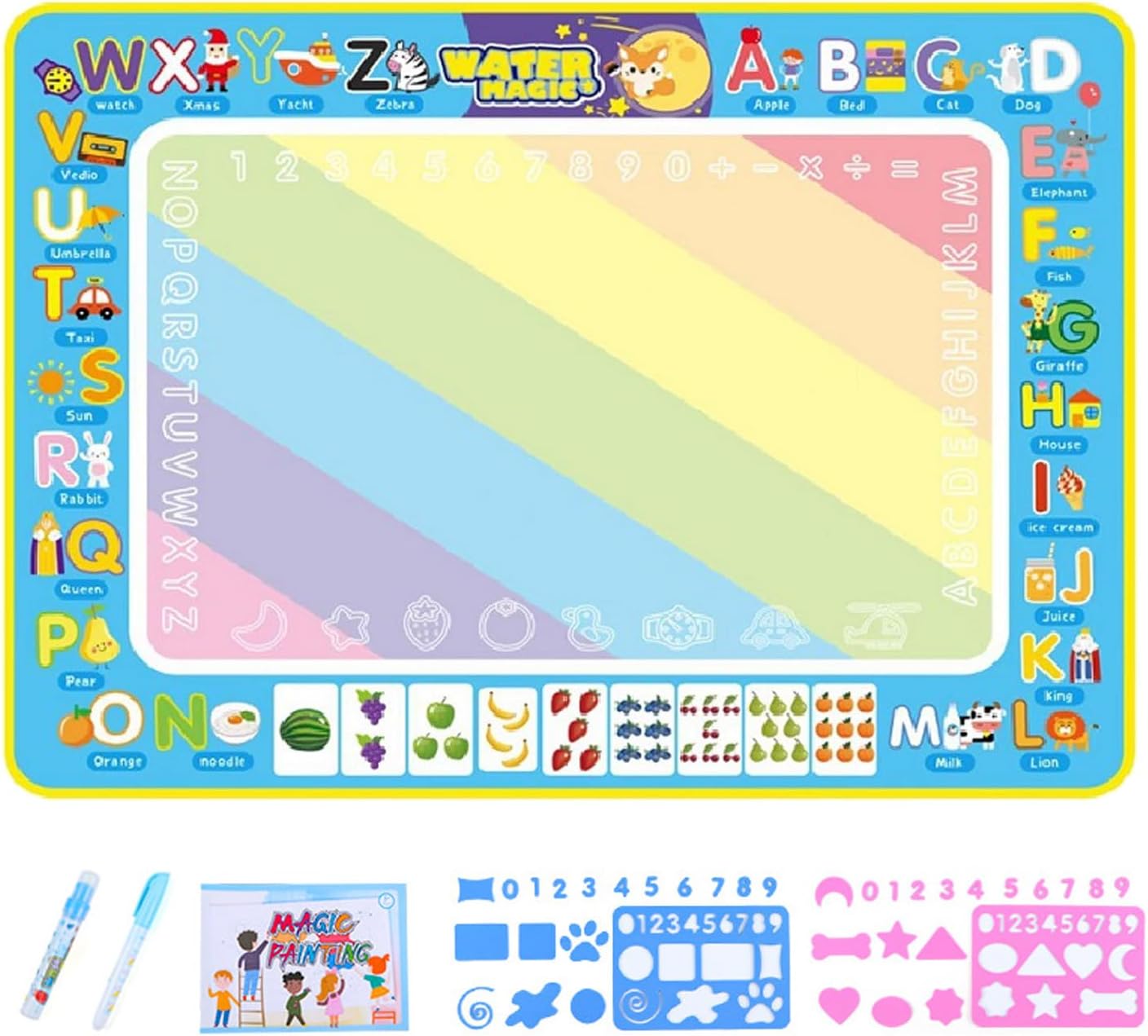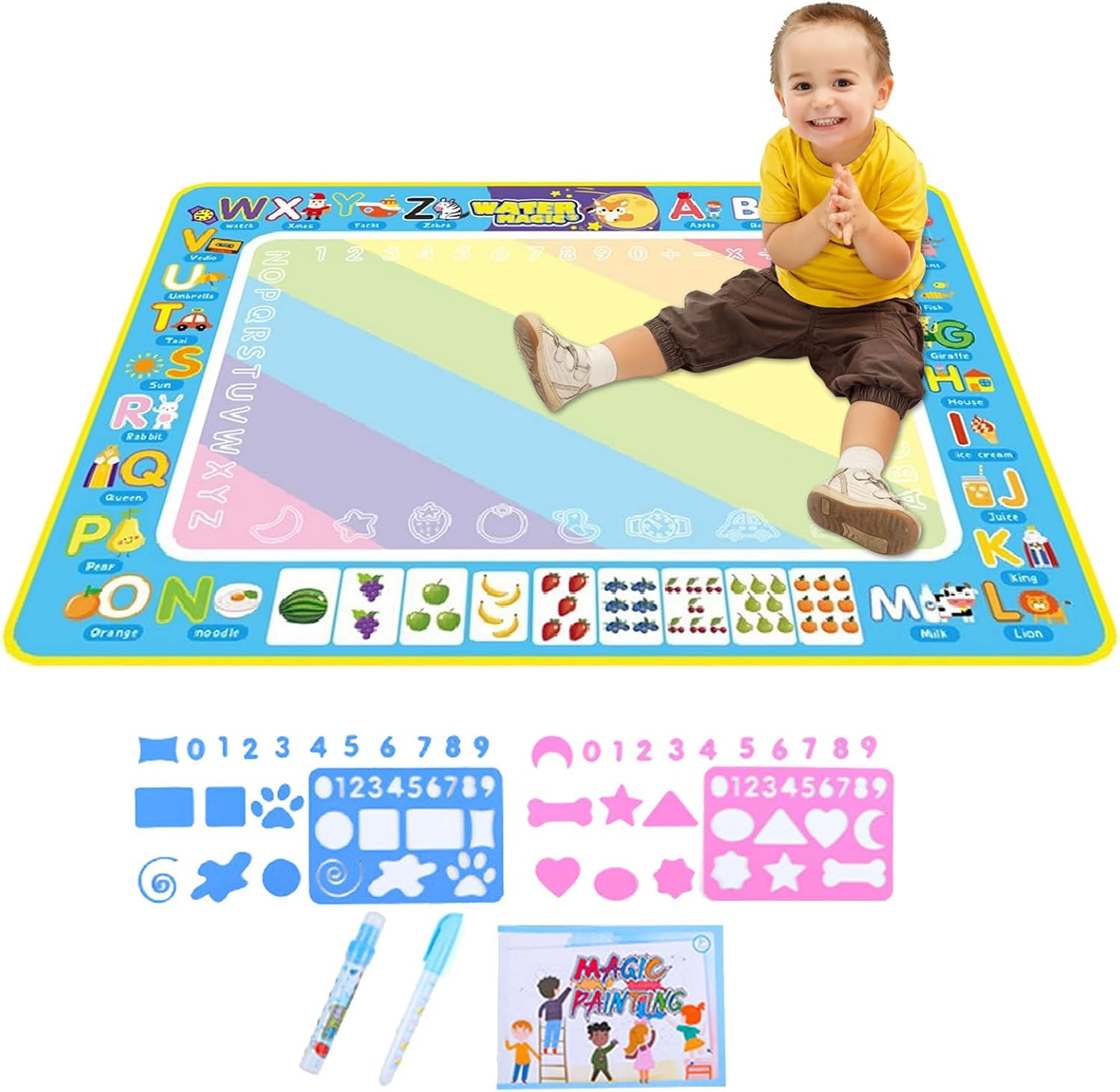 Doodling senza pasticcio: incoraggia il lato artistico di tuo figlio con questo tappetino da scarabocchi d'acqua. Adoderanno scarabocchiare, disegnare e dipingere con acqua e penne di fascino senza pasticcio. Questo è un modo colorato per mantenere pulite le superfici e un'attività preferita per i bambini di qualsiasi età. Uso ripetuto: il nostro tappetino per scarabocchi d'acqua fornisce divertimento senza casi per i bambini. Usando solo acqua pulita, possono attingere ai cuscinetti riutilizzabili per una maggiore creatività. Dopo 5-10 minuti, i disegni scompaiono automaticamente, rendendolo senza problemi. Non sono necessarie vernici o penne, riempi semplicemente i pennarelli con acqua di rubinetto. Usa semplicemente: stimola la creatività di tuo figlio con il nostro tappetino da scarabocchi d'acqua. Questo set completo include cuscinetti d'acqua reali, 2 penne speciali, francobolli, stencil e un rullo di stampa super cool: tutto ciò di cui hanno bisogno per far brillare le loro abilità artistiche. Convenientemente creativo: tieni il tuo bambino impegnato alle corse in auto con il nostro tappetino da scarabocchi d'acqua. Offrendo un grande spazio da 80x60 cm, possono disegnare più immagini con penne d'acqua. Soprattutto: non sono necessari carta o inchiostro. Grandi idee regalo: equipaggia tuo figlio con il tappetino da per incoraggiare la creatività e la conoscenza. Nessun disordine, solo divertente. È ideale per tutte le età come regalo memorabile e per un compleanno o Natale.