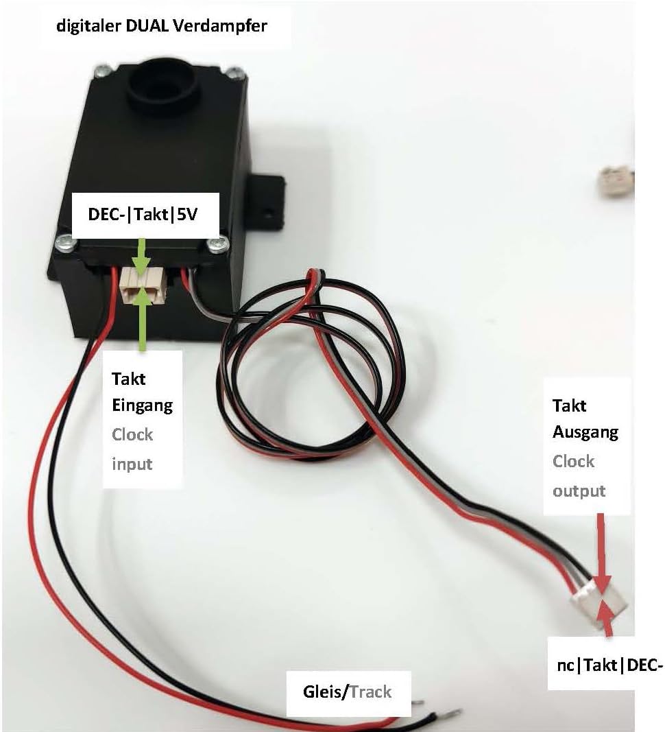 UNITÀ DI VAPORE CONTROLLATE SEPARATAMENTE: Consente la simulazione precisa del vapore del camino e del cilindro per effetti autentici di vapore e diesel. MODALITÀ OPERATIVE VERSATILI E COMPATIBILITÀ: supporta le modalità operative DC, AC e DCC ed è conforme NMRA-DCC, consentendo un'ampia applicabilità in vari sistemi. DECODER DIGITALE INTEGRATO PER UN CONTROLLO PRECISO: consente un controllo preciso dell'emissione di vapore per effetti realistici. GRANDE SERBATOIO PER FUNZIONAMENTO ENDURANCE: Con una capacità di 12 ml per consentire lunghe sessioni di guida senza interruzioni. IDEALE PER SCENARI DI TRENO MODELLISMO REALISTICI: migliora l'aspetto delle locomotive in qualsiasi layout ferroviario in miniatura aggiungendo realismo.