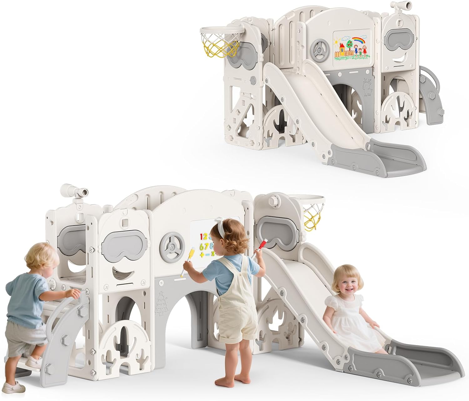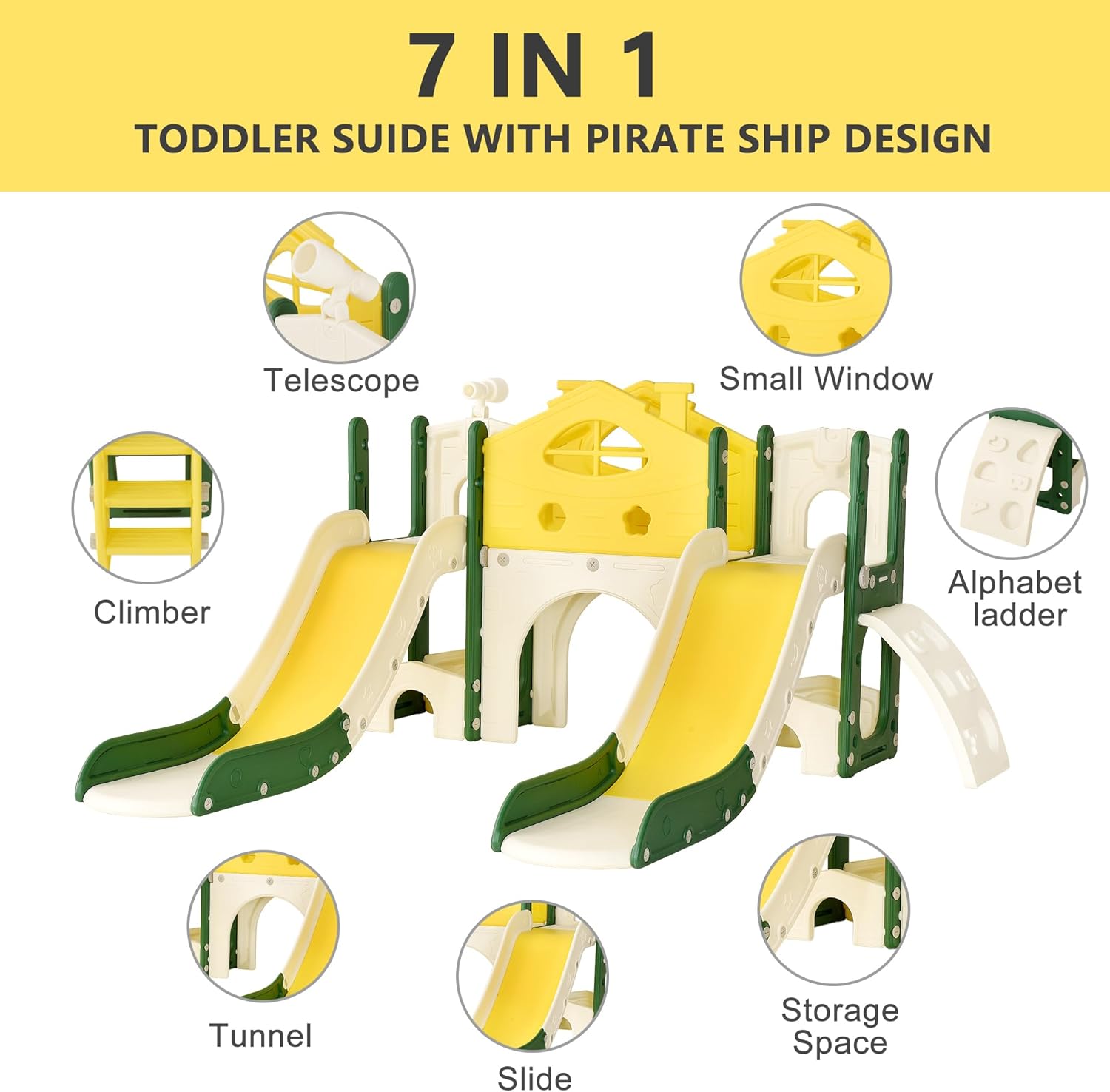 Design di sicurezza: ci sono tre strati di scala con texture che possono garantire la sicurezza dei bambini, perché sono facili da montare e non lasciano scivolare i tuoi bambini. Nella parte inferiore dello scivolo una parte allungata è progettata come zona cuscinetto che può ridurre efficacemente la velocità di scorrimento e supportare in modo ottimale la colonna vertebrale e i fianchi del bambino. Kit da gioco 7 in 1 per bambini: offre ai bambini un parco giochi 7 in 1 che include uno scivolo liscio, una scala da arrampicata, un telaio da arrampicata ABC, un mini tunnel e uno spazio di archiviazione. Promuove la creatività dei piccoli offrendo loro diverse possibilità di gioco ed esplorazione. Alta qualità: questo parco giochi è realizzato in materiale HDPE di alta qualità, inodore, durevole e certificato per la sicurezza. Le superfici lisce e i bordi arrotondati prevengono lesioni. Per una maggiore stabilità, il fondo può essere riempito d'acqua. Design accattivante e stimolante: con forme e colori vivaci, questo scivolo cattura l'attenzione dei bambini e li invita a esplorare un mondo in miniatura. Questo quadro giocoso favorisce l'immaginazione e la curiosità e contribuisce al loro sviluppo emotivo e cognitivo. Facile da montare e da pulire: non sono necessari altri strumenti, una persona può completare il montaggio in 20 minuti. Lo scivolo per bambini è rinforzato con dadi dentati per evitare l'allentamento.