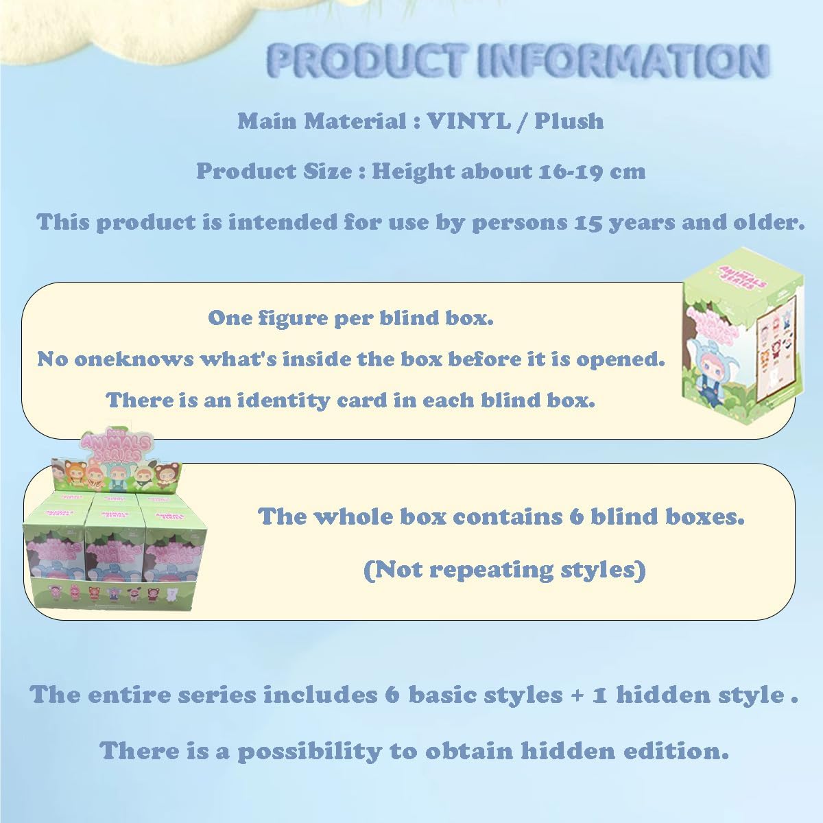 Design casuale: ogni borsa è disposta in modo casuale. È possibile ottenere l'output nascosto in ogni singola scatola con una probabilità di 1/72. Quindi, se lo ottieni, congratulazioni, sei molto fortunato! Regalo perfetto: regalo a sorpresa per gli amici per compleanno, Natale, Halloween, San Valentino e molto altro ancora. Da mostrare in casa, per feste, accessori da scrivania o all'interno dell'auto. I personaggi sono carini e un regalo giocattolo da collezione. Un'opera d'arte che esprime sentimenti ed emozioni. Nome del prodotto: i giocattoli DORA ANIMALS serie Blind Box sono oggetti da collezione che vengono forniti in una scatola sigillata, con il contenuto sconosciuto agli acquirenti fino a quando non li apre. Questa collezione di serie include 6 personaggi regolari e 1 edizione nascosta (Dreaming). Materiale: materiale vinilico/peluche atossico, innocuo e inodore. I simpatici personaggi Lucky Box giocattoli colori dei personaggi sono vivaci e non facili da sbiadire. La superficie è liscia e di alta qualità. Cute Size Toys: l'altezza di ogni personaggio è compresa tra 16 cm e 19 cm. Misuriamo manualmente la dimensione. Lievi variazioni sono considerate normali.