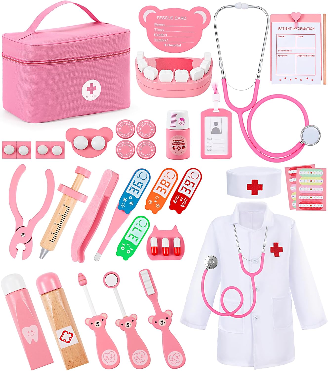 Interagendo con questo kit medico per bambini, i bambini possono apprendere nozioni mediche, il corpo umano attraverso il gioco di ruolo medico/paziente. questo costume da dottore è atossico e assolutamente sicuro.
