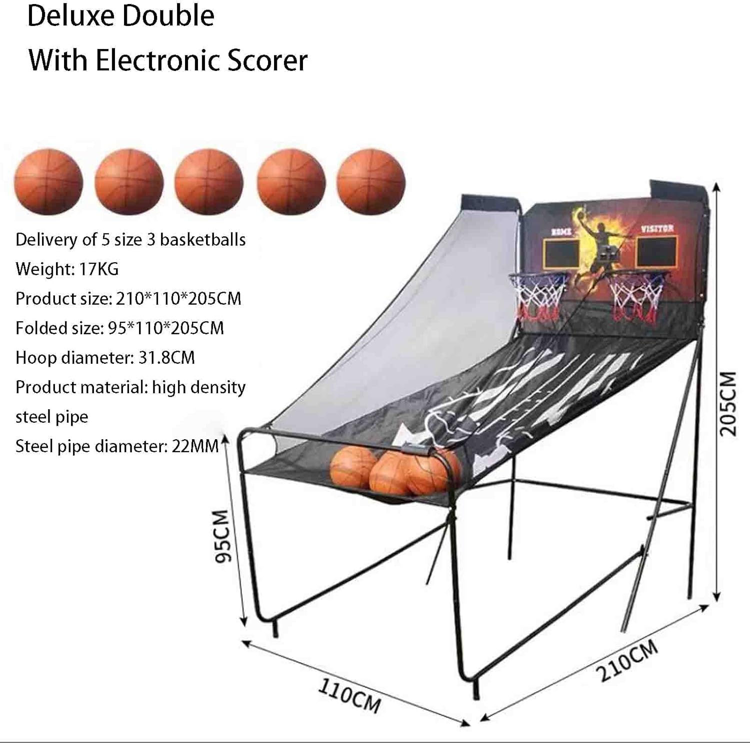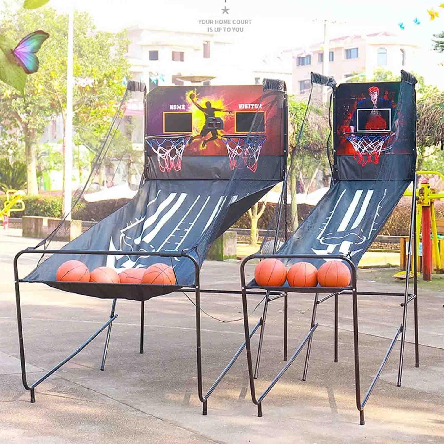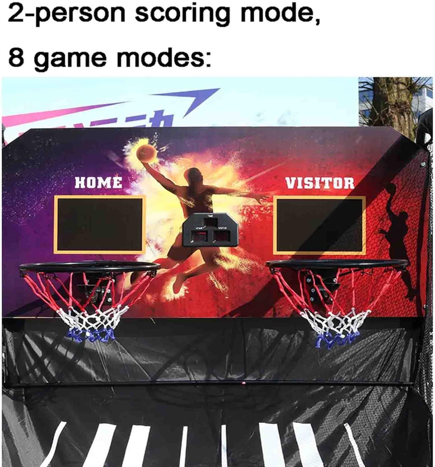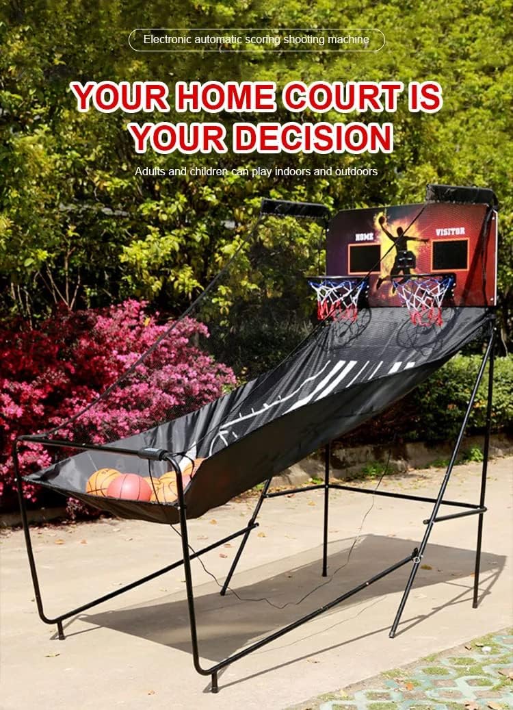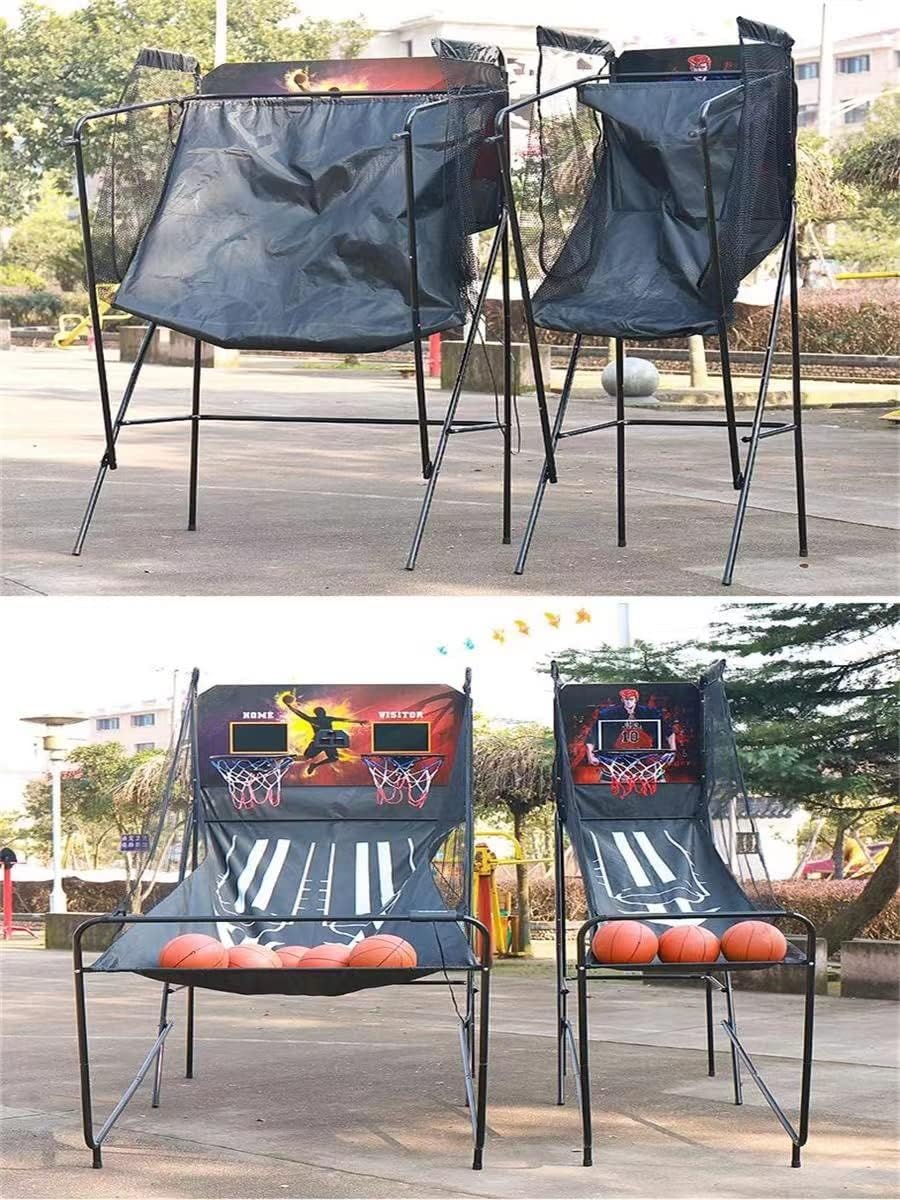 Facilmente pieghevole per l'uso in ambienti interni, risparmiando spazio 2. Sicuro: base rinforzata con gommini antiscivolo per un supporto stabile 3. Automatizzato: dispone di un marcatore automatico per il punteggio personalizzabile 4. User-Friendly: Controllo frontale per regolazioni facili e veloci senza la necessità di regolazioni posteriori Double ElectronicBasketball Arcade Game con 4 palloni da basket - Pallacanestro indoor per casa con 8 modalità di gioco