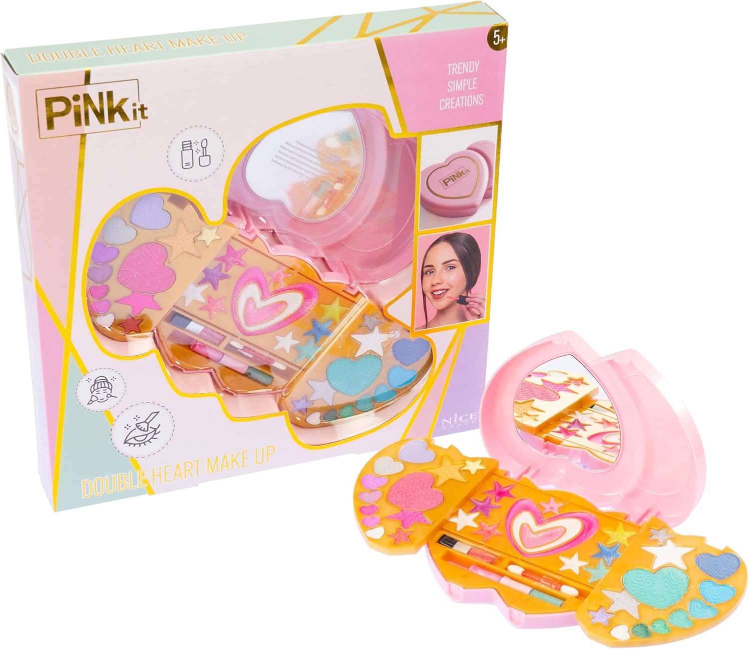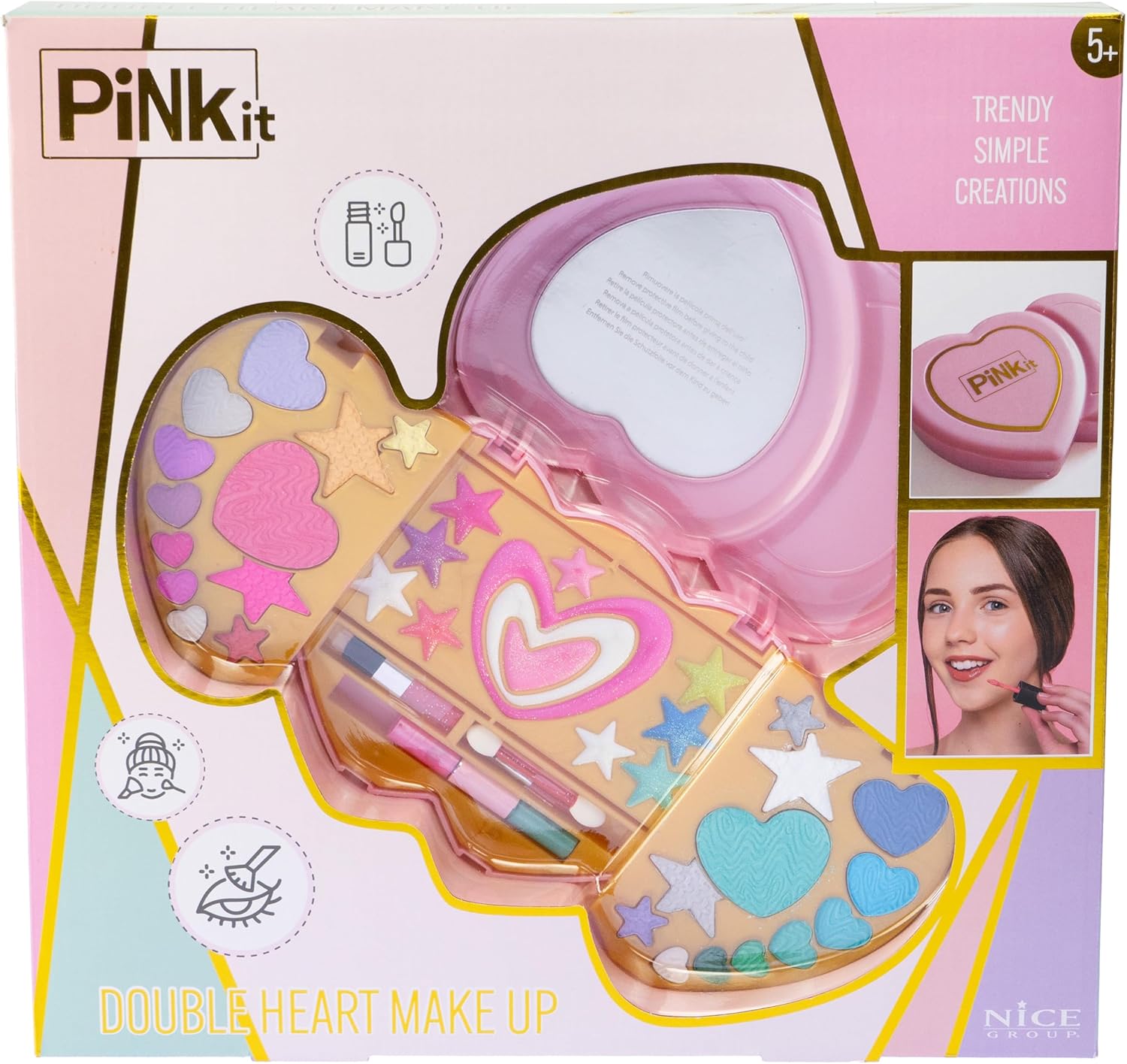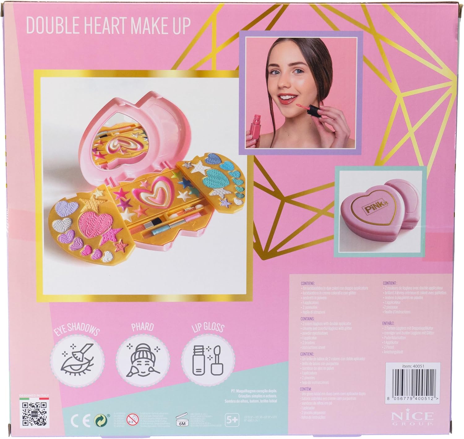 PINK IT MAKE UP HEART: È un set trucco con ombretto, fard, lucidalabbra e applicatori. Il contenitore esterno ha la forma di cuore. Caratteristiche: La trousse è dotata di 2 vaschette pratiche e facili da usare che moltiplicano il contenuto, come i set cosmetici delle maggiori maison. All'interno c'è anche uno specchio. Utilizzo: i bambini possono imparare a creare un look chic e sofisticato combinando insieme i colori. I cosmetici sono testati e sicuri e possono essere rimossi con acqua e/o latte detergente. Senza parabeni. Dimensioni: 36 x 35 x 5 cm. Prodotto originale PINK IT di Nice Group. Età consigliata: 6+