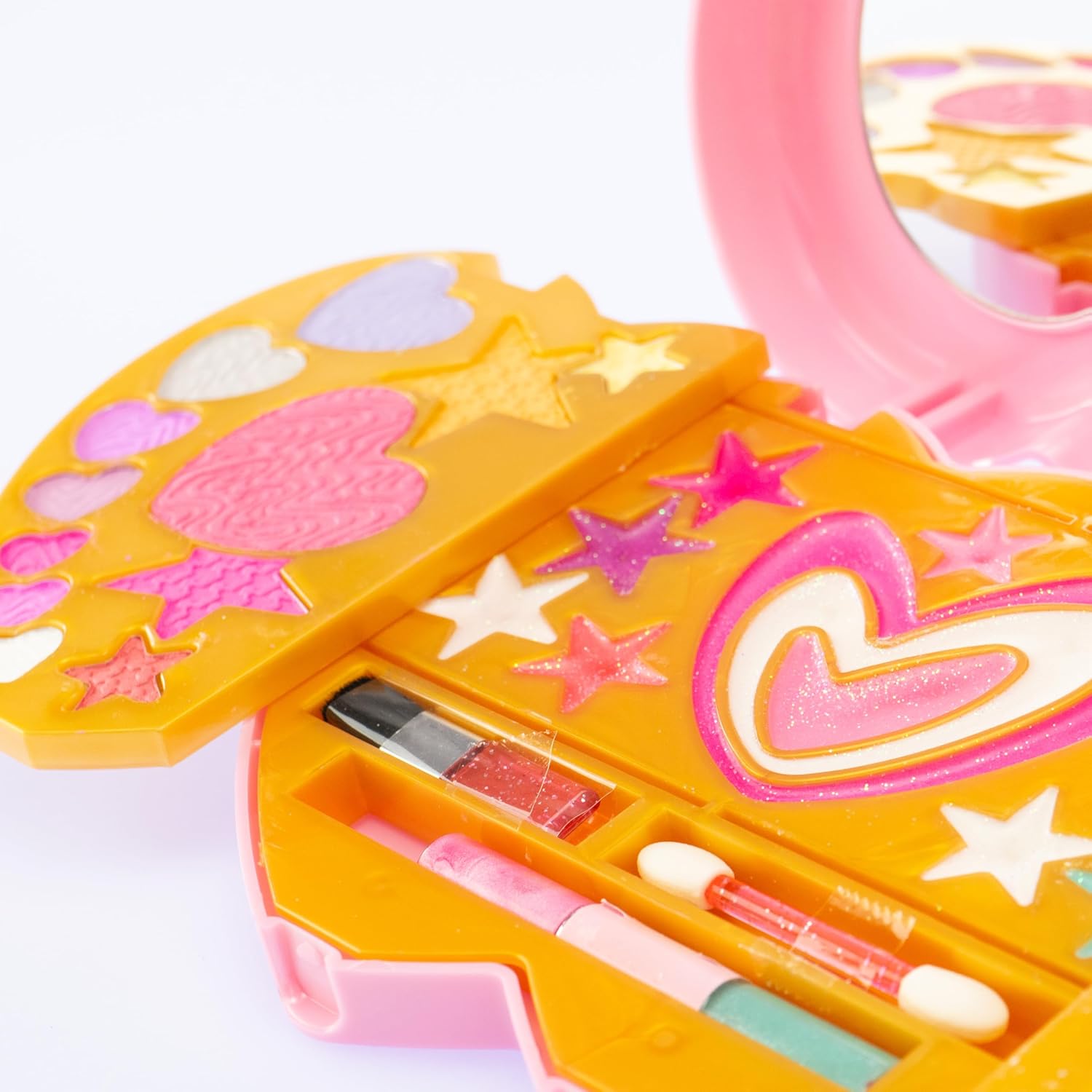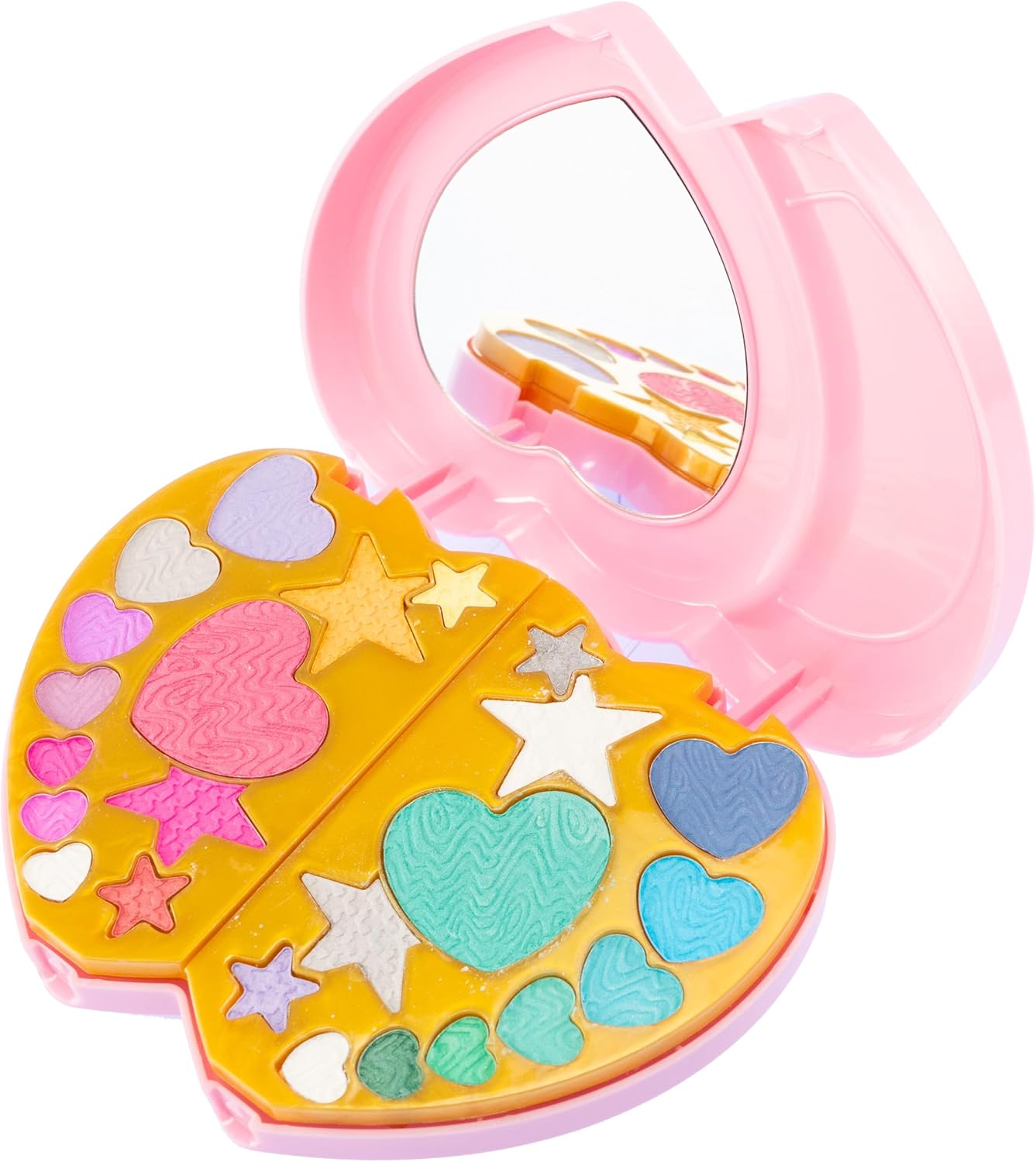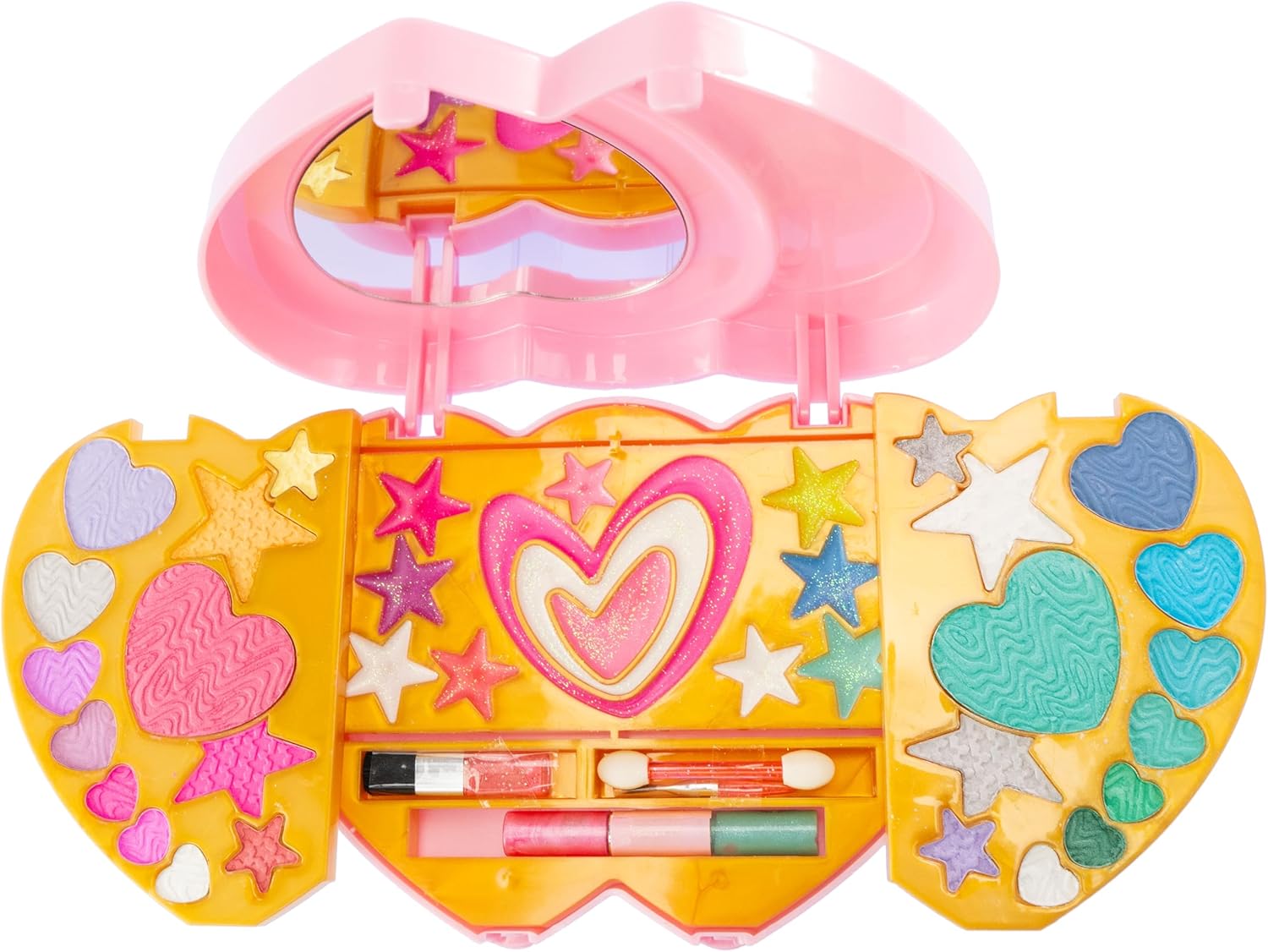 PINK IT MAKE UP HEART: È un set trucco con ombretto, fard, lucidalabbra e applicatori. Il contenitore esterno ha la forma di cuore. Caratteristiche: La trousse è dotata di 2 vaschette pratiche e facili da usare che moltiplicano il contenuto, come i set cosmetici delle maggiori maison. All'interno c'è anche uno specchio. Utilizzo: i bambini possono imparare a creare un look chic e sofisticato combinando insieme i colori. I cosmetici sono testati e sicuri e possono essere rimossi con acqua e/o latte detergente. Senza parabeni. Dimensioni: 36 x 35 x 5 cm. Prodotto originale PINK IT di Nice Group. Età consigliata: 6+