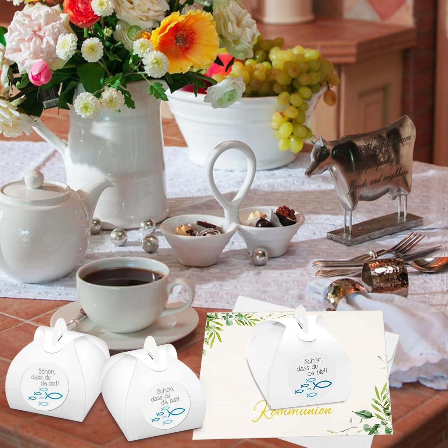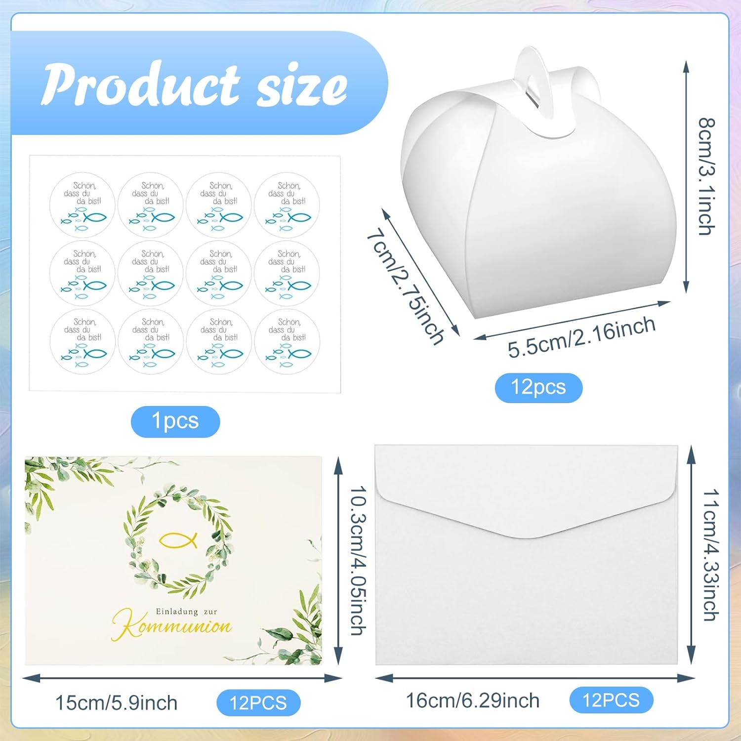 Inviti per comunione: riceverete un set perfetto di inviti per la comunione, la confezione contiene 12 biglietti d'invito piegati, 12 buste, 12 scatole regalo e 12 adesivi. Questi inviti per la comunione sono abbastanza grandi da invitare i tuoi ospiti a una festa di comunione, un perfetto invito per la comunione. Materiale di qualità: i biglietti d'invito per comunione sono realizzati in carta resistente e di alta qualità, la speciale tecnica di stampa rende i biglietti d'invito con elementi eucaristici più attraenti, gli amici saranno più entusiasti della festa della comunione. Superficie di scrittura sufficiente: la pagina di scrittura del biglietto d'invito per comunione è completamente vuota e offre molto spazio per tutte le informazioni importanti che possono essere scritte o stampate con una penna. Niente loghi o codici a barre antiestetici, l'interno del biglietto pieghevole è completamente vuoto! Design unico: la superficie del biglietto d'invito per comunione è progettata con elementi classici per la comunione, il design combinato di Cristo pesce e croce rende il biglietto d'invito per comunione vivace e vivace, creando un'atmosfera per l'intensa festa della comunione. Utilizzo: questo biglietto d'invito per comunione ha un bel motivo che piacerà sia ai ragazzi che alle ragazze. Perfetto per cresima, battesimo, comunione o celebrazioni in chiesa. Se stai preparando una significativa cerimonia di battesimo comunione, questi biglietti d'invito per comunione saranno perfetti per te.