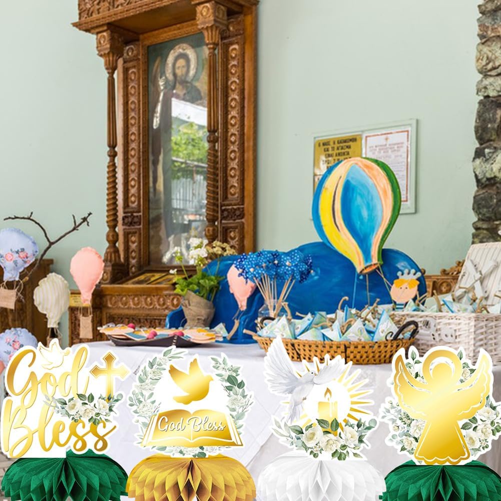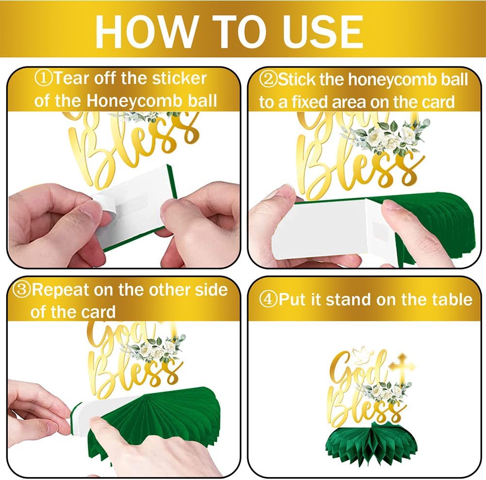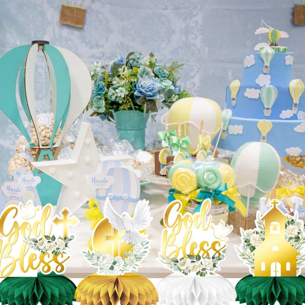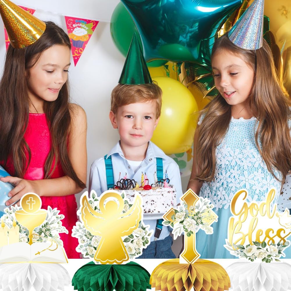 Baby Shower: stile dal design fresco e naturale, semplice motivo da comunione con oro e verde, ha una bellezza infantile e semplice Materiale: questo centrotavola è fatto di carta, spesso e resistente, è la scelta ideale per pacchetti per feste, compleanni, bevande e dessert Ampiamente usato: il nostro centrotavola può essere utilizzato per molte occasioni, come feste di compleanno, feste a tema, carnevali, Natale, Pasqua, Halloween, anniversari, riunioni di famiglia, picnic e così via Meravigliosa festa di compleanno: il delizioso set di decorazioni di compleanno metterà in risalto la tua festa magnificamente, perfetto da posizionare torte, cupcakes, biscotti, frutta, ecc. Usa le decorazioni per la festa di compleanno per rallegrare il luogo della festa e rendere la tua festa ancora più impressionante Facile da assemblare: per prima cosa devi strappare l'adesivo con la pallina a nido d'ape, quindi posizionare la pallina a nido d'ape sulla superficie fissa del biglietto e mettere un'altra pallina a nido d'ape sull'altro lato del biglietto, infine l'assemblaggio di un centrotavola a nido d'ape di compleanno con un'adorabile comunione è completato