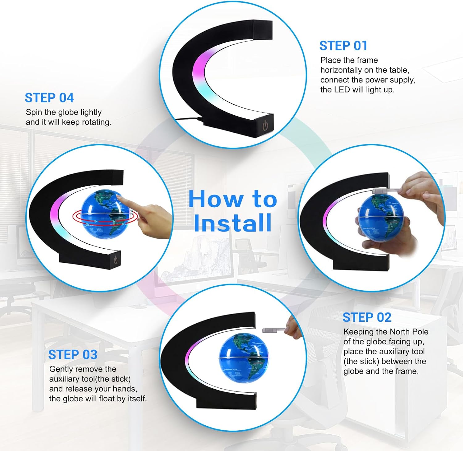 UN MONDO DI PACE - Una volta che galleggia a mezz'aria, provate a far girare delicatamente il globo, la rotazione di 360 gradi durerà circa 15-25 minuti. Lasciate da parte il telefono e lasciate che questo piccolo mondo galleggiante vi porti un momento di pace. FACILE DA INSTALLARE - Il nostro mappamondo galleggiante funziona con un sistema a magnete controllato elettronicamente. Il suo design è facile da installare rispetto ad altri sistemi di levitazione. Bastano pochi secondi e il mondo galleggiante apparirà davanti a voi. ALTA TECNOLOGIA - I nostri globi a levitazione sono prodotti di alta tecnologia, godrete dello stile speciale e amplierete la vostra visione del mondo. È una decorazione elegante perfetta per tutti gli spazi come casa, ufficio, scuola, negozio o sala riunioni. QUALITÀ PREMIUM - Realizzato in materiale ABS di alta qualità e con una superficie resistente ai graffi, il nostro mappamondo è resistente e di lunga durata. Il sistema elettronico di controllo del magnete e il telaio adottano una tecnologia di trasmissione ad alta precisione, il testo e la grafica sul globo sono chiari, durevoli e non facili da sbiadire. REGALO MERAVIGLIOSO - Tutti saranno sorpresi da questo meraviglioso mappamondo. è un regalo perfetto ed elegante per tutte le occasioni, che lo rende un ottimo spunto di conversazione. Come un'opera d'arte, questo globo a levitazione magnetica non è solo una bella decorazione, ma anche un fantastico strumento educativo per bambini e adulti. Può essere collocato a casa, in ufficio, in classe o in uno spazio creativo e attraente.