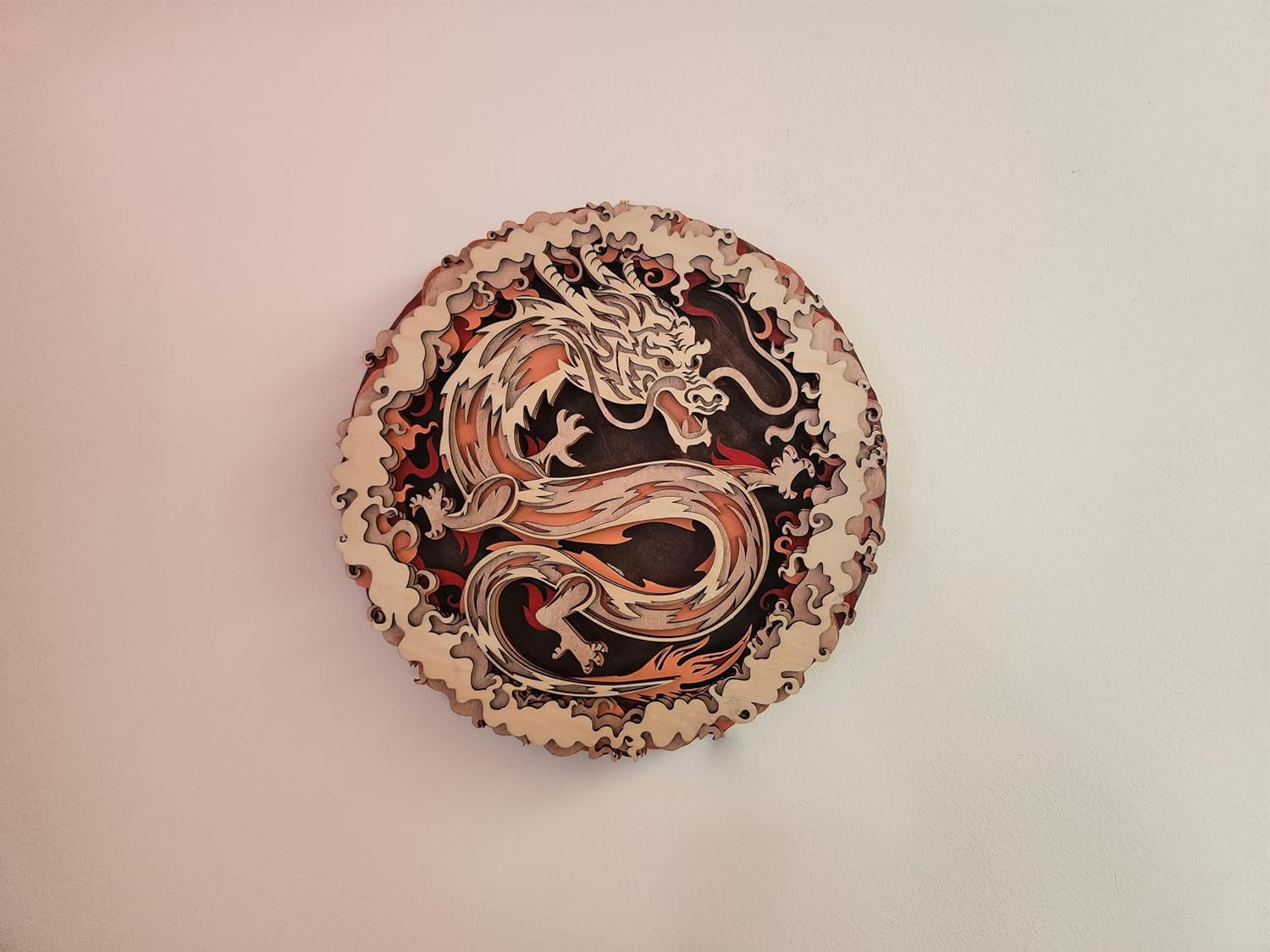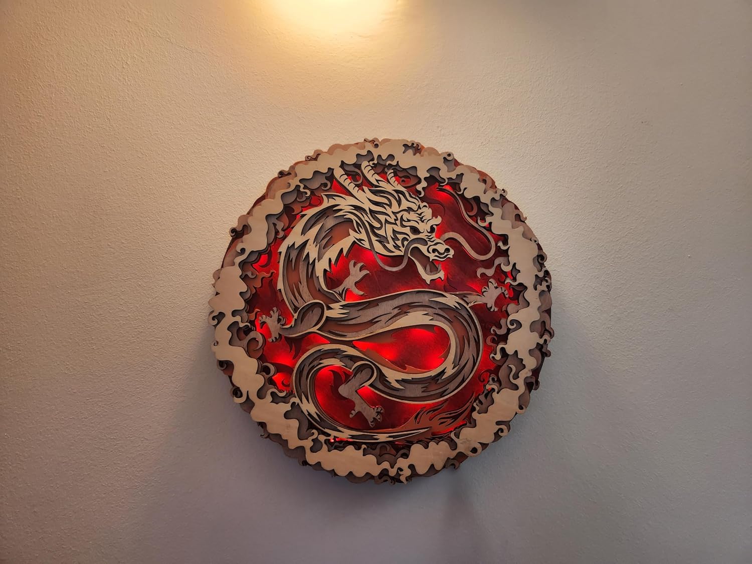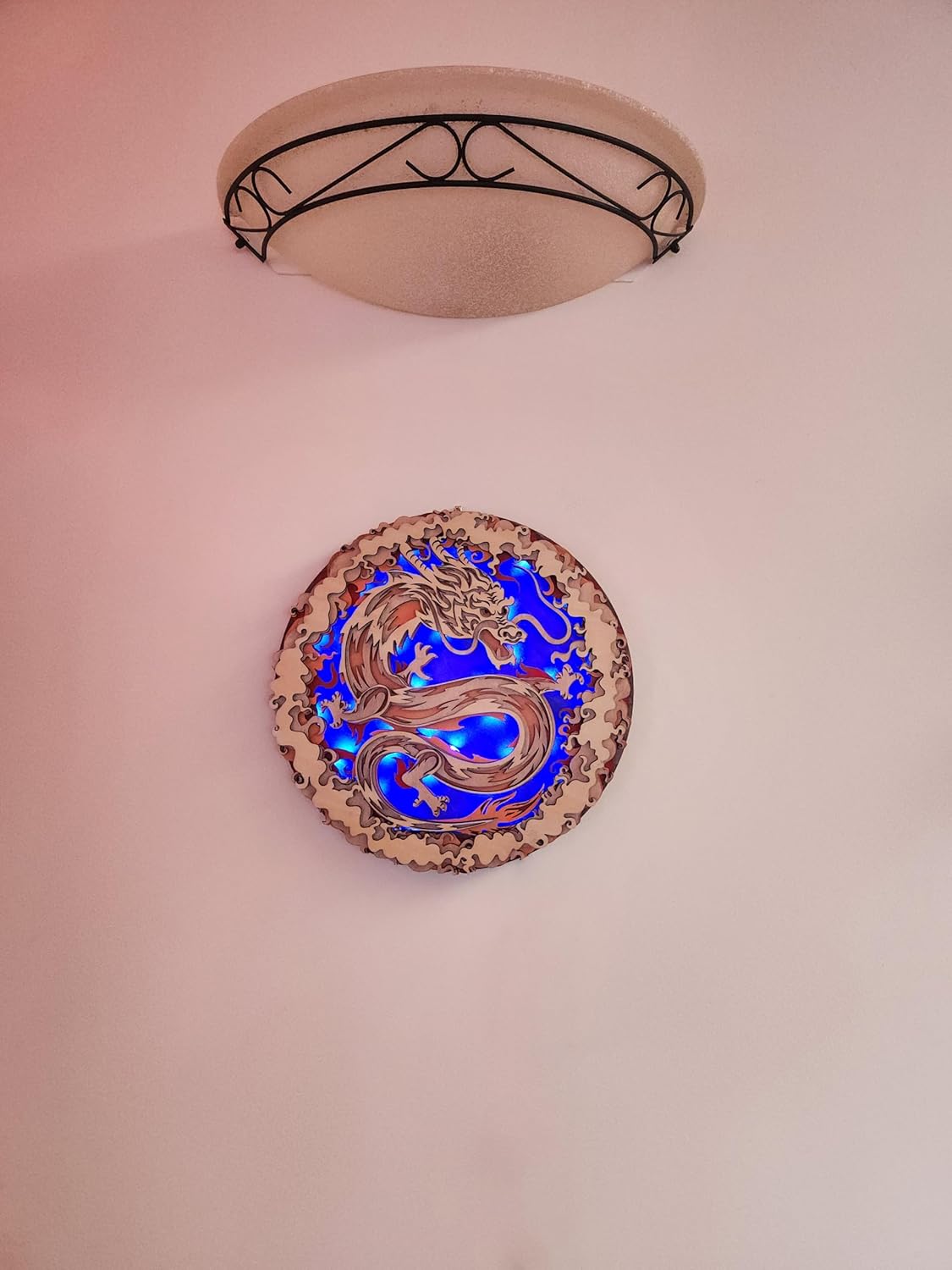Design mistico del drago cinese: celebra la mitologia cinese con un'opera d'arte mandala raffigurante "Loong", il leggendario drago cinese, che simboleggia potere e buon auspicio. Squisita fattura e dettaglio: intagliato al laser da più strati di legno, ognuno aggiunge profondità e complessità, con bordi leggermente bruciati per un aspetto autentico e antico. Omaggio culturale e simbolismo: più che un semplice arredamento, questo pezzo rende omaggio al significato mitologico e culturale duraturo del drago nel patrimonio cinese. Illuminazione a LED interattiva: Dotato di illuminazione a LED multicolore, controllabile da remoto o app, trasformando il mandala in un display artistico dinamico e coinvolgente. Opera d'arte esclusiva e personalizzata: ogni mandala è numerato in modo univoco, indicando il mese e l'anno di incisione, rendendolo un oggetto da collezione distintivo. Kit di illuminazione completo incluso: viene fornito con un versatile caricatore USB multi-porta, adattatore multi-paese e un cavo di prolunga da 2 metri, che garantiscono un utilizzo facile e adattabile in qualsiasi ambiente.